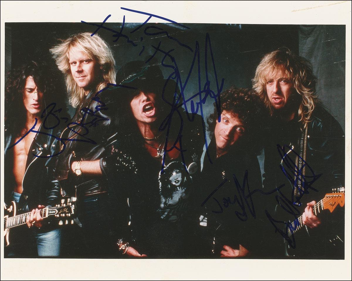 Color glossy 10 x 8 group photo, signed in blue felt tip by Steven Tyler, Joe Perry, Brad Whitford, Tom Hamilton, and Joey Kramer. Some creasing to top portion, some mild contrast to portions of a couple of signatures, and a bit of scattered light soiling, otherwise fine condition. Pre-certified Roger Epperson/REAL and RRAuction COA.