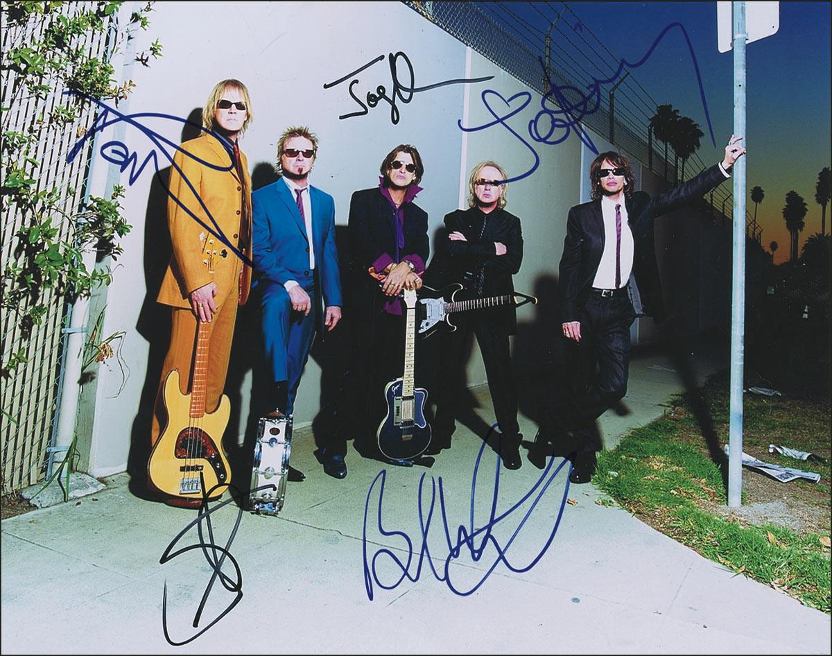 Color glossy 14 x 11 group photo of the neatly attired band, signed in blue and black felt tip by Steven Tyler, Tom Hamilton, Brad Whitford, Joe Perry, and Joey Kramer. In fine condition. Pre-certified Roger Epperson/REAL and RRAuction COA.