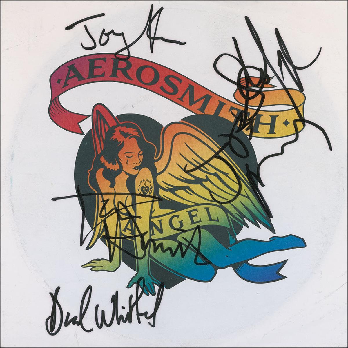 45 rpm record sleeve for Angel, signed in black felt tip by Steven Tyler, Joe Perry, Brad Whitford, Tom Hamilton, and Joey Kramer. In fine condition. The record is included.