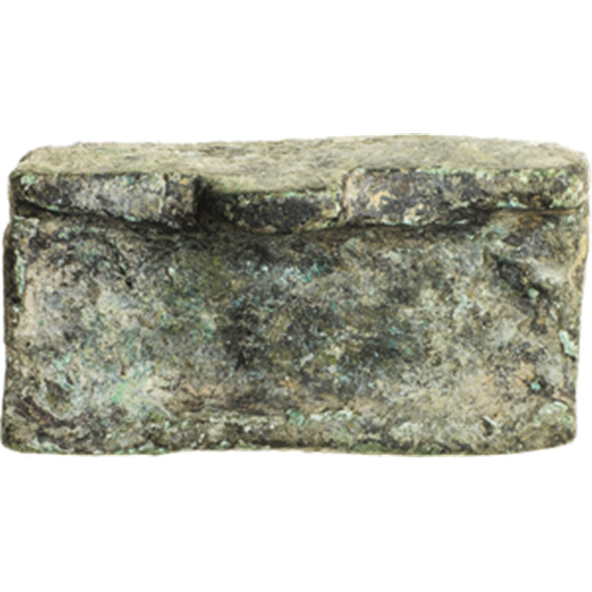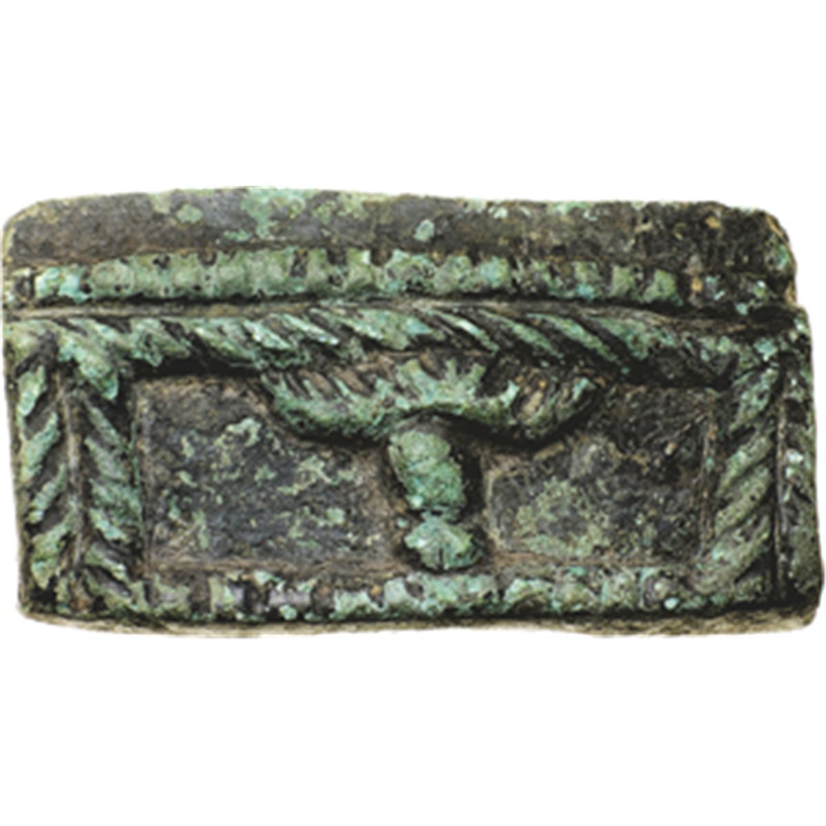 Repubblica Romana. Aes signatum. Formella rettangolare, III secolo a.C. AE. g. 79.30 RRR. I 'pudenda virilia' entro doppia cornice rettangolare a cordone. Dimensioni: 48x25x15mm. SPL. Una rappresentazione naif e nel contempo realistica dei genitali maschili di affascinante modernitv†, lontana dagli stereotipi itifallici onnipresenti, quali emblemi della fertilitv†, nella cultura figurativa e nell'oggettistica quotidiana del mondo romano antico. Di peso pari ad un quadrante della serie Dioscuri/Mercurio. Di grande bellezza. Rarissima ed apparentemente inedita. Attraente patina verde e nera.