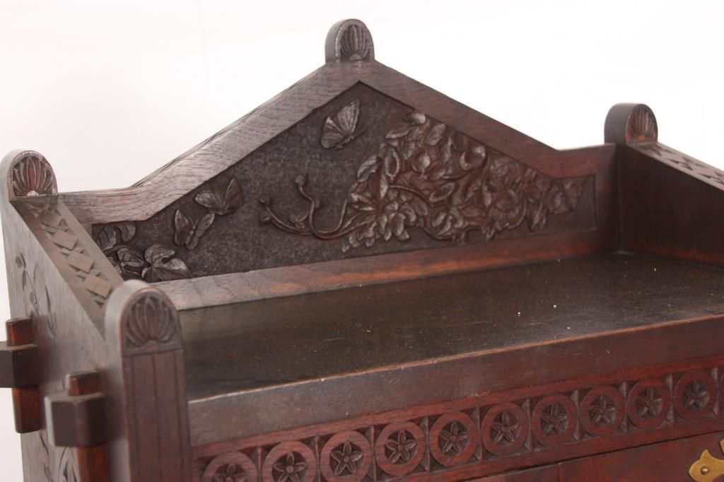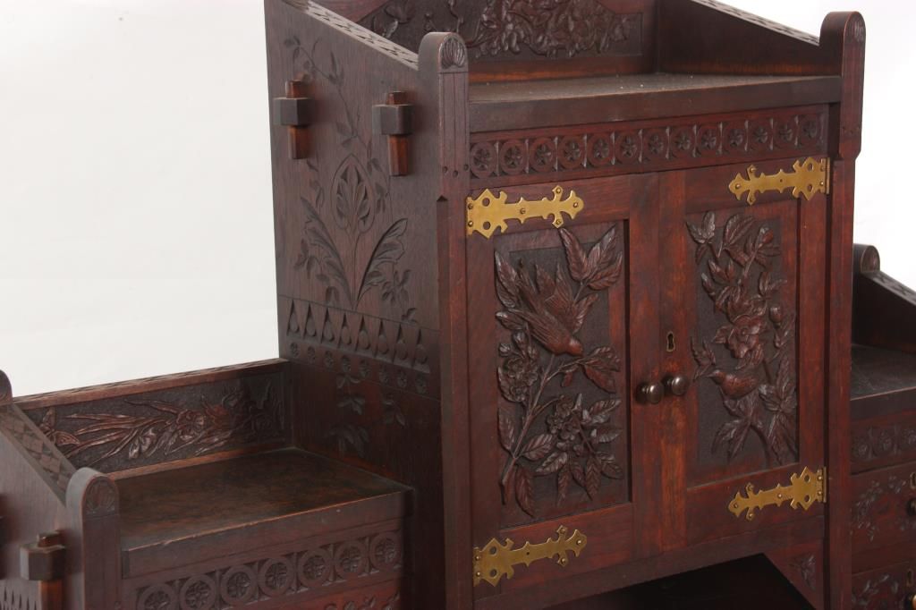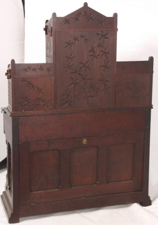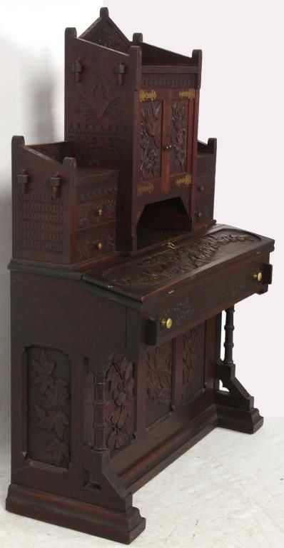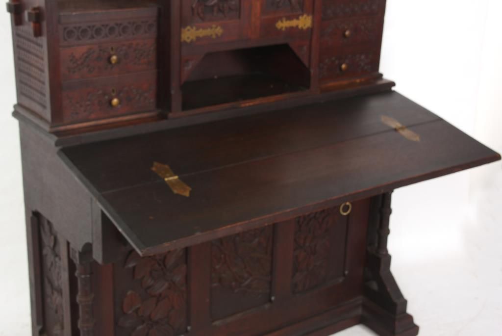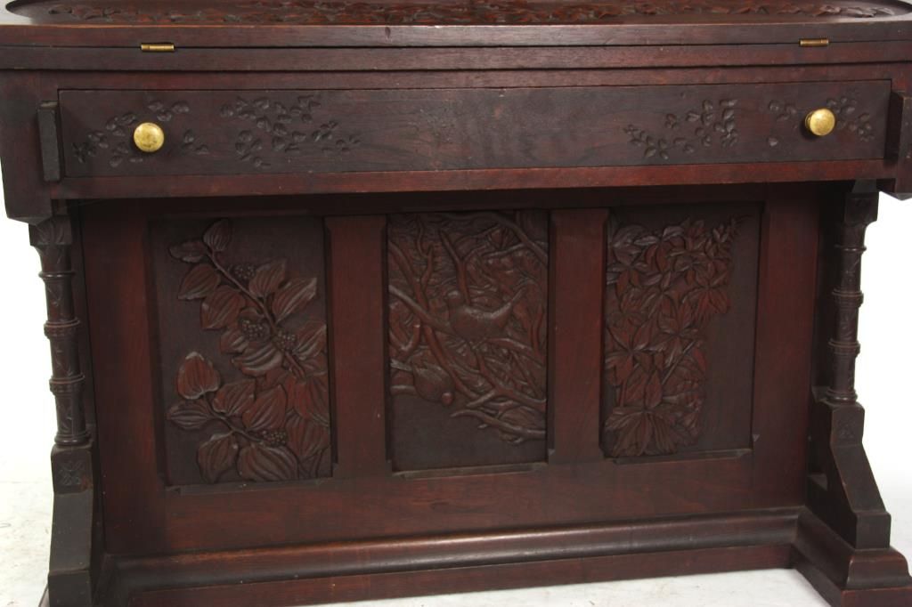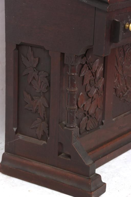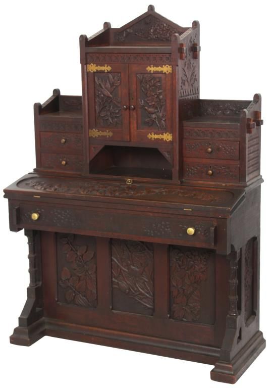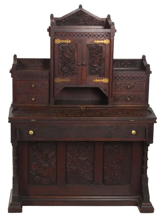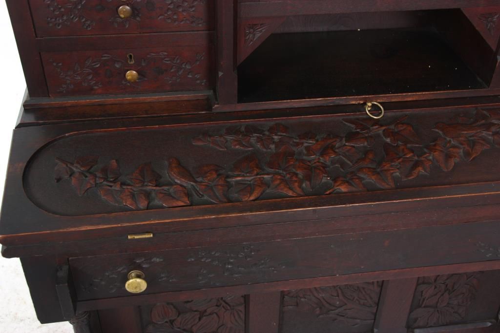 American Aesthetic Movement Walnut Writing Desk, ca. 1870-1890, attributed to Benjamin Pittman and William Fry's Cincinnati Women's Woodcarving Movement, Cincinnati, Ohio. 2 part cabinet, top section has a center 2 door cabinet with carved birds perched in different floral trees in inset panels, the crest with floating butterfly amongst a group of flowers and filigree, shell carvings at the tops of the posts and 2 drawer side sections, has extended carvings throughout, on the side panels and frame pieces are keyed through tenon construction. The base has a leaf carved drop front writing surface over a single drawer which also is a support for the lid, has turned support columns under corbelled brackets below and 3 large inset panels with filigree and avian carvings; the back side of the cabinet is carved all over and conceals a hidden compartment in the base. In very good condition and original finish. 61.75 in. high x 41.5 in. wide x 17.25 in. deep.