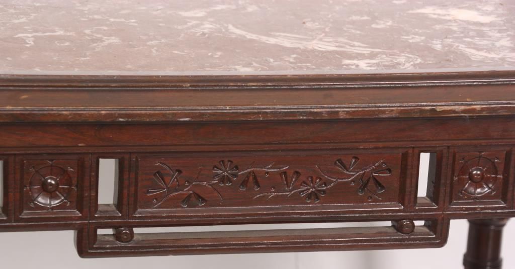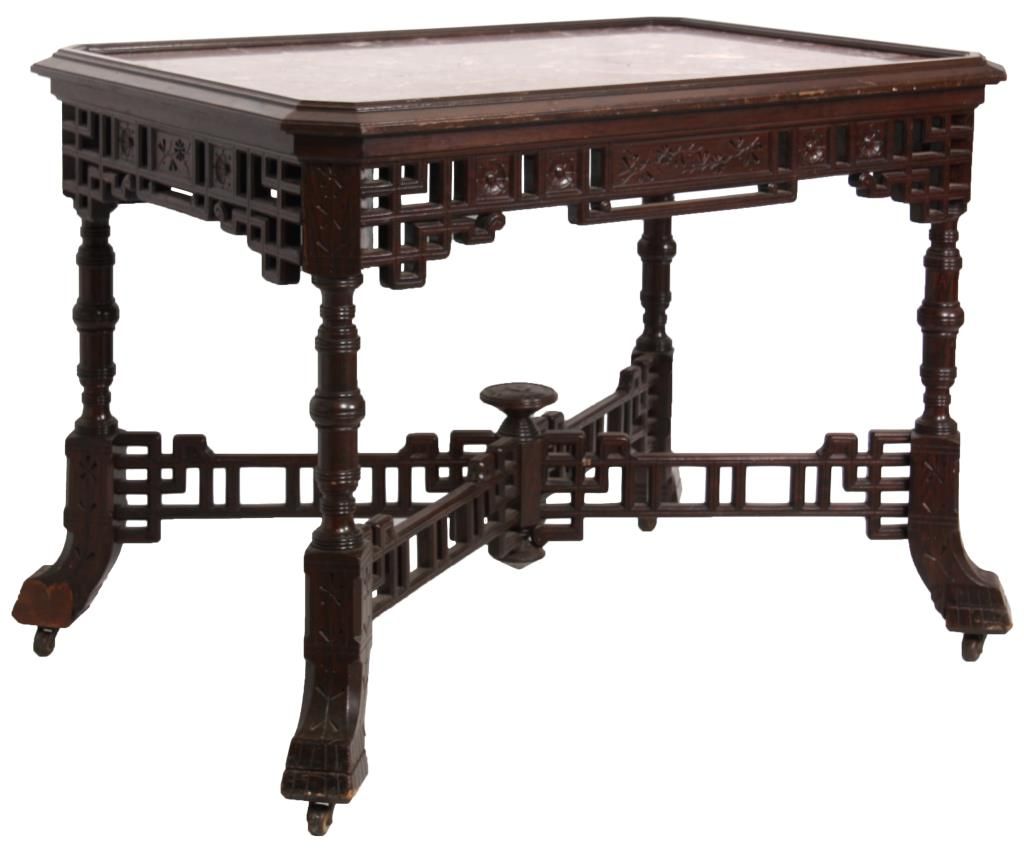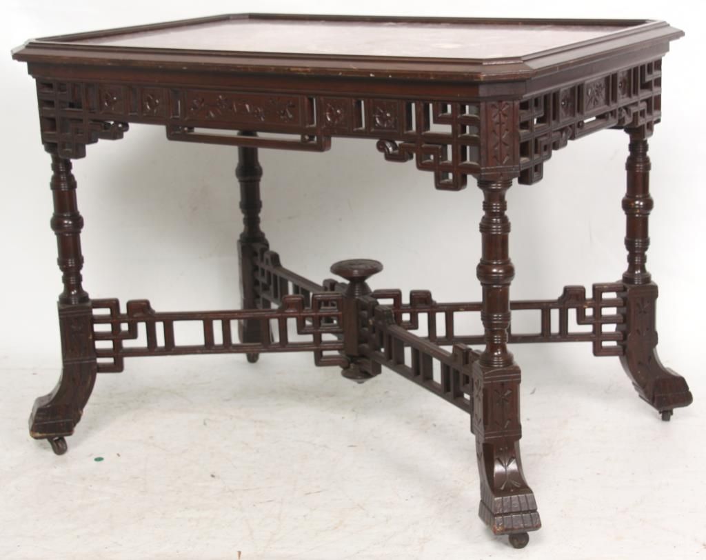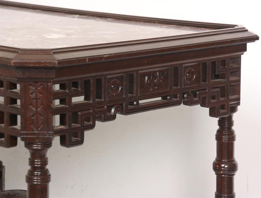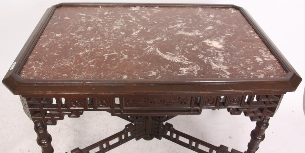 Aesthetic Marble Top Center Table. Rosewood grained table has an inset marble top with rectangular form and chamfered corners, over a pierced fret work carved apron with sunflower designs in the turned legs; a pierced fret work carved crossed stretcher with turned center cluster and carved finial. In good condition and original finish Has a piece missing on one foot. 30.5 in. high x 41 in. wide x 28 in. deep.
