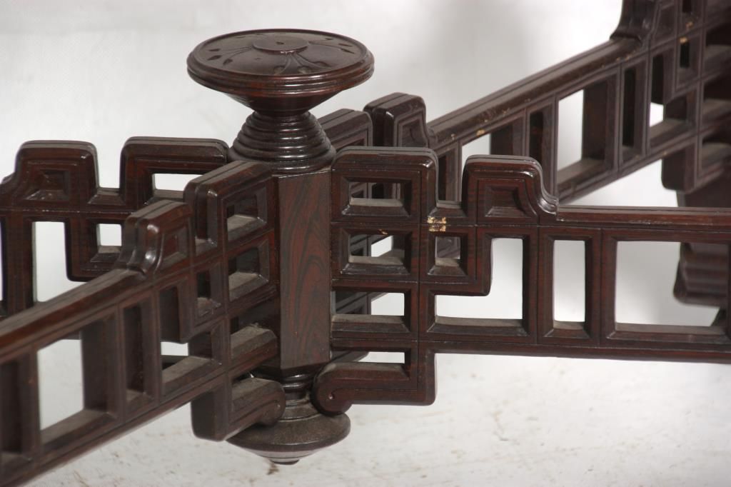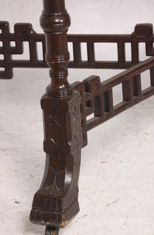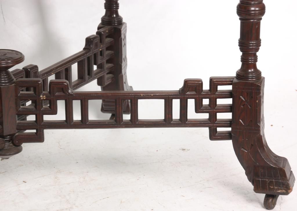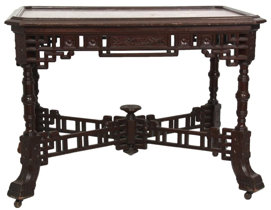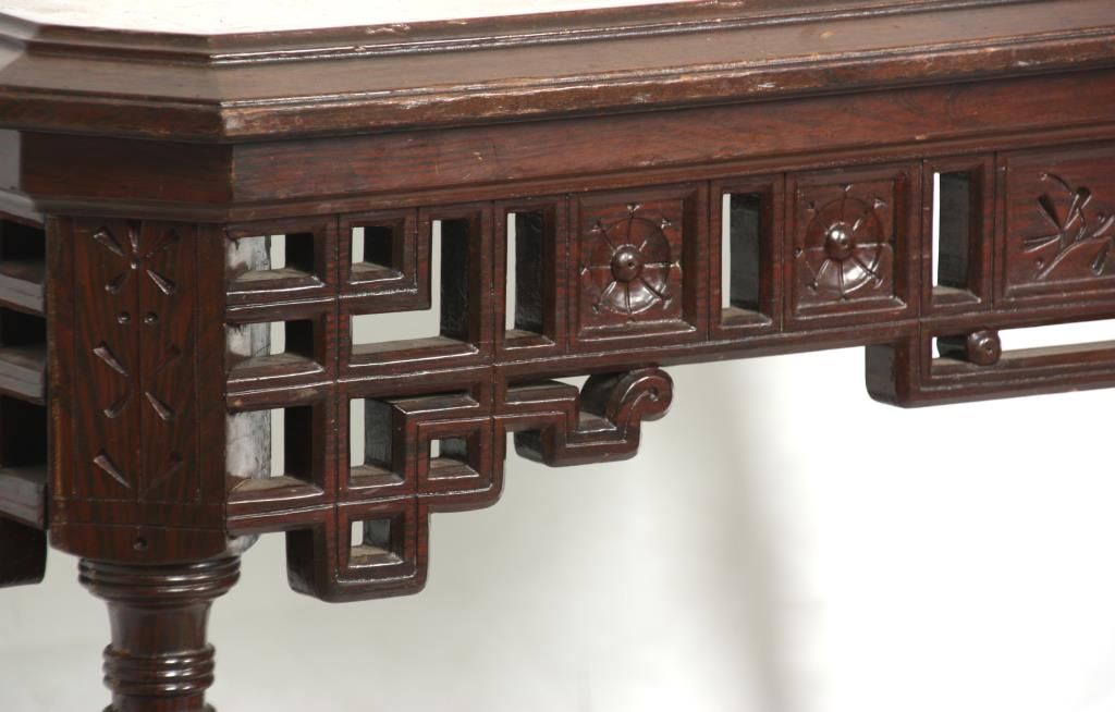 Aesthetic Marble Top Center Table. Rosewood grained table has an inset marble top with rectangular form and chamfered corners, over a pierced fret work carved apron with sunflower designs in the turned legs; a pierced fret work carved crossed stretcher with turned center cluster and carved finial. In good condition and original finish Has a piece missing on one foot. 30.5 in. high x 41 in. wide x 28 in. deep.
