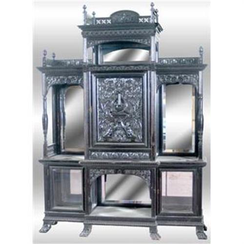 An American Victorian Aesthetic movement style, circa 1885, very well made ebonized over cherry wood mirror-backed display cabinet. All original finish with bevelled mirrors, nicely done pierce carved gallery, claw feet and a well executed front panel door with cherubs carving. Measurements: