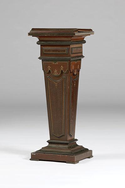 American, ca 1870-1880, mahogany and ebonized mahogany. An inverted plinth form with applied and incised decoration; 39.5" high x 15" wide x 15" deep.