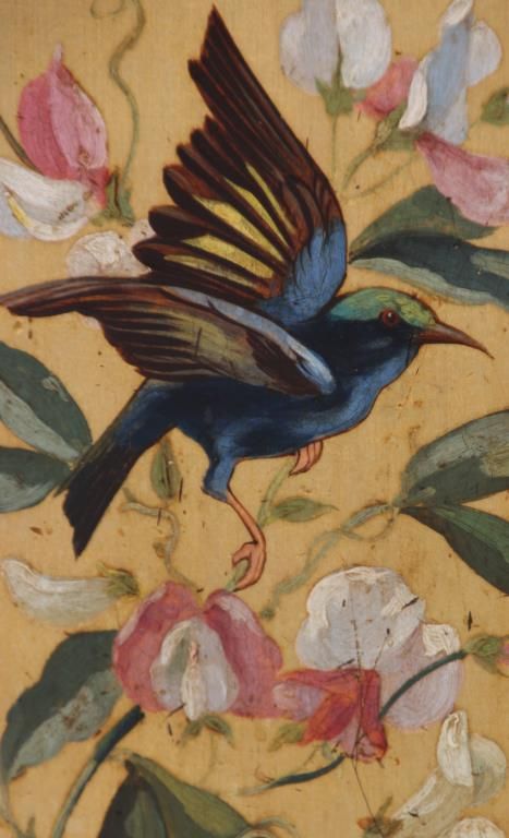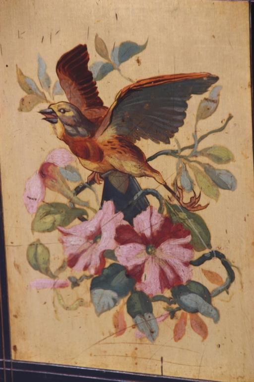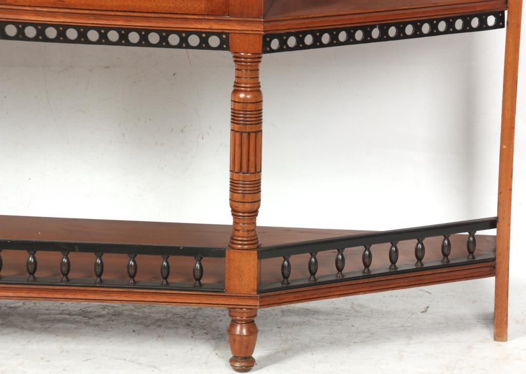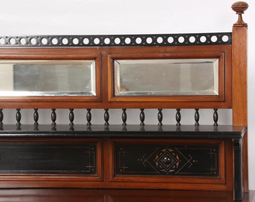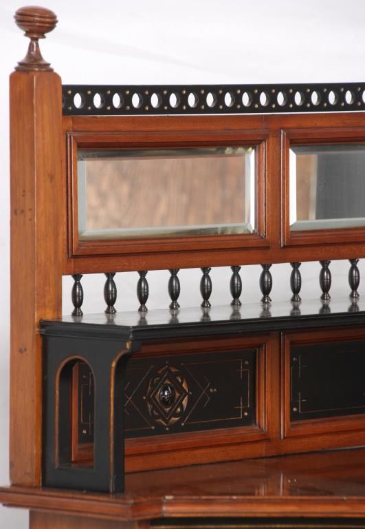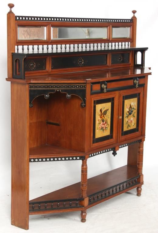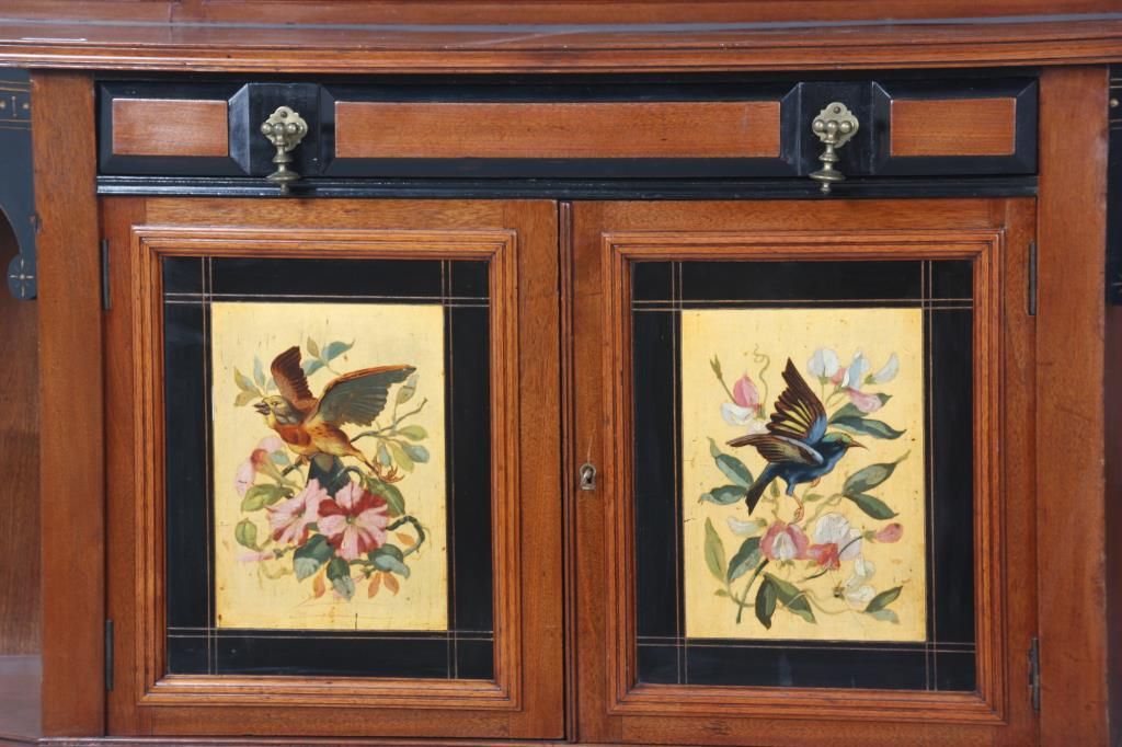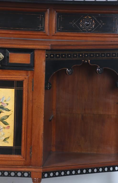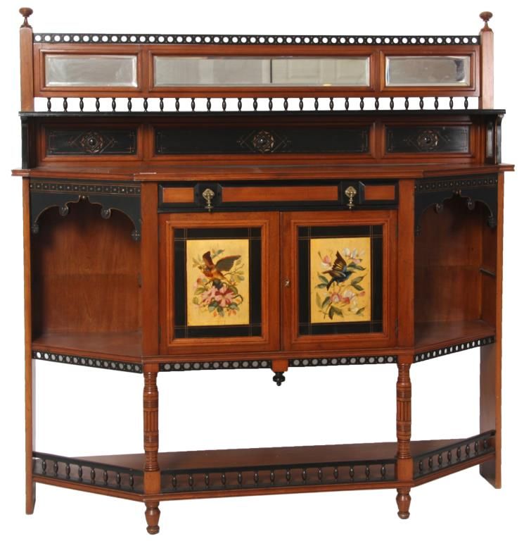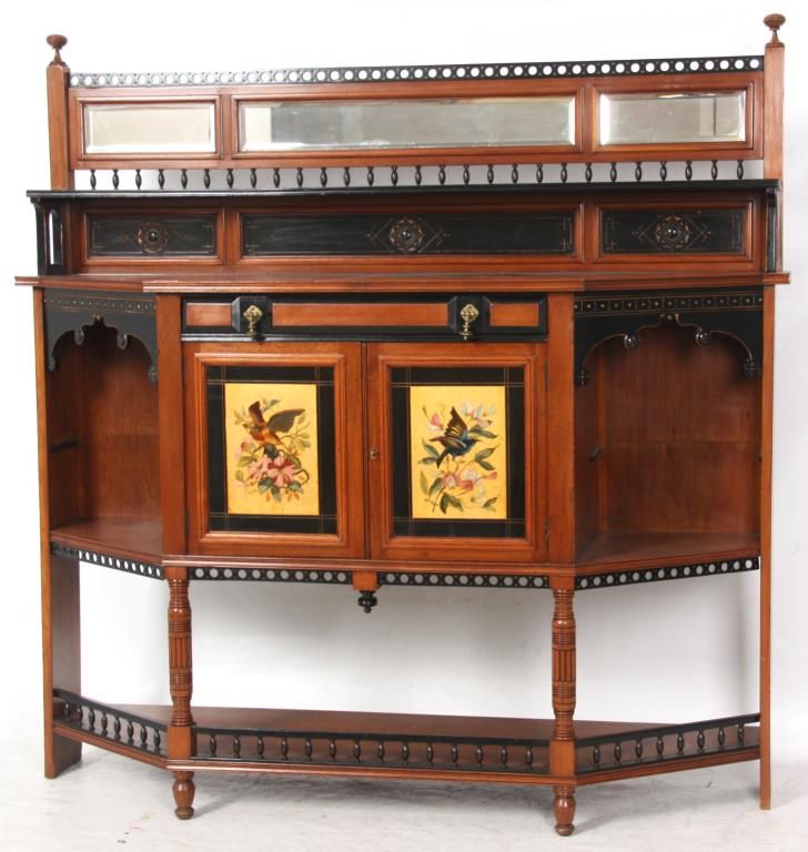 Aesthetic Movement Walnut Sideboard. Top has 3 beveled mirrors on the crest under a pierced carved ebonized rail and spindled turnings below, has turned finials at the top of the side posts and an ebonized shelf over 3 inset ebonized and incise carved side panels. The cabinet has a single drawer with brass teardrop pendant pulls over 2 doors with open angled sides; the doors have inset ebonized panels with colorful birds and flower clusters over a gilt painted background, shelves missing from the side sections. The base has turned column supports with a full length lower shelf, ebonized spindled gallery in the front and stands on turned feet. In excellent original finish and in good condition, circa 1880. Measures 60 in. high x 60.25 in. wide x 16.5 in. deep.