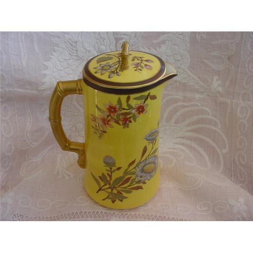 Stunning 19th C. chocolate pot by Royal Worcester in the Aesthetic style. This decorative chocolate pot has beautiful floral designs on a bright yellow background. Handles are gilded and in a bamboo form. Pot measures 9" tall, 7" from spout to handle, and 4 1/2" across base. The base is marked with a maroon Royal Worcester mark with "Ovington Brothers" above and an "X" below, dating this piece to 1886. Wonderful showy piece! Excellent condition.