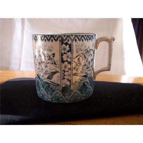 Nice large transferware mug.Very hard to find color-TEAL.No chips or cracks.Very light stain on rim,probably from coffee and may come out.Measures 4" across top by 4" tall.Un-marked but a nice early piece.