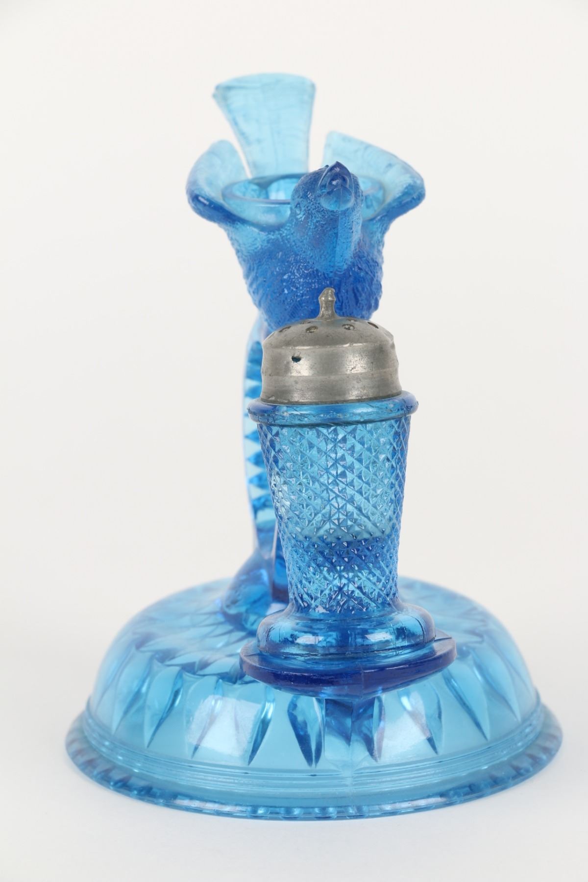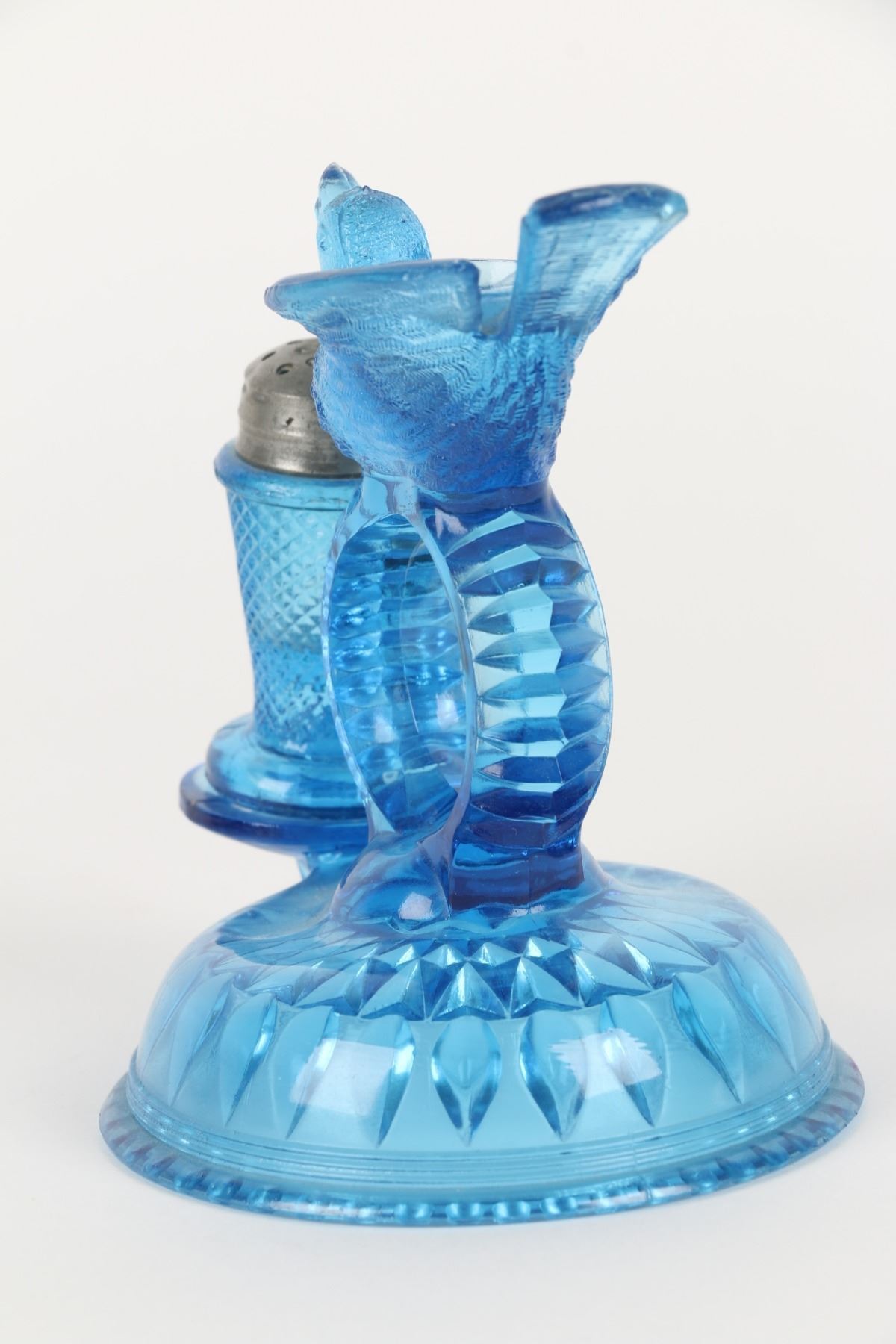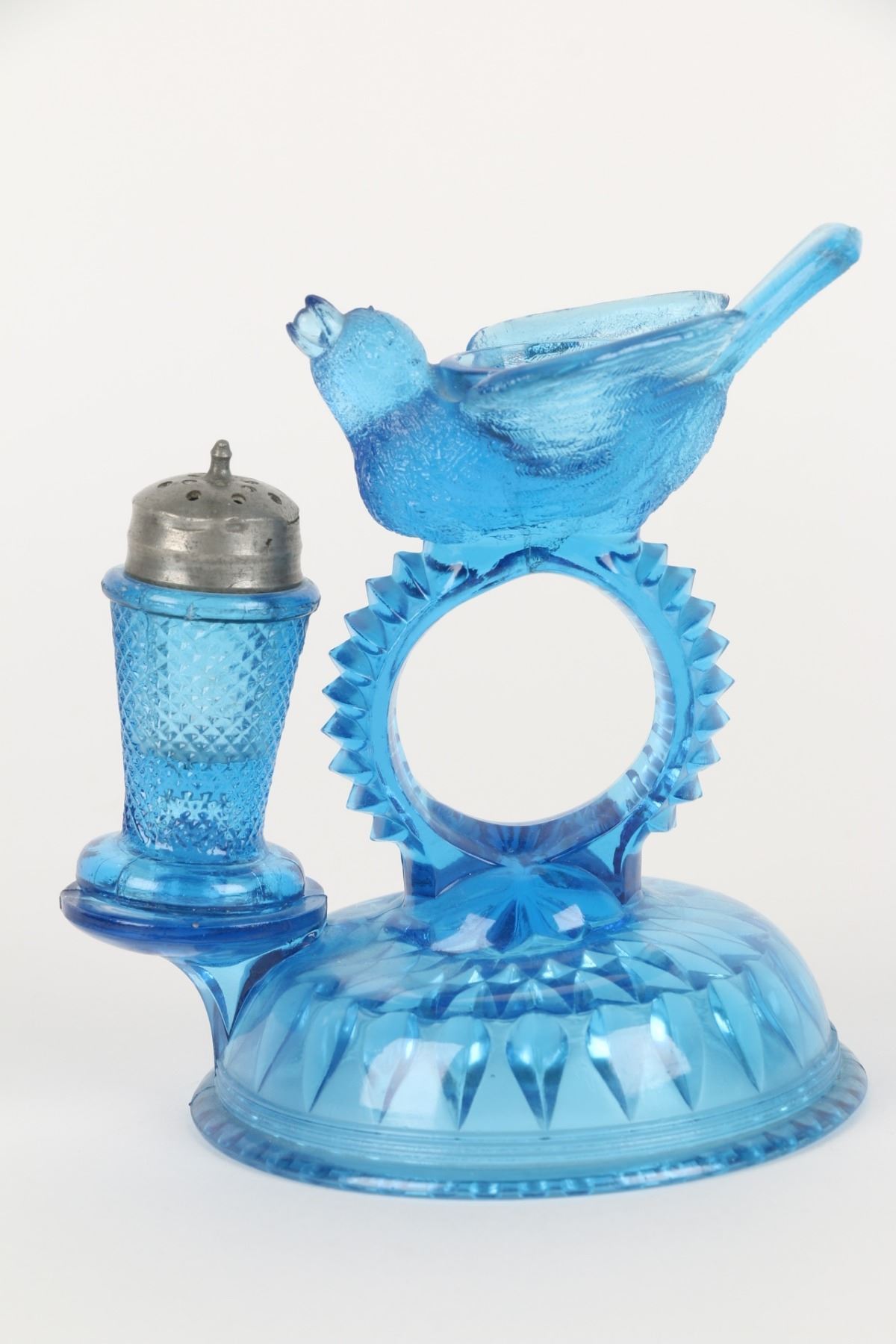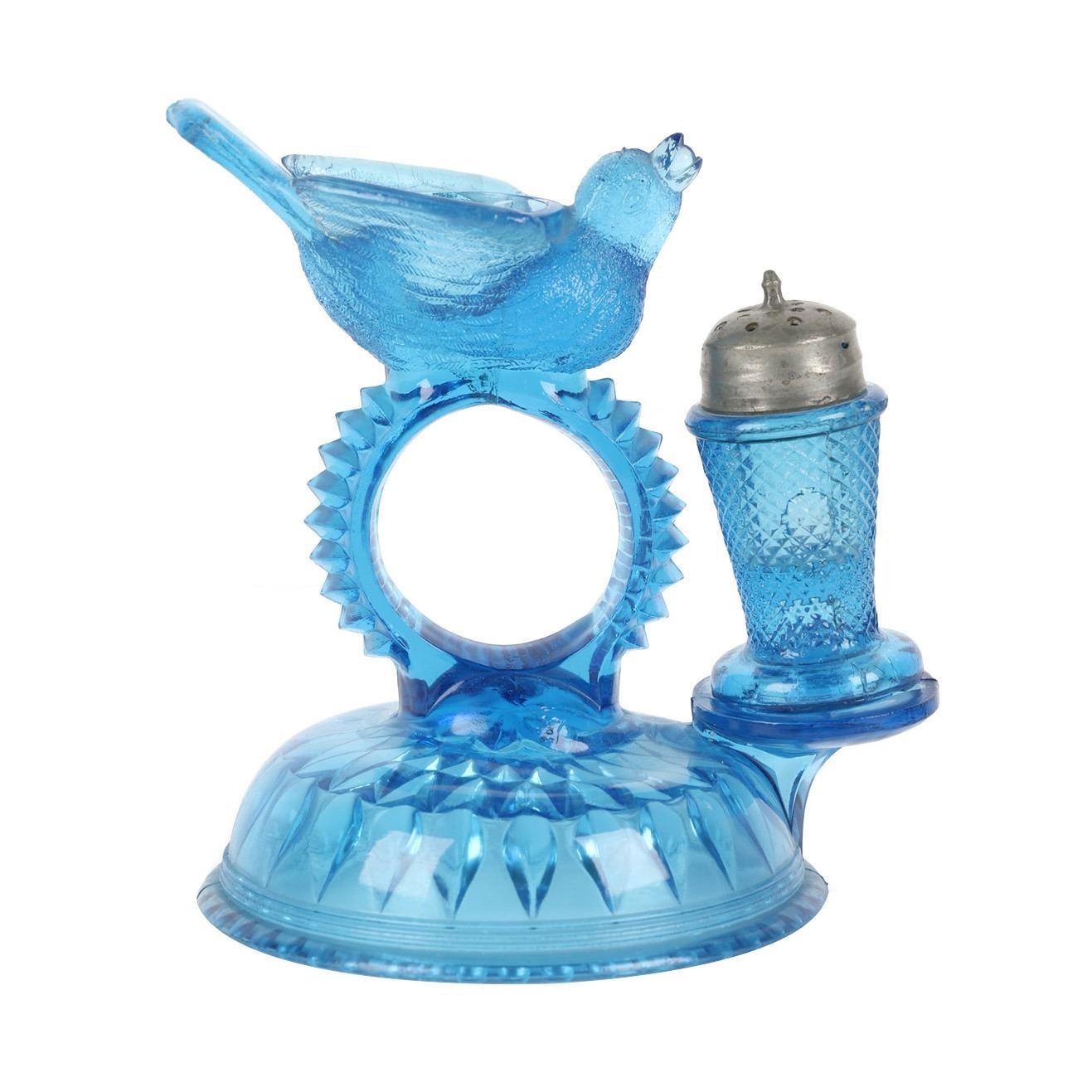 Lot 422 - Circa 1890. American. Aetna Glass Co. Blue pressed glass, original pepper shaker for bird open salt cellar, napkin holder center. 5.25" h. Bird tail tip with tiny abrasions. Two very small edge fractures. Shaker with tiny shoulder flake and two small foot flakes. $100-200.