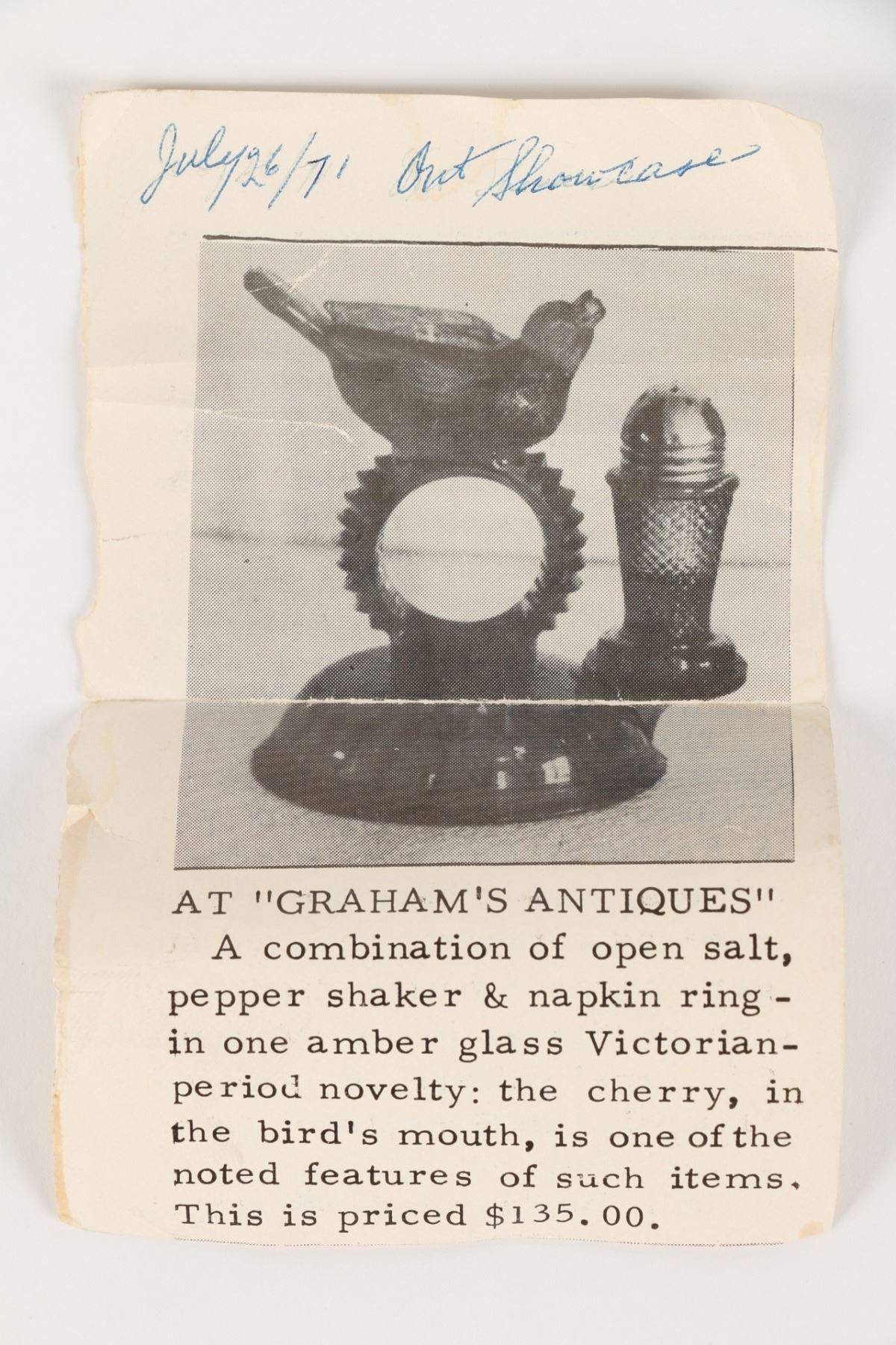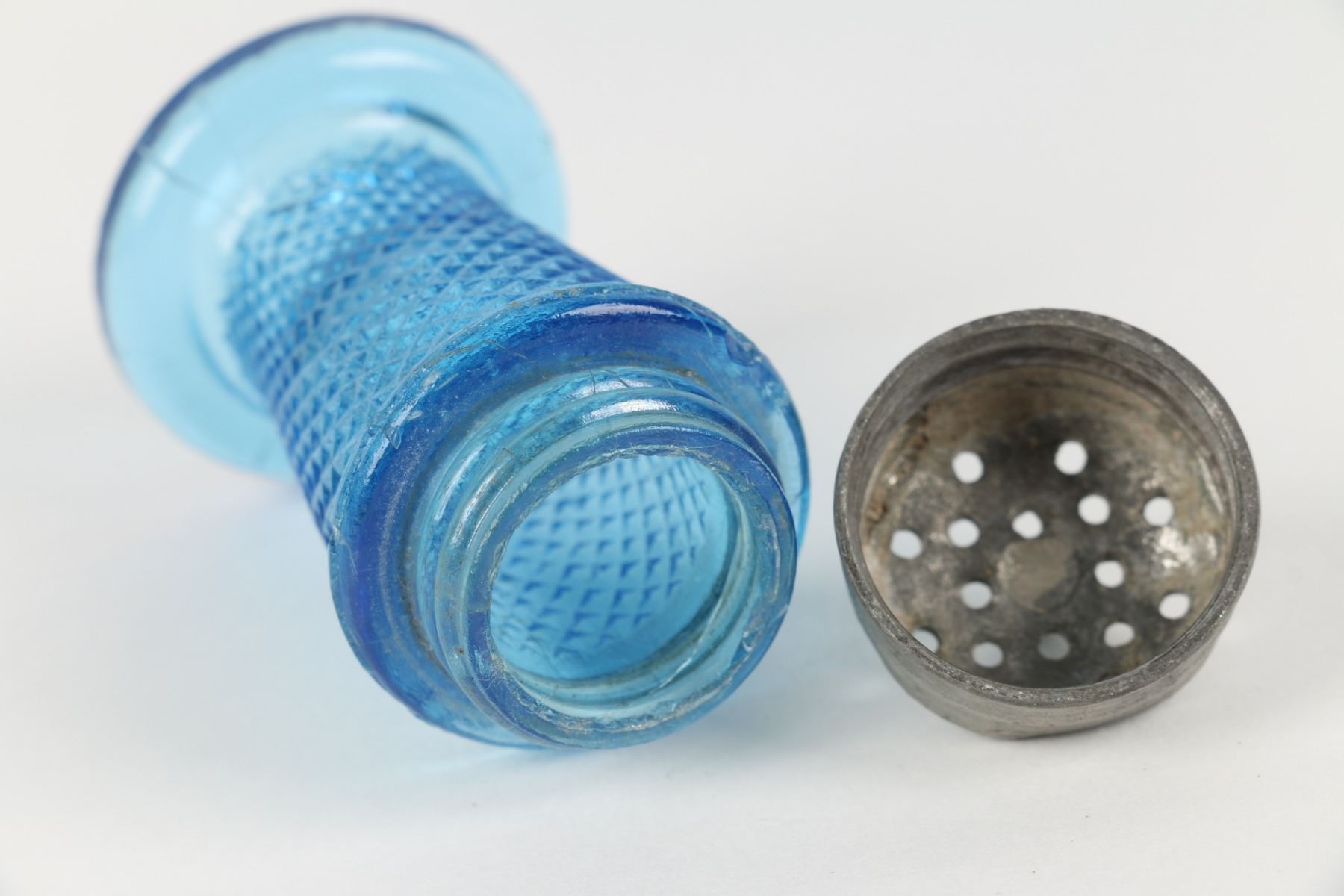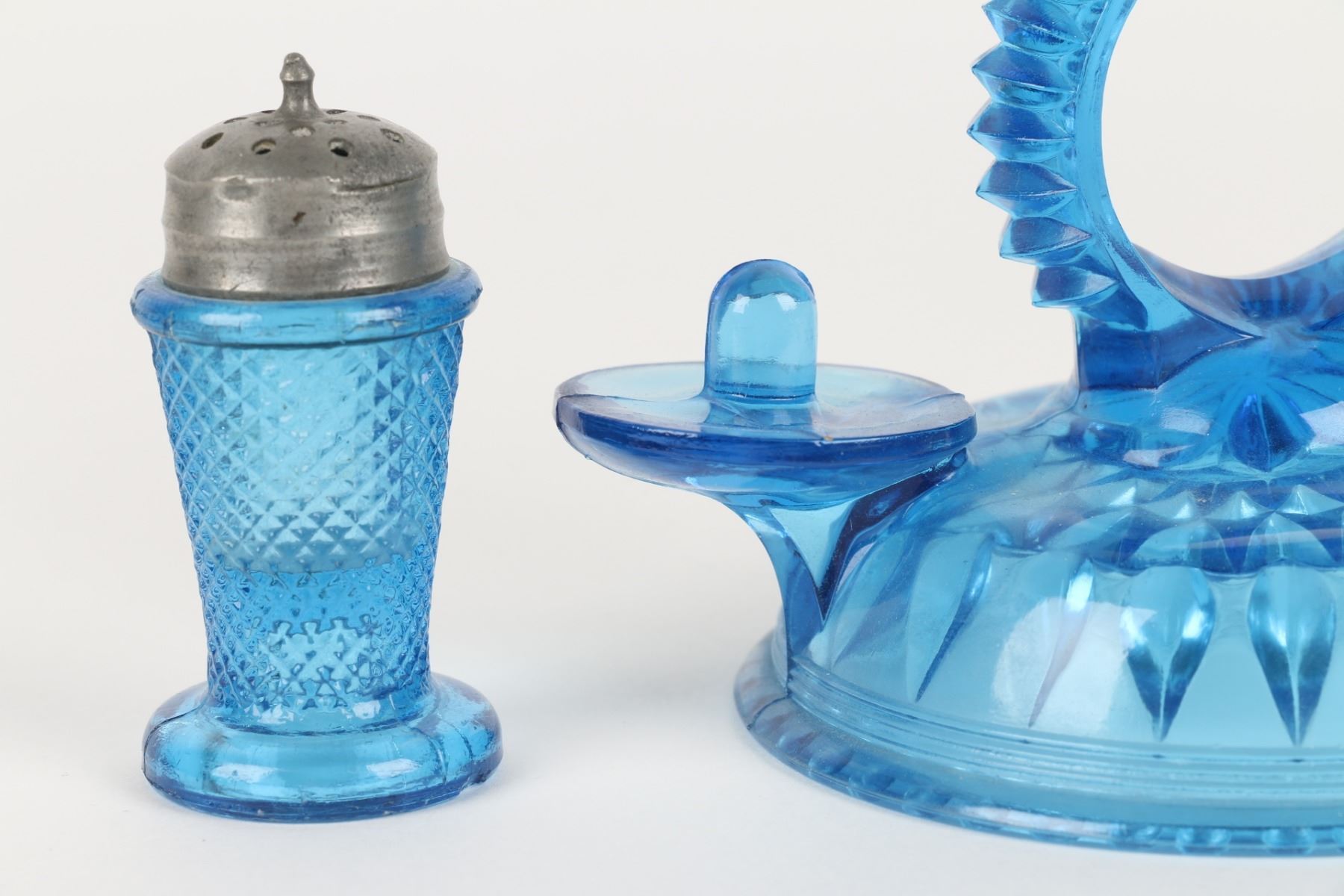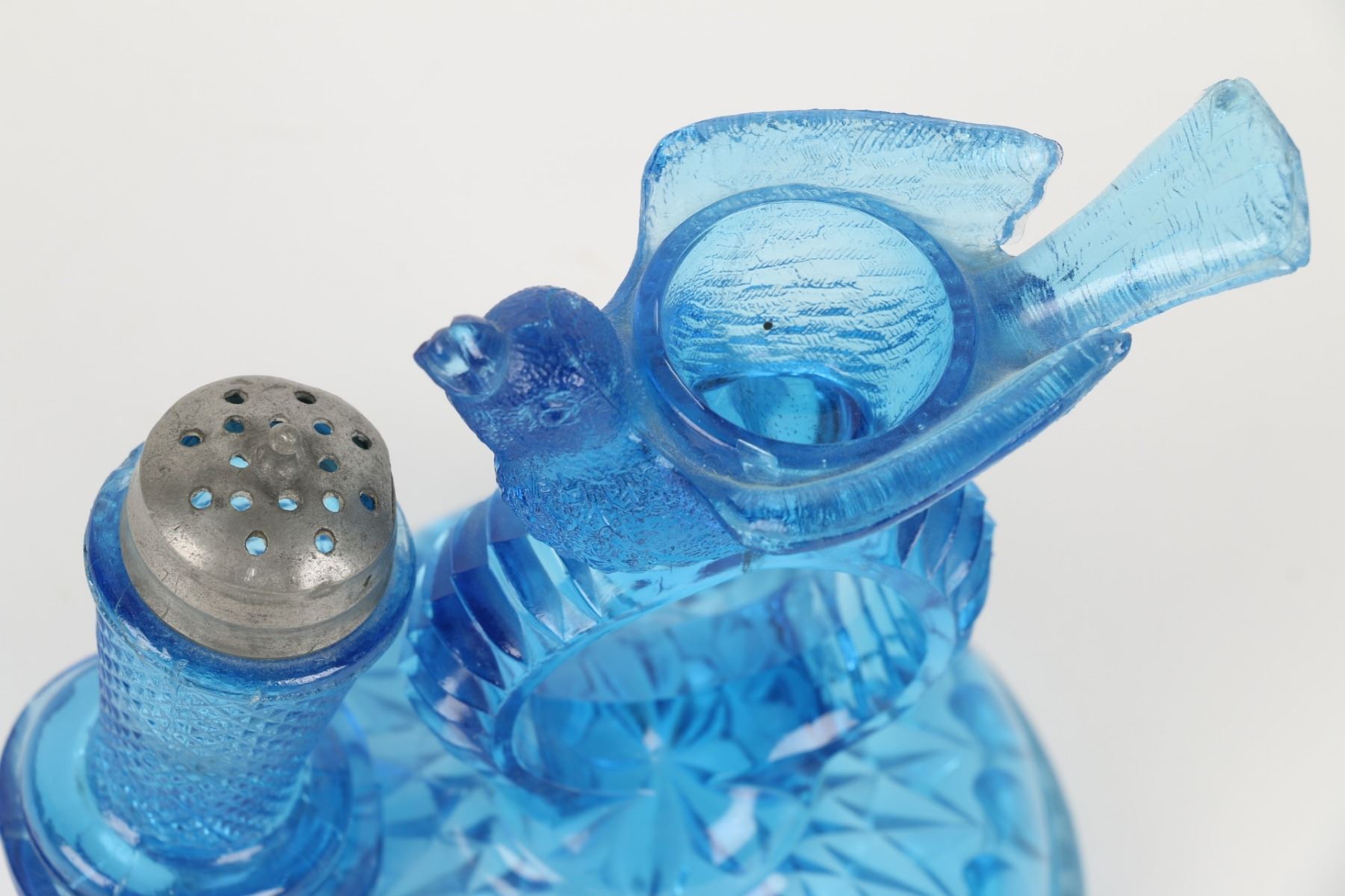 Lot 422 - Circa 1890. American. Aetna Glass Co. Blue pressed glass, original pepper shaker for bird open salt cellar, napkin holder center. 5.25" h. Bird tail tip with tiny abrasions. Two very small edge fractures. Shaker with tiny shoulder flake and two small foot flakes. $100-200.