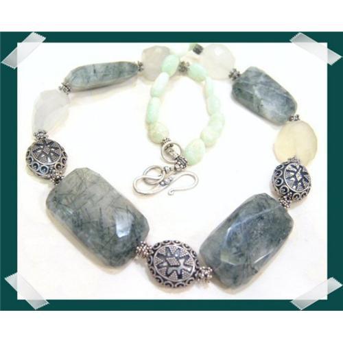 Affluent Richly Hued Faceted Rutile Quartz Necklace complimented with adventurine, chalcedony and of course detailed tribal sterling.. A very grand gram weight of 123 make this piece of jewelry a fabulous acquisition worthy of consideration. The center stone has measurements of 39x25x12mm and is flanked on both sides by 18mm sterling silver. The necklace has a length of 18.25".
