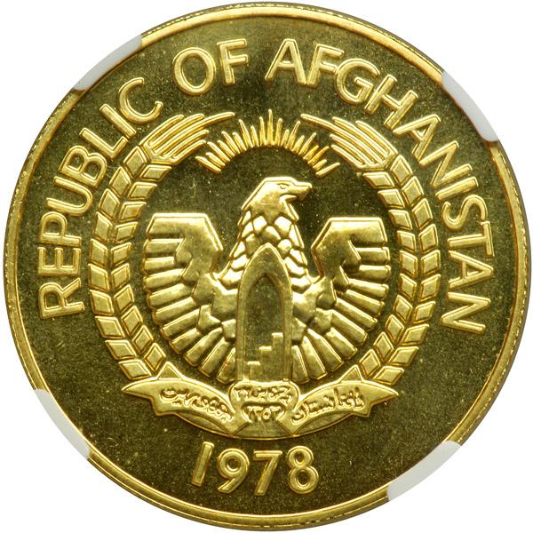Afghanistan. 10,000 Afghanis, 1978. Fr-43; KM-982. Weight 0.9675 ounce. Mintage 694. For wildlife conservation program. National arms. Reverse: Marco Polo sheep. NGC graded MS-65.