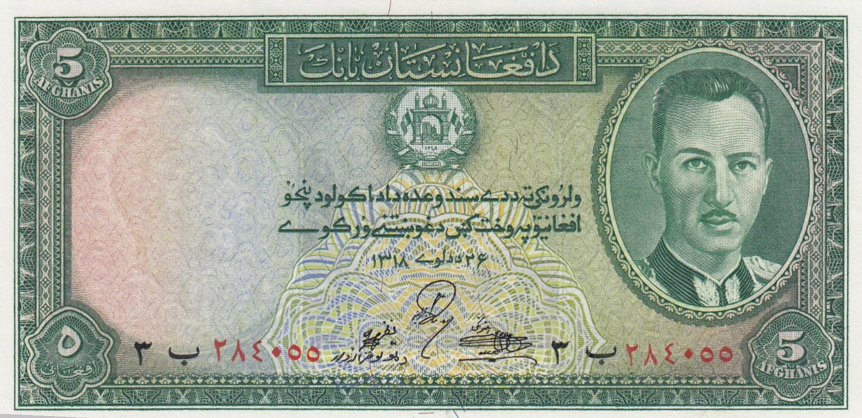 Afghanistan, 5 Afghanis, 1939, UNC, p22br/King Muhammad Zahir portrait