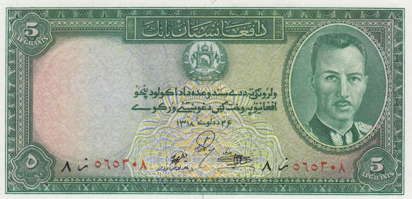 Afghanistan, 5 Afghanis, 1939, UNC, p22br/King Muhammad Zahir portrait