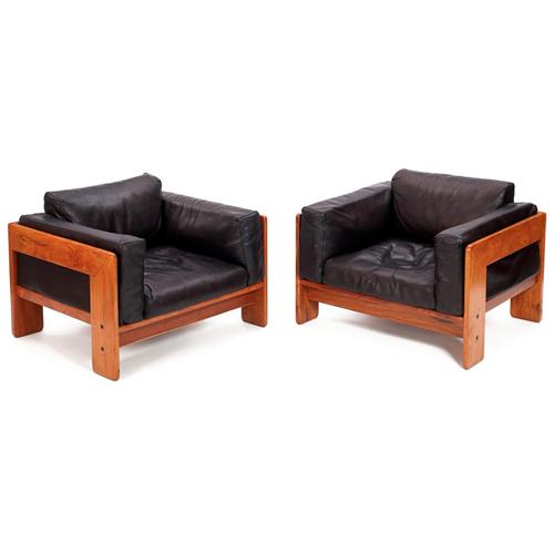 Afra and Tobia Scarpa Bastiano chairs, pair, by Gavina, imported by Stendig, rosewood frames with leather-covered loose cushions, original finish, marked with Stendig label,36in.w x 30in.d x 27in.h,very good condition
