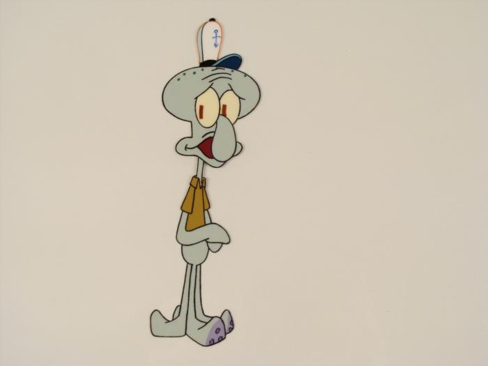 This original animation cel is from the Nickelodeon TV show SpongeBob Squarepants. The story takes place under the deep blue sea in Bikini Bottom, where SpongeBob resides. SpongeBob, who is a yellow, porous sponge, is your typical happy-go-lucky character, as he is always cheerful and enjoys making people laugh. Patrick Star, SpongeBob's neighbor who is a starfish, is your average children's show idiot, as he boasts knowing nothing and is often getting himself into ridiculous situations. Between the homes of these two lies the home of the miserable Squidward, a squid, who is known for being grouchy and playing tricks on SpongeBob and Patrick. Both SpongeBob and Squidward work at the Krusty Krab, a fast food business run by the greedy money-loving Mr. Krabs, a crab, the arch rival of the evil, possibly misunderstood, Plankton. Another neighbor, Sandy Cheeks, an athletic squirrel who normally wears an astronaut's space suit, was introduced in "Tea at the Treedome." She spends most of her time inventing and experimenting. Squidward is afraid.Original Production Animated Cel Overall Size of Cel: 10 1/2" x 12 1/2" Very Good ConditionThis is an original hand-painted cel set-up used in the production of an episode of "SpongeBob SquarePants." Each one-of-a-kind set-up represents a slight change in position of the characters. When individually photographed and projected in rapid succession, the images appear to move.