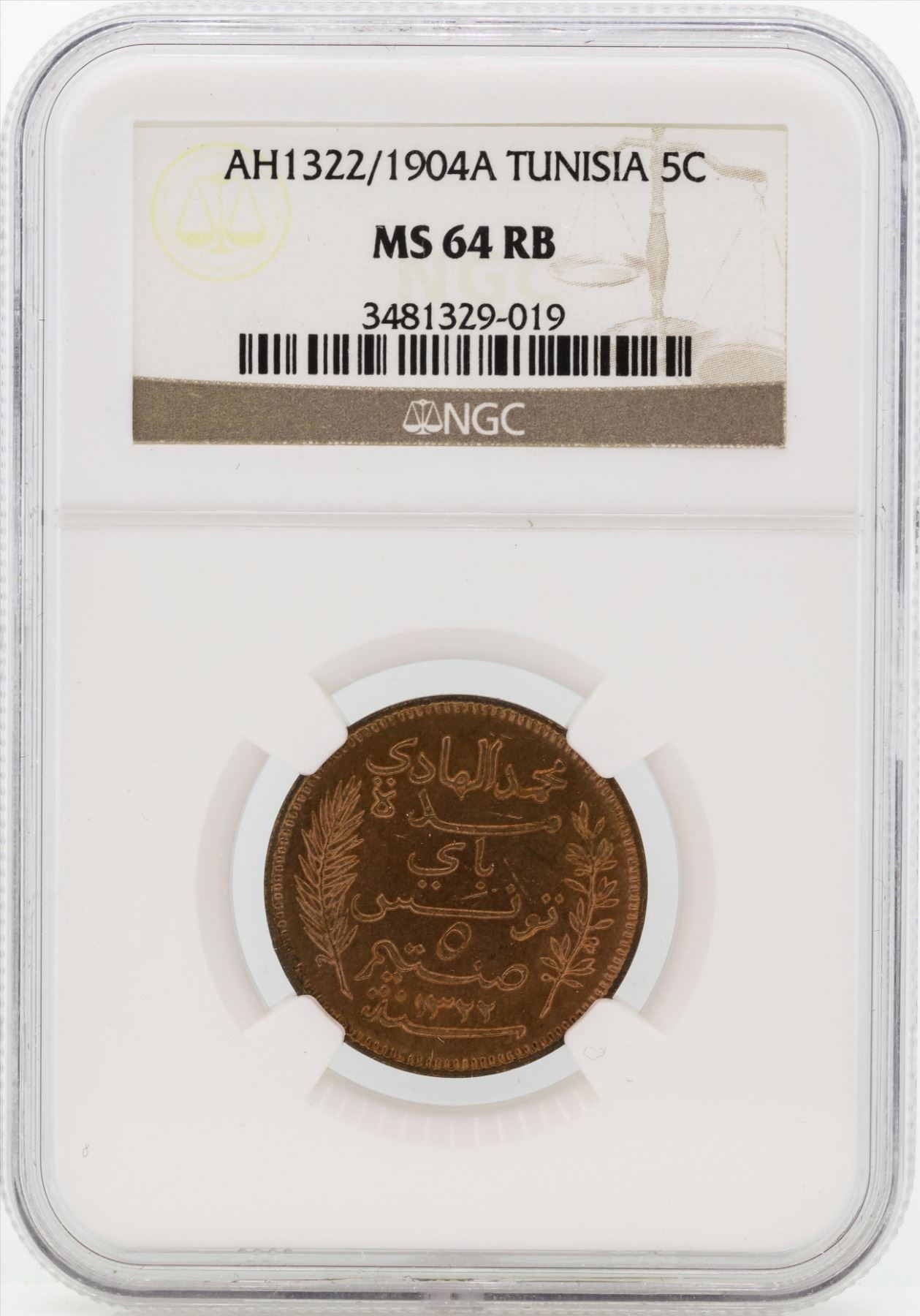 One Africa Tunisia AH1322/1904A 5 Centimes Coin NGC MS64RB.