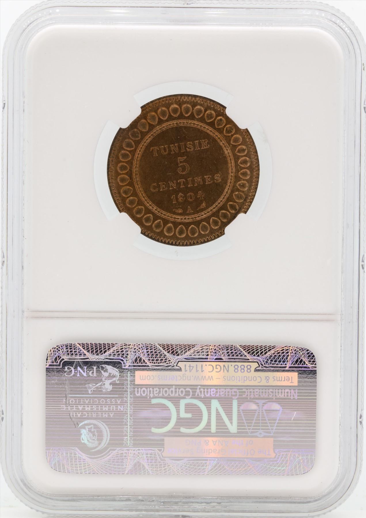 One Africa Tunisia AH1322/1904A 5 Centimes Coin NGC MS64RB.