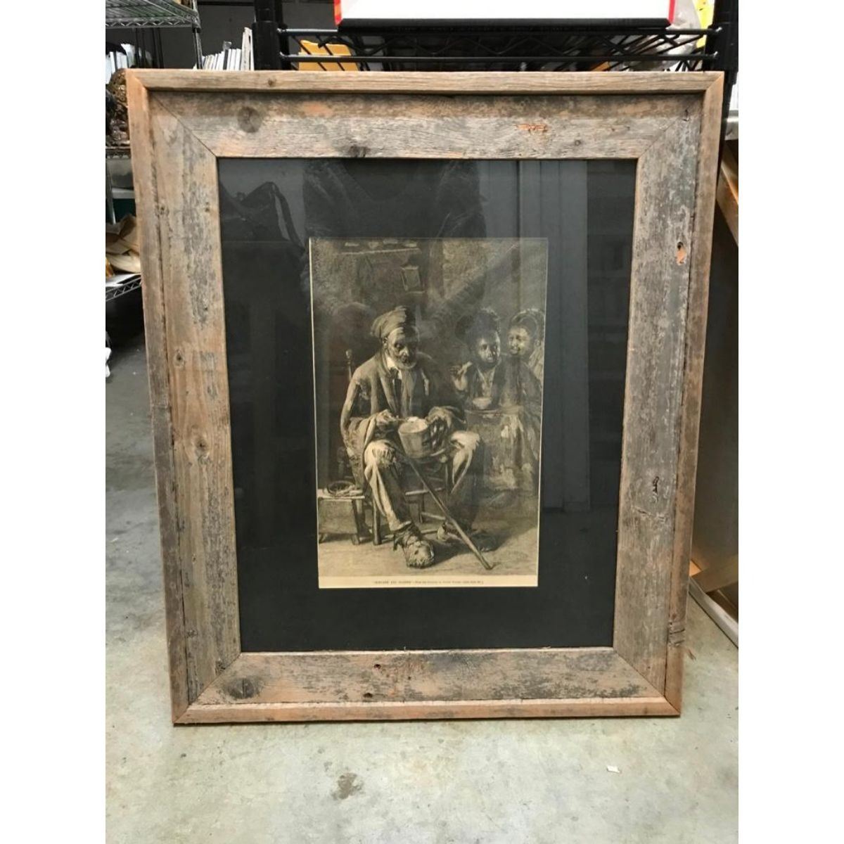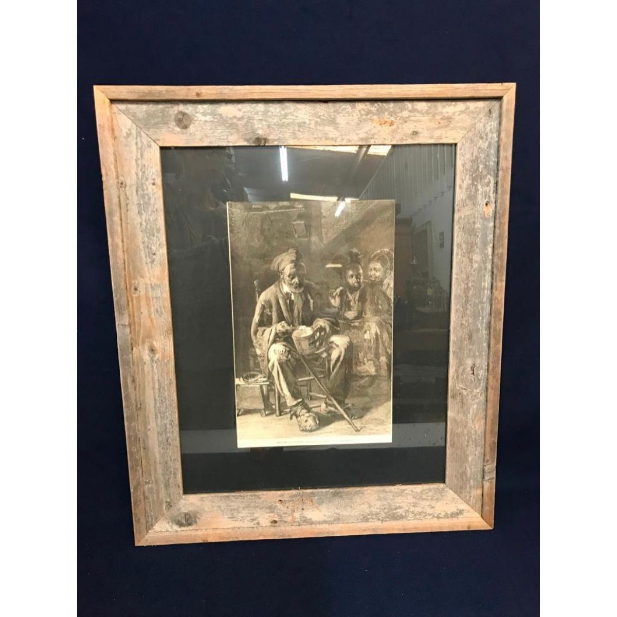 "Hoe-Cake and Clabber" wood cut engraving from an 1888 issue of Harper's Weekly Illustrated periodical. Original artwork by Alfred Kapper. 9" X 14" in 21" X 25" antique barn board wooden frame.Â