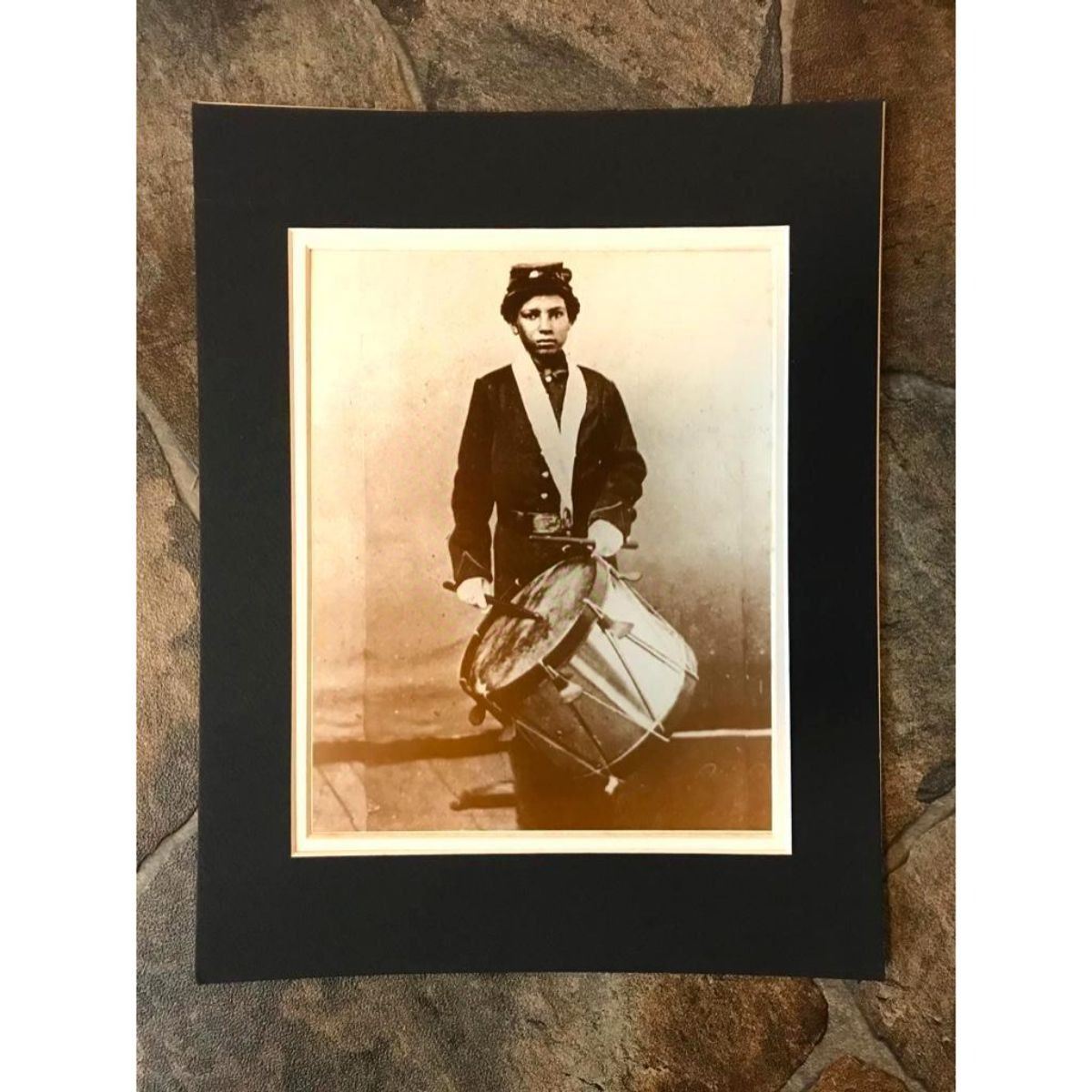 African American History, Black Americana, Civil War subject - Contraband drummer boy in uniform, 79th U.S. Colored Troops. Sepia-tone photo print on heavy cardstock, created in the early 1990's for the American Heritage Galleries. 8" X 10" om 11" X 14" double mat. Â