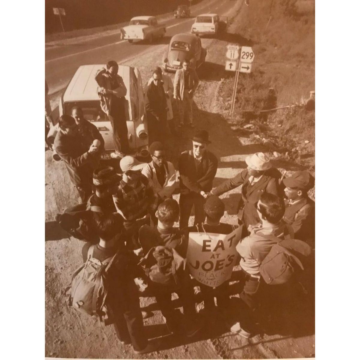 African American History subject, Members of the Freedom March, singing "We Shall Overcome" 1963. Sepia-tone photo print, on heavy card stock. Printed after an original photo in the early 1990's for The American Heritage Gallery. 11" X 14". Taped down to backing board, ready for matting & framing.Â