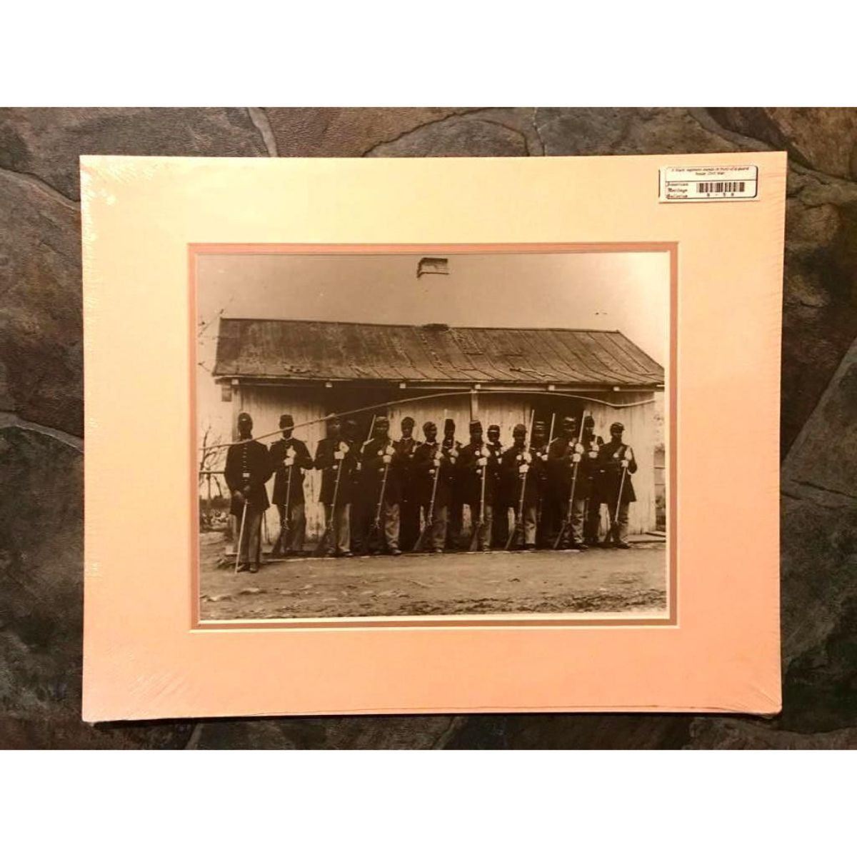 African American History, Black American subject - A black regiment in front of guard house, Civil War. Sepia-tone photo print, printed on heavy cardstock,created in the early 1990's for The American Heritage Galleries. 11" X 14" double matted in original gallery shrink-wrapped packaging. 16" X 20" overall.Â