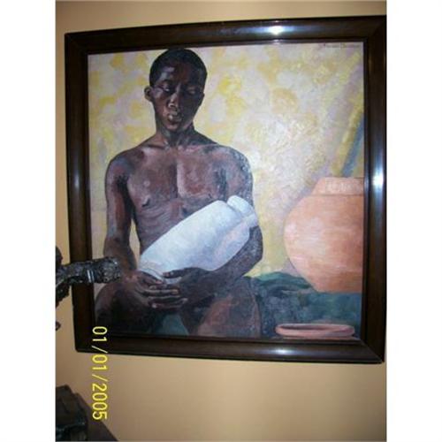 "Pottery Seller" by Frances Davidson (African American). Circa 1960's. Oil on Masonite. Framed in original frame. Signed at top right corner. The frame needs some repair.