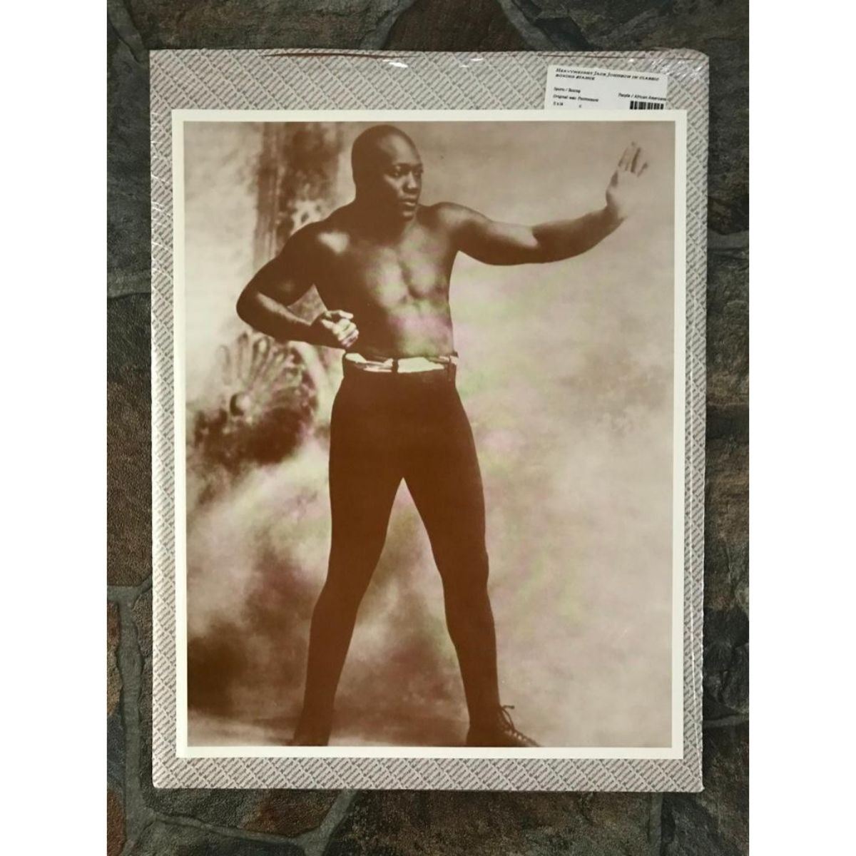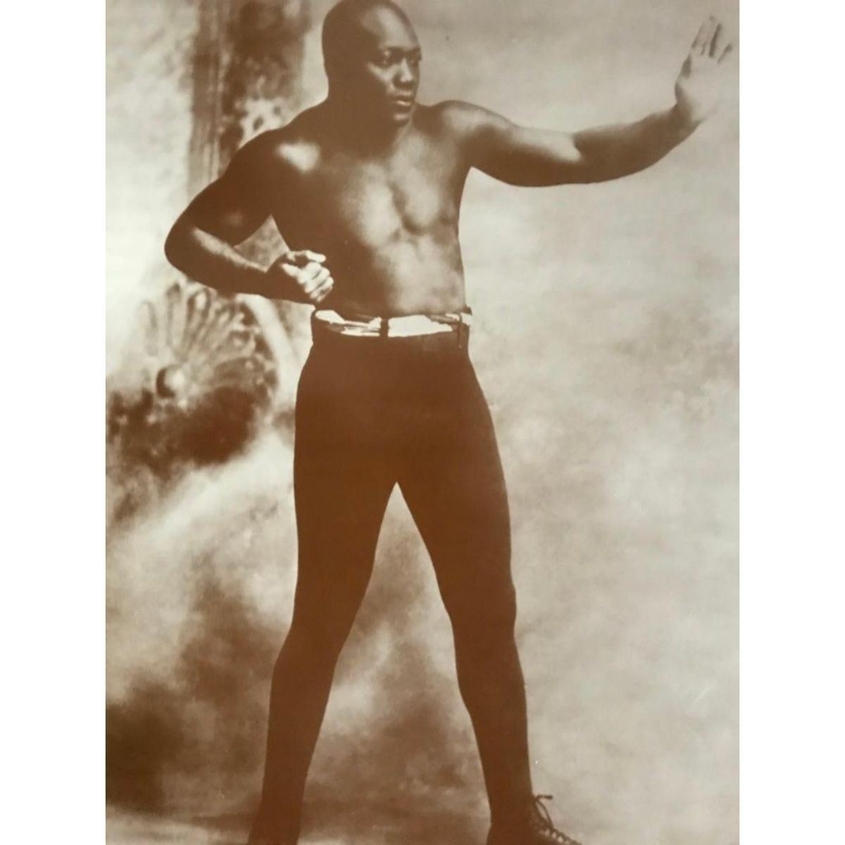 African American sports history subject, Jack Johnson In Classic Boxing Stance, sepia-tone photo print for gym or sports bar. Printed on heavy card stock in the early 1990's for The American Heritage Gallery. 11" X 14" in original gallery shink-wrapped packaging.Â