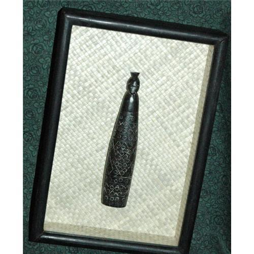 Interesting African Art Carved Figure mounted in a show box that is lined with grass matting. It is behind glass. The figure does not have legs or arms but is covered with a carved pattern. <p> The box is 12" x 8 1/4" x 2 3/8".<p> The condition is excellent. It is ready to hang. <p> I don't know this history or the age.