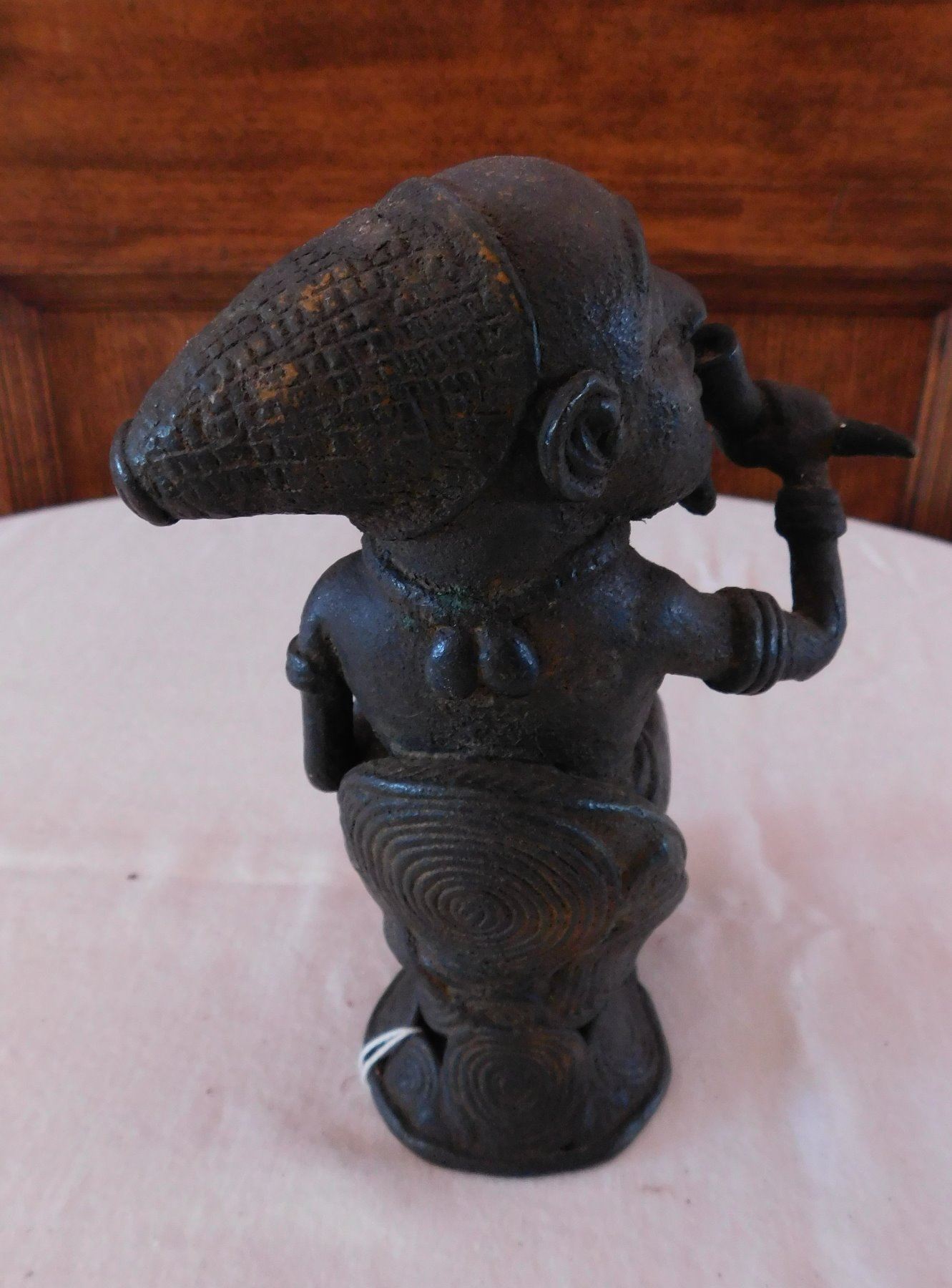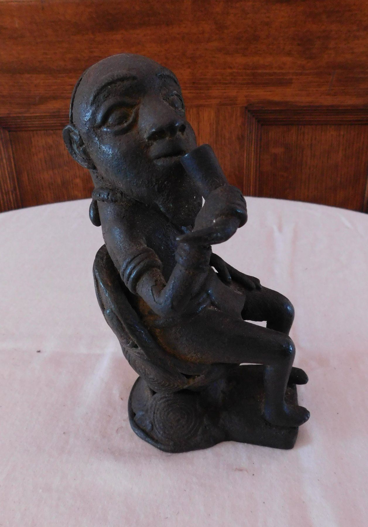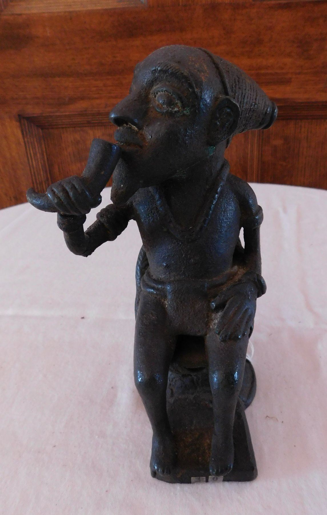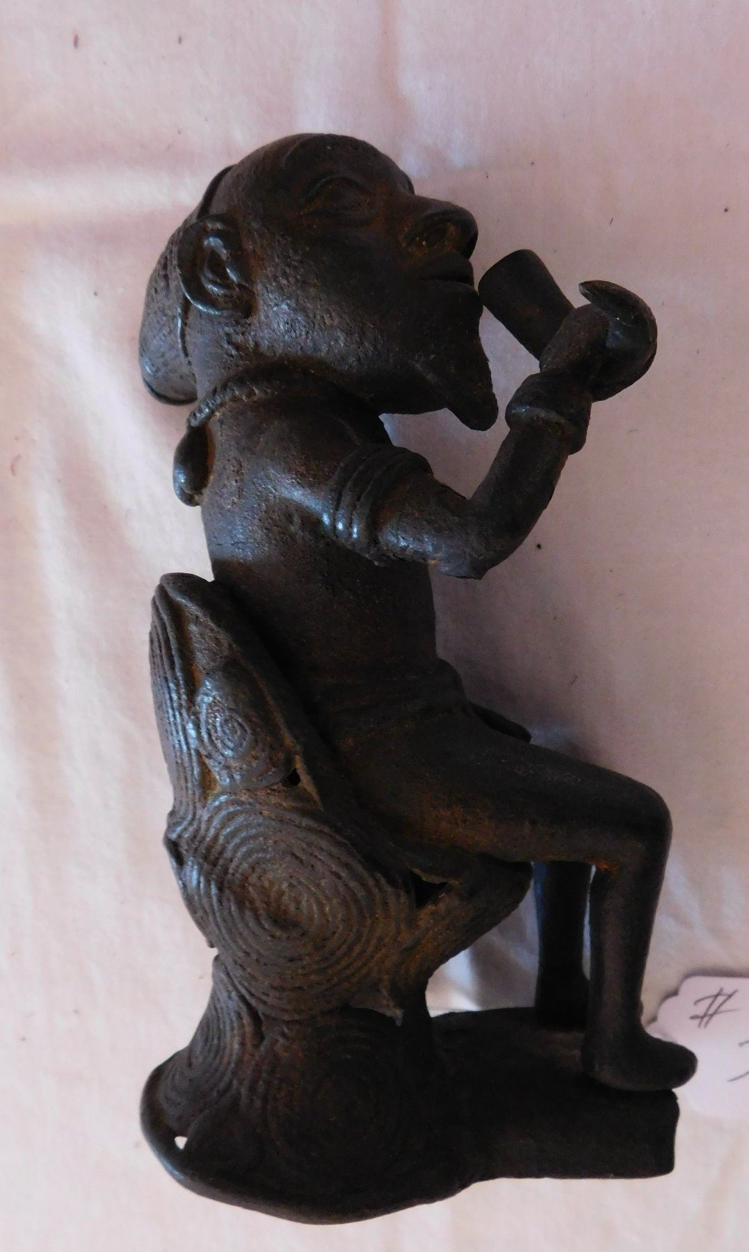 African Bamileke Bronze, late 19th century item. Made of bronze, the item measures approx. 4" x 4" x 7". Bamileke, Cameroon. Lost wax process figure drinking palm wine from horn. Condition: Great patina, see images. Shipping: $25.50 w/insurance and signature, due to value.