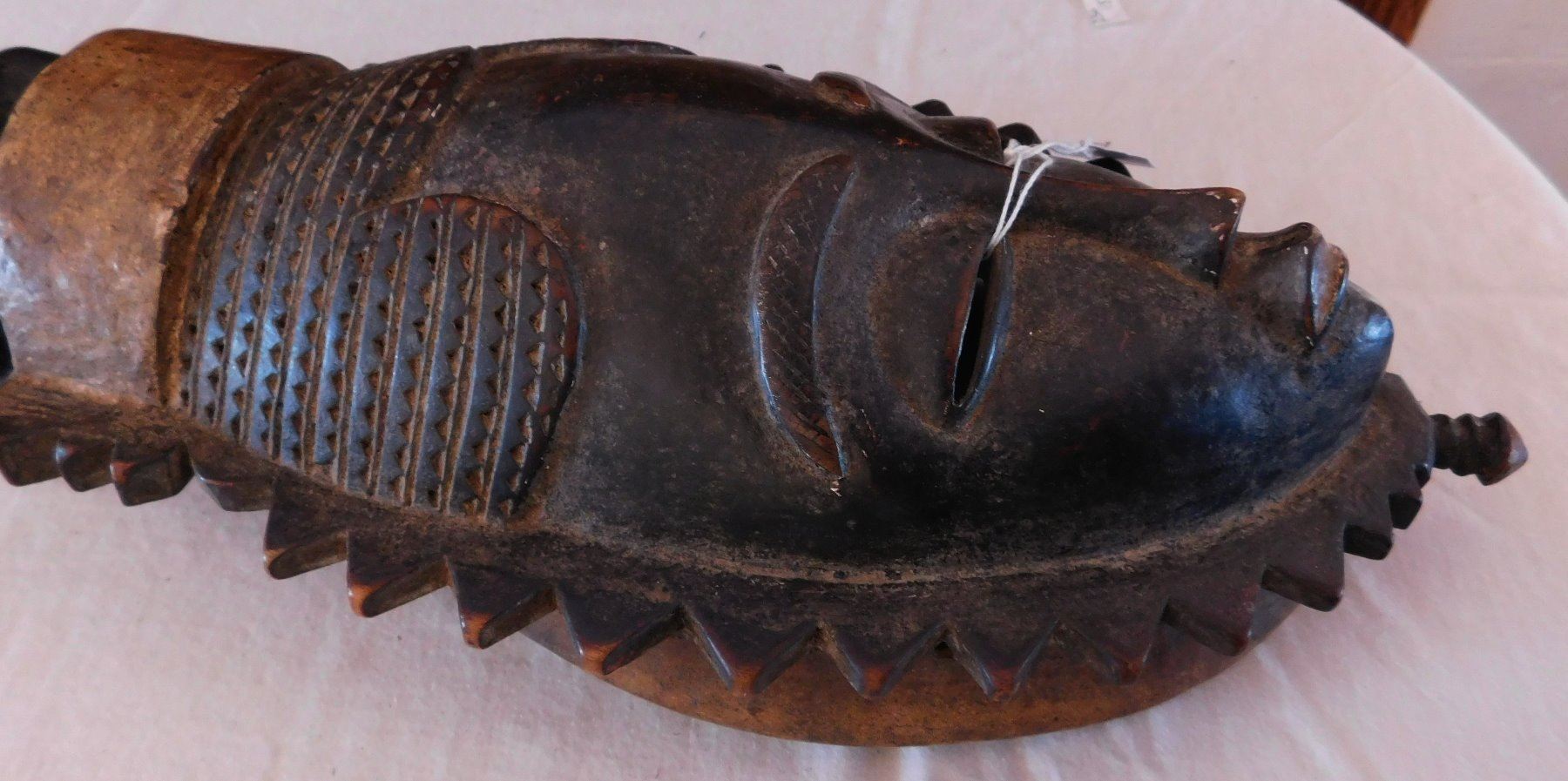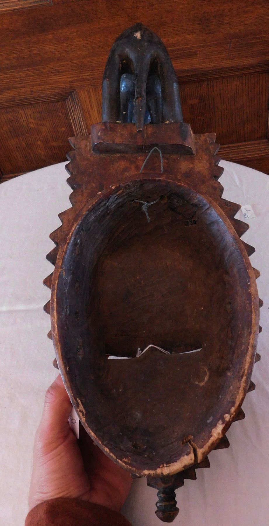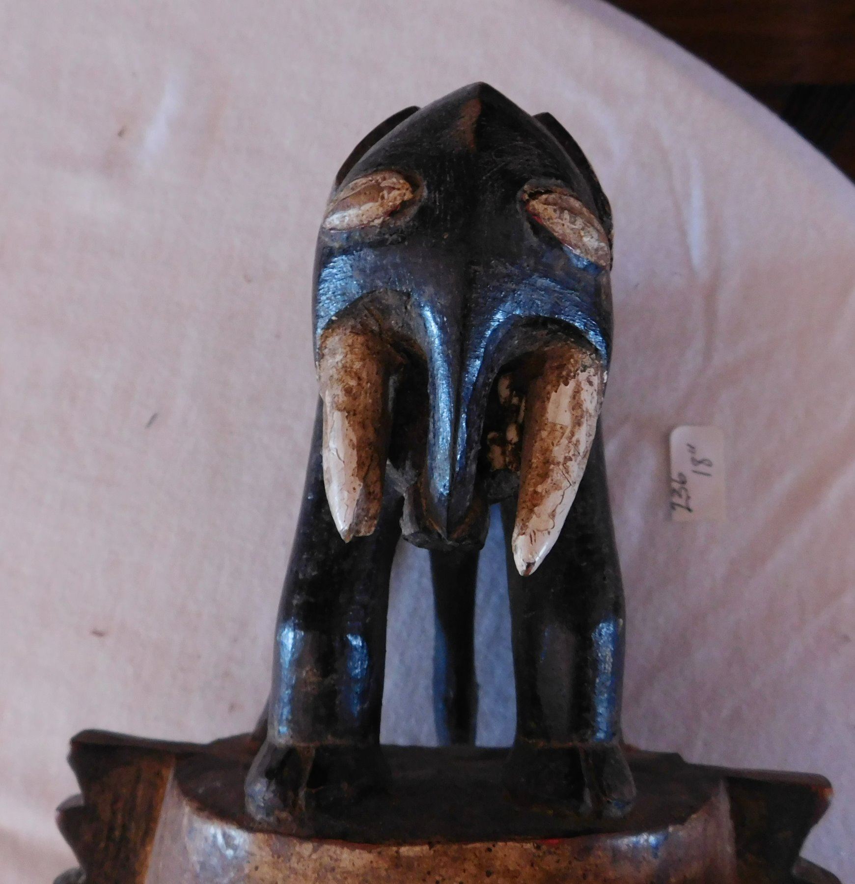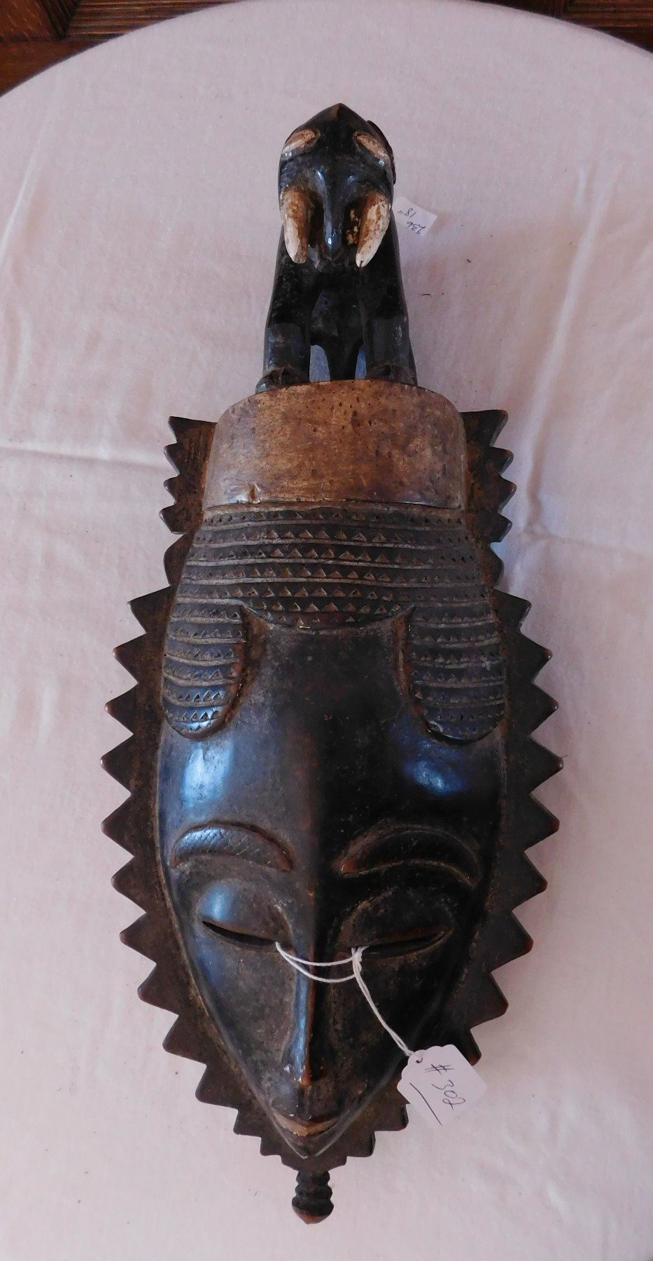 African Baule Mask, early 20th century. Made of hardwood and paint, the item measures 7 1/2" x 5 1/4" x 18 1/2". Baule tribe, Ivory Coast. Fantastic carving to upper portion of mask's face, wonderful elephant effigy. Condition: Great patina, minor cracks to mask and damage to elephant effigy, see images. Shipping: $30.00 w/insurance and signature, due to length.