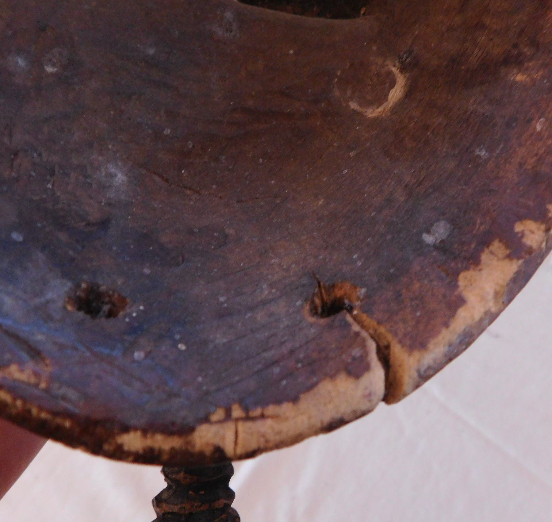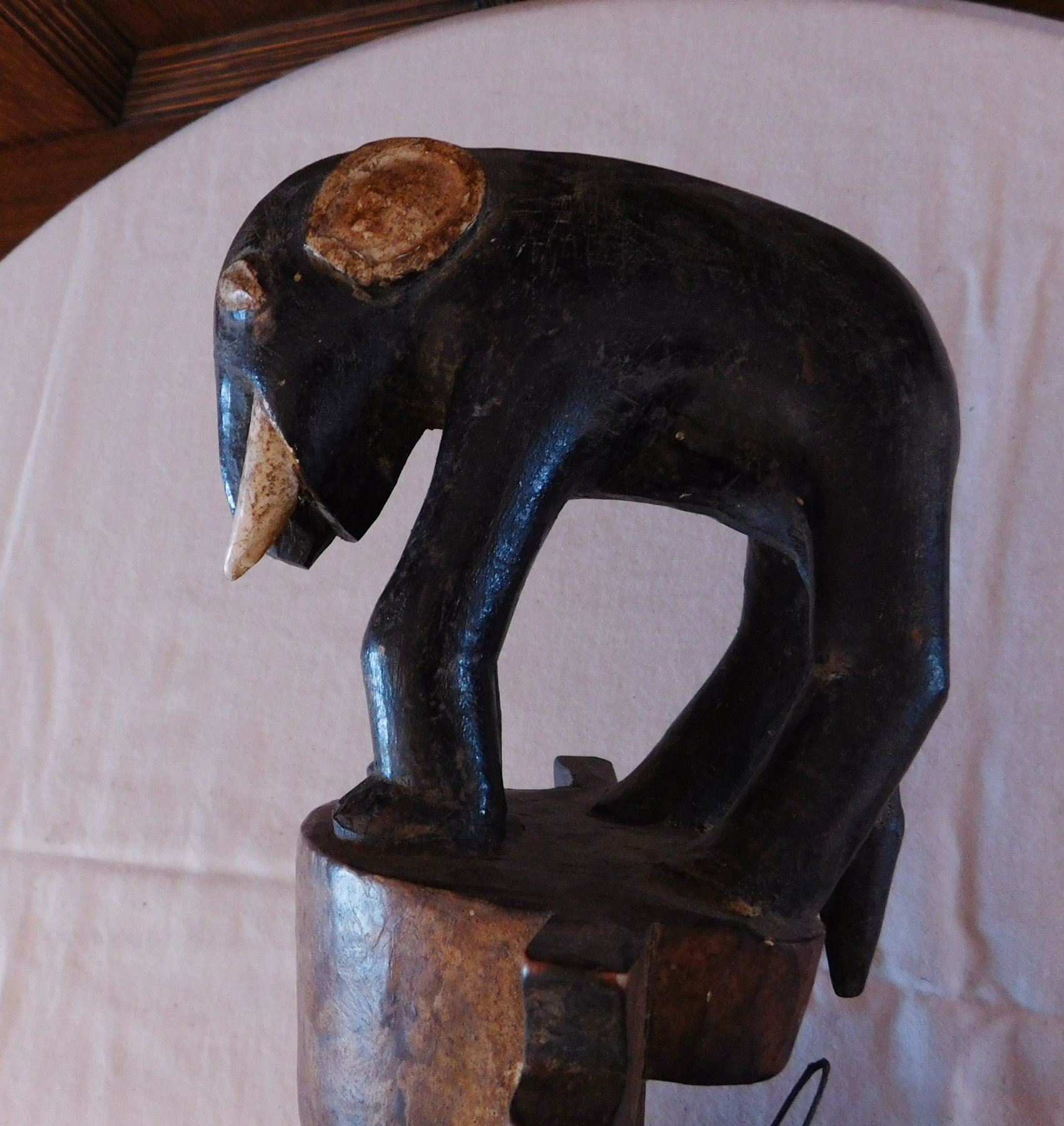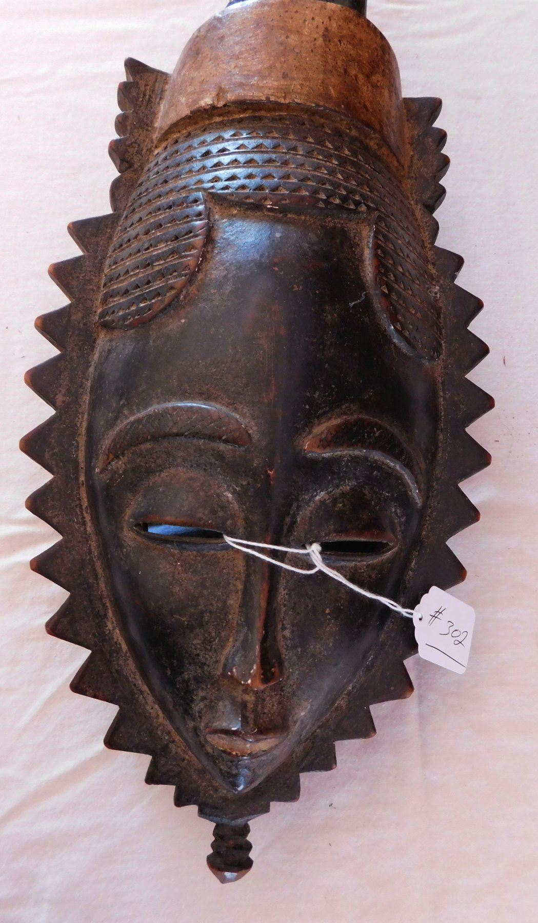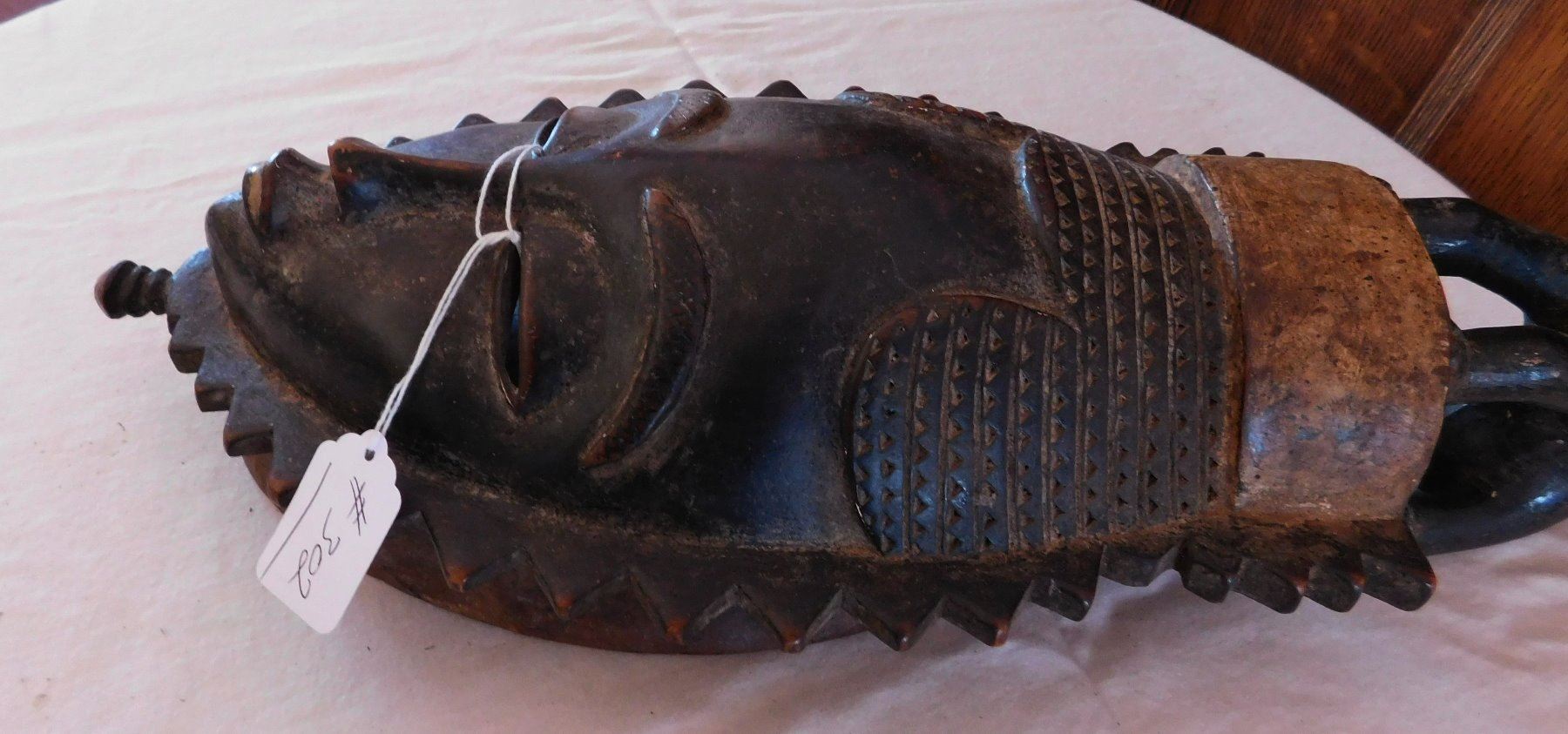 African Baule Mask, early 20th century. Made of hardwood and paint, the item measures 7 1/2" x 5 1/4" x 18 1/2". Baule tribe, Ivory Coast. Fantastic carving to upper portion of mask's face, wonderful elephant effigy. Condition: Great patina, minor cracks to mask and damage to elephant effigy, see images. Shipping: $30.00 w/insurance and signature, due to length.