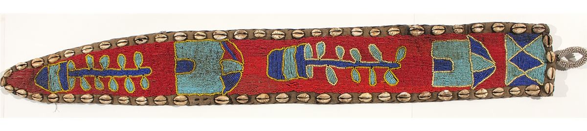 c1900 This is a fine example of bead working craft. This is a wall hanger art piece. Although it is similar in appearance to a beaded wall pocket, it has no pouches. This design incorporates seed beads in light blue, lavender, red and blue. It is bordered with cowry shells. Mounted on linen, the piece measures an impressive 38”x 5” at its widest point. - HKA#65236