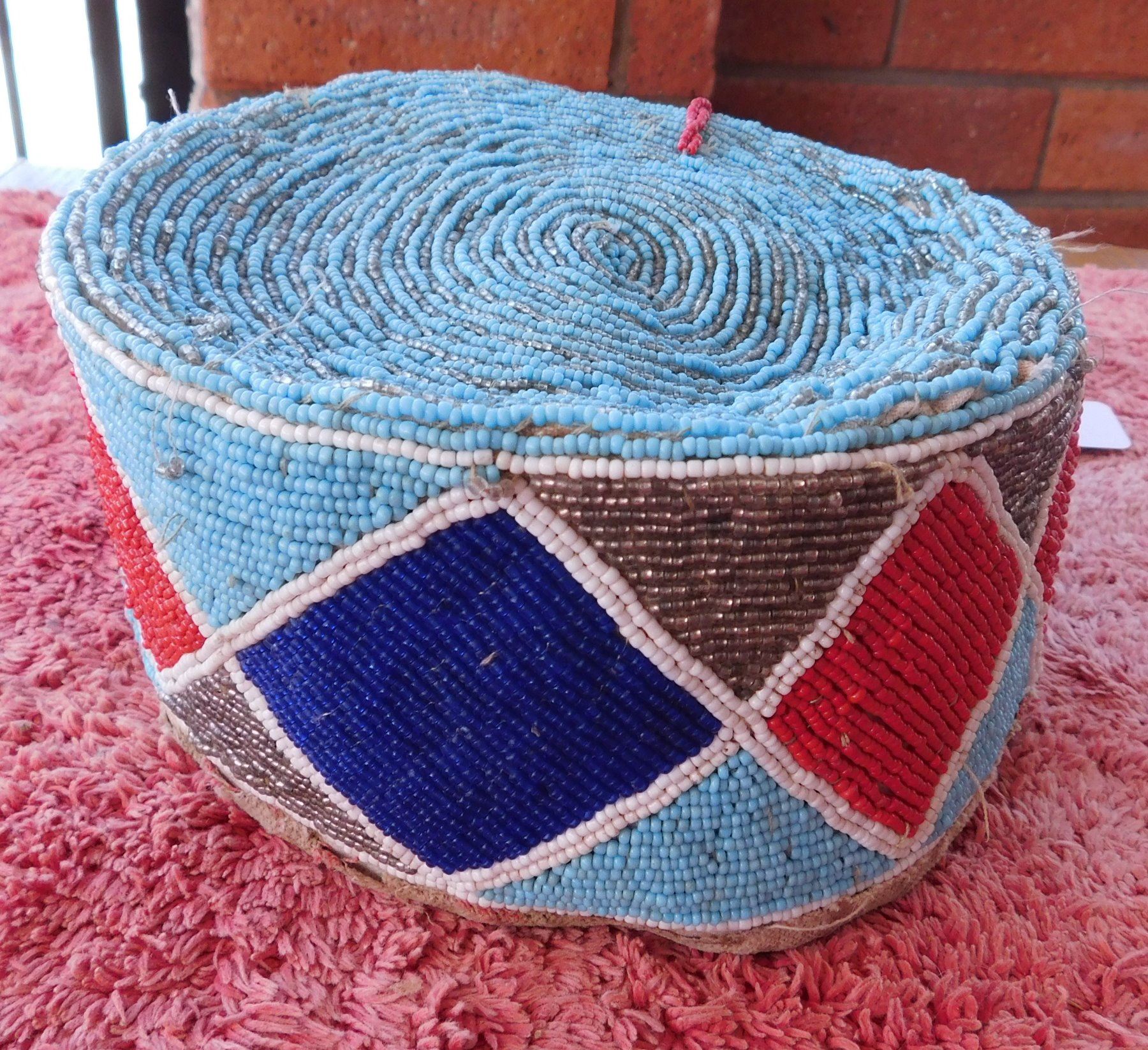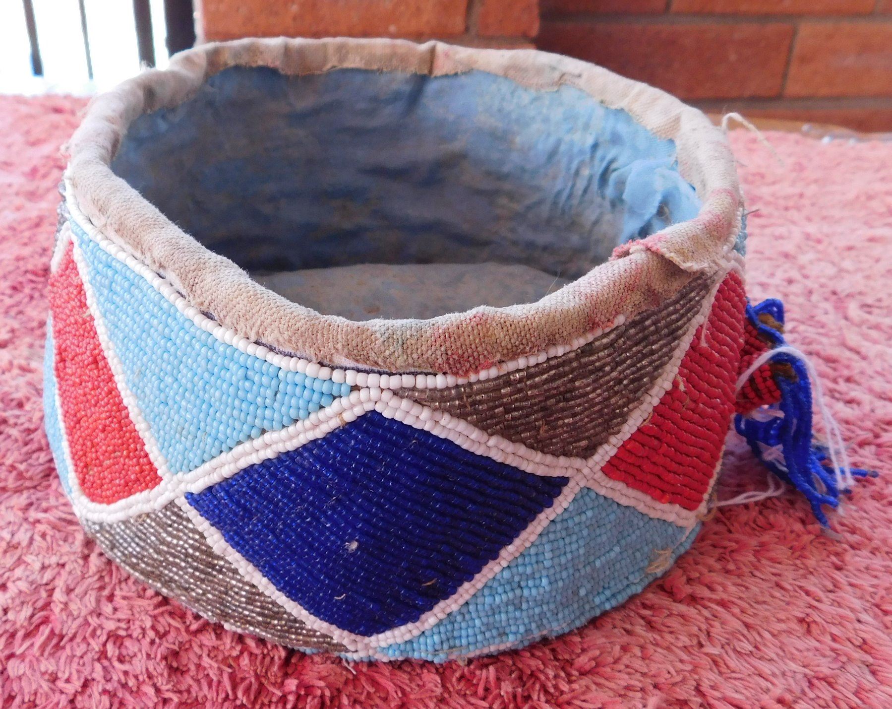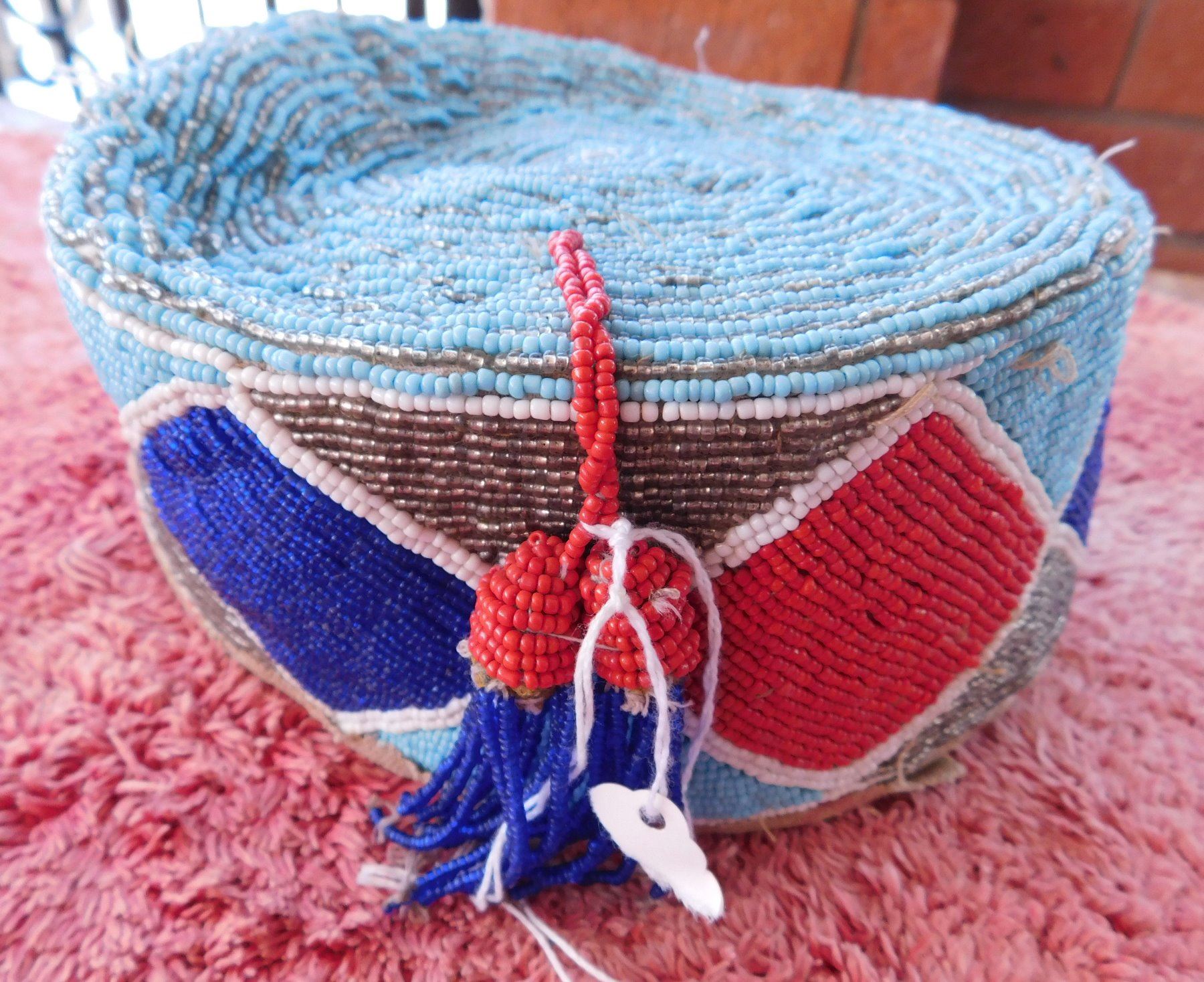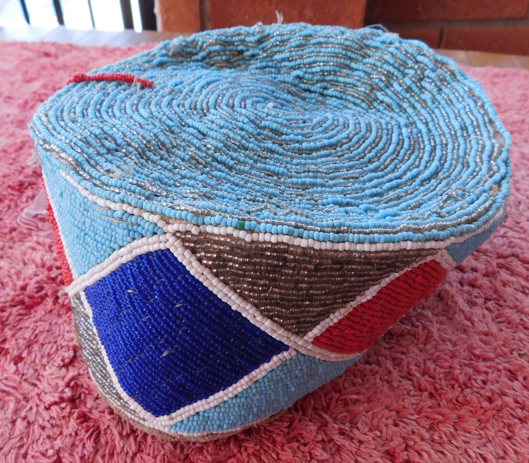 African Beaded Hat, c. 1940s. Made of cloth and glass, the item measures 7 1/4" x 7 1/8" x 3 1/2". Africa. Red, dark and light blue, gray beads. Condition: Some wear, see images. Shipping: $20.00 w/insurance and signature.