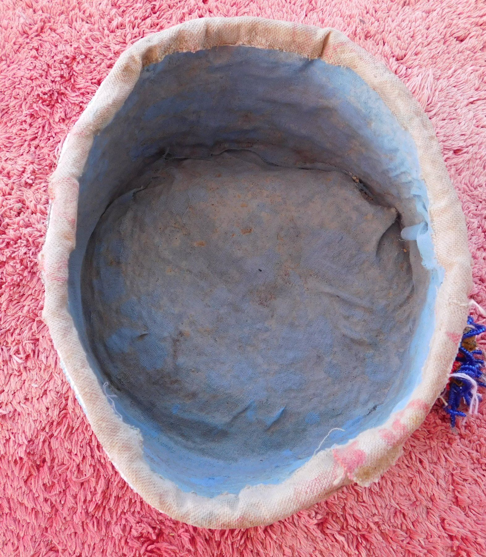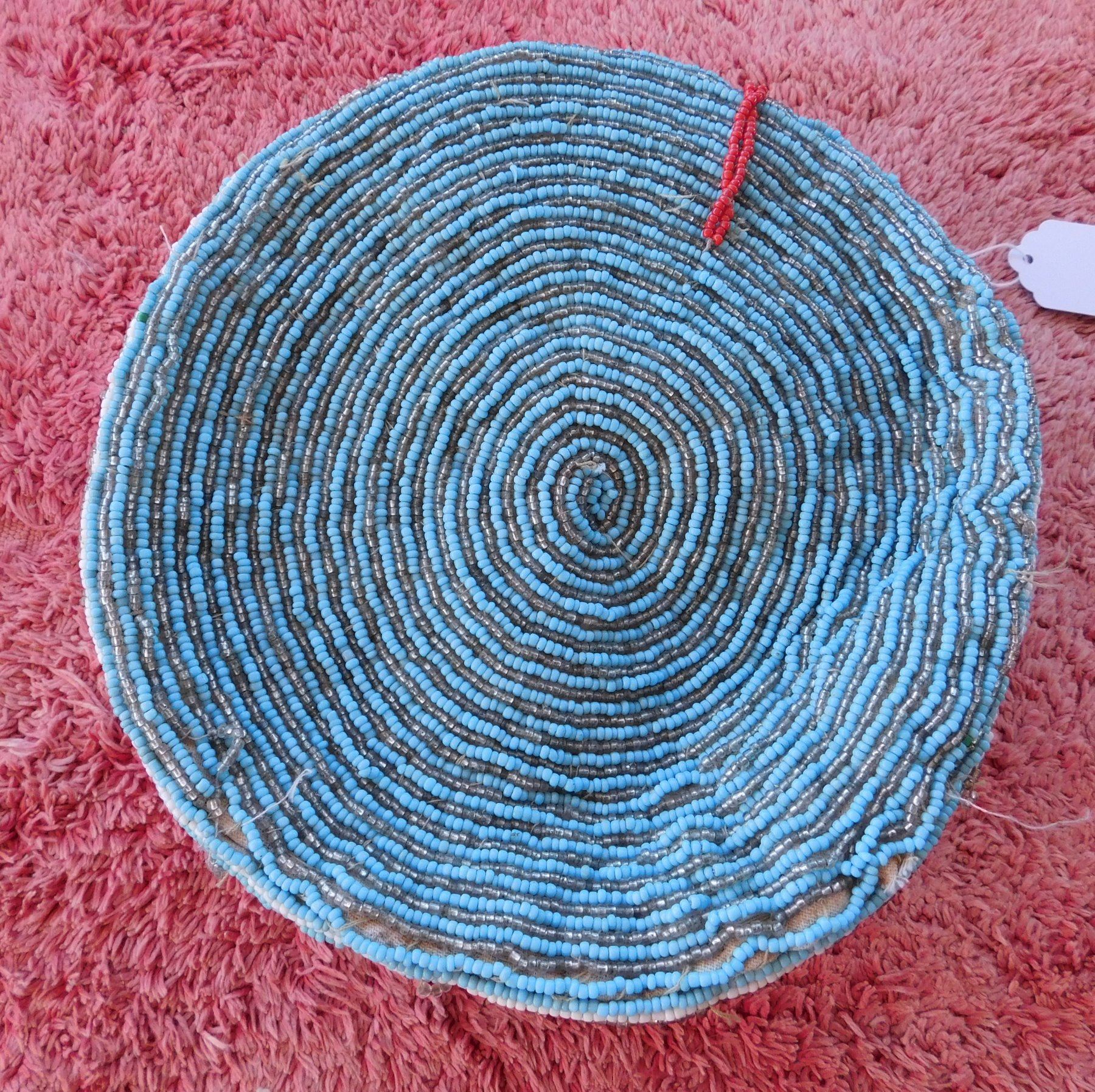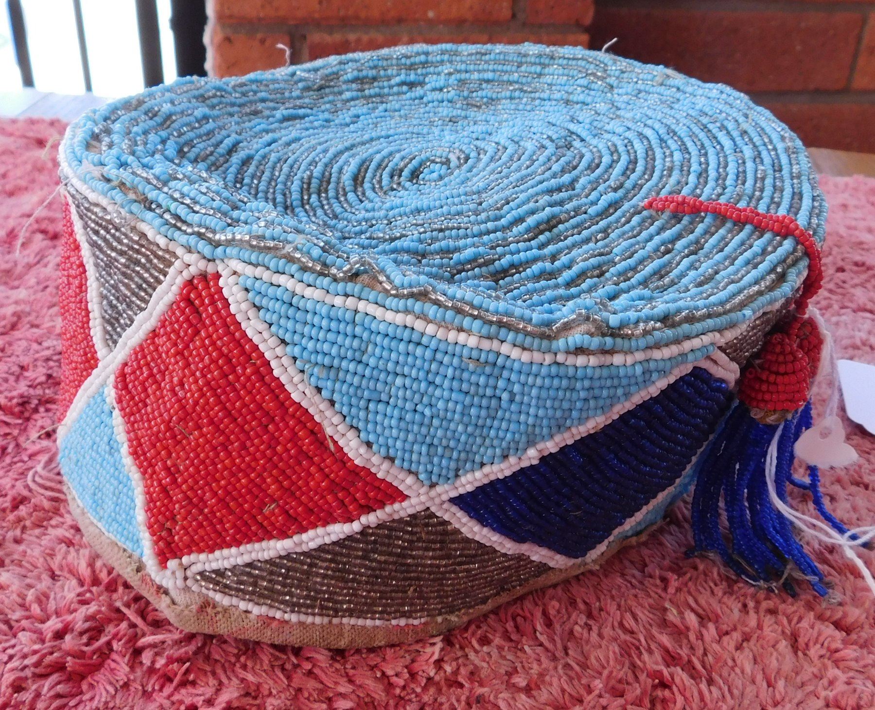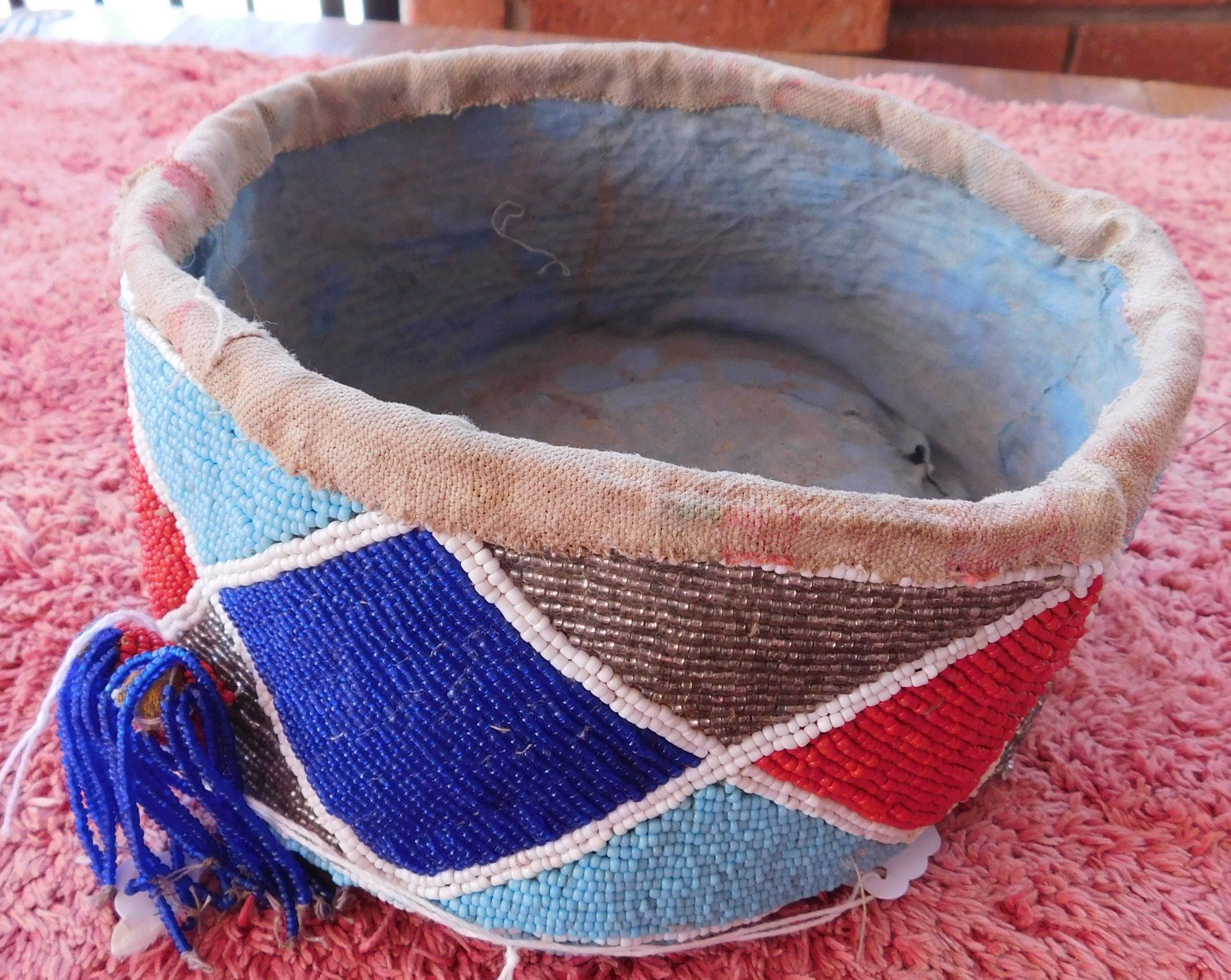 African Beaded Hat, c. 1940s. Made of cloth and glass, the item measures 7 1/4" x 7 1/8" x 3 1/2". Africa. Red, dark and light blue, gray beads. Condition: Some wear, see images. Shipping: $20.00 w/insurance and signature.