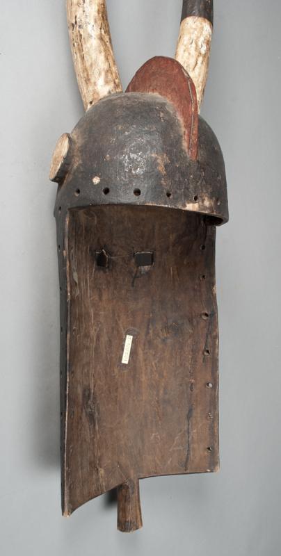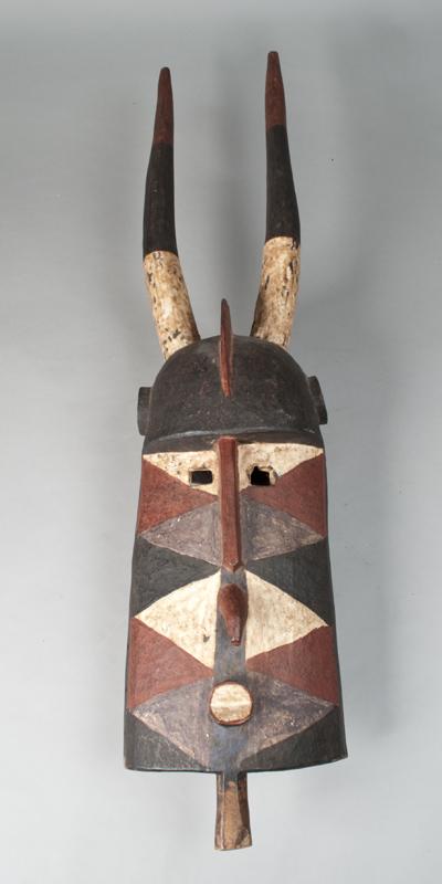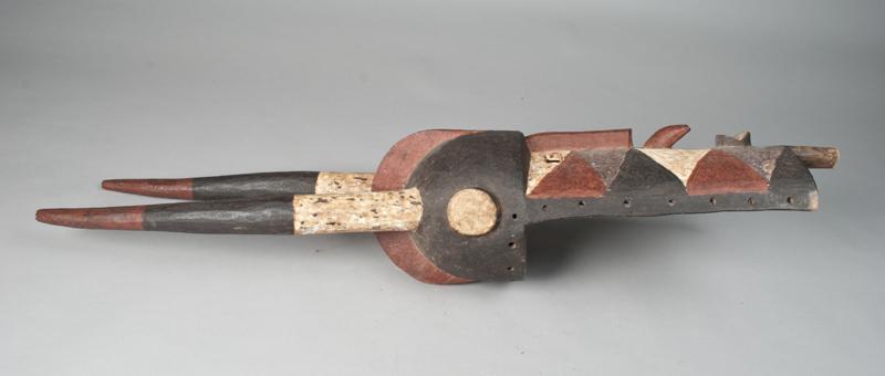 Large carved mask with horns, helmet and geometric paint in red, white, black and gray. The Bobo have lived in the region for centuries, with some estimates dating back to 800 A.D. It is generally believed that they moved into this area from the north. One of the primary reasons for this thinking is that they speak a language considered to be part of the Mande family, which originates to the north in Mali. Throughout the history of the region, other peoples, like the Zara, have also moved into the area, influencing the Bobo and sometimes being either partially or wholly absorbed into Bobo agricultural society. 41.75" L x 10.25" W, minor wear consistent with age. Mid. 20th century.