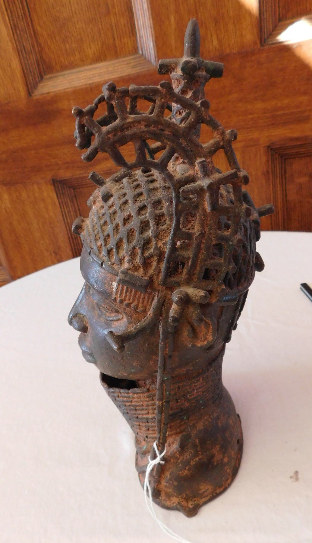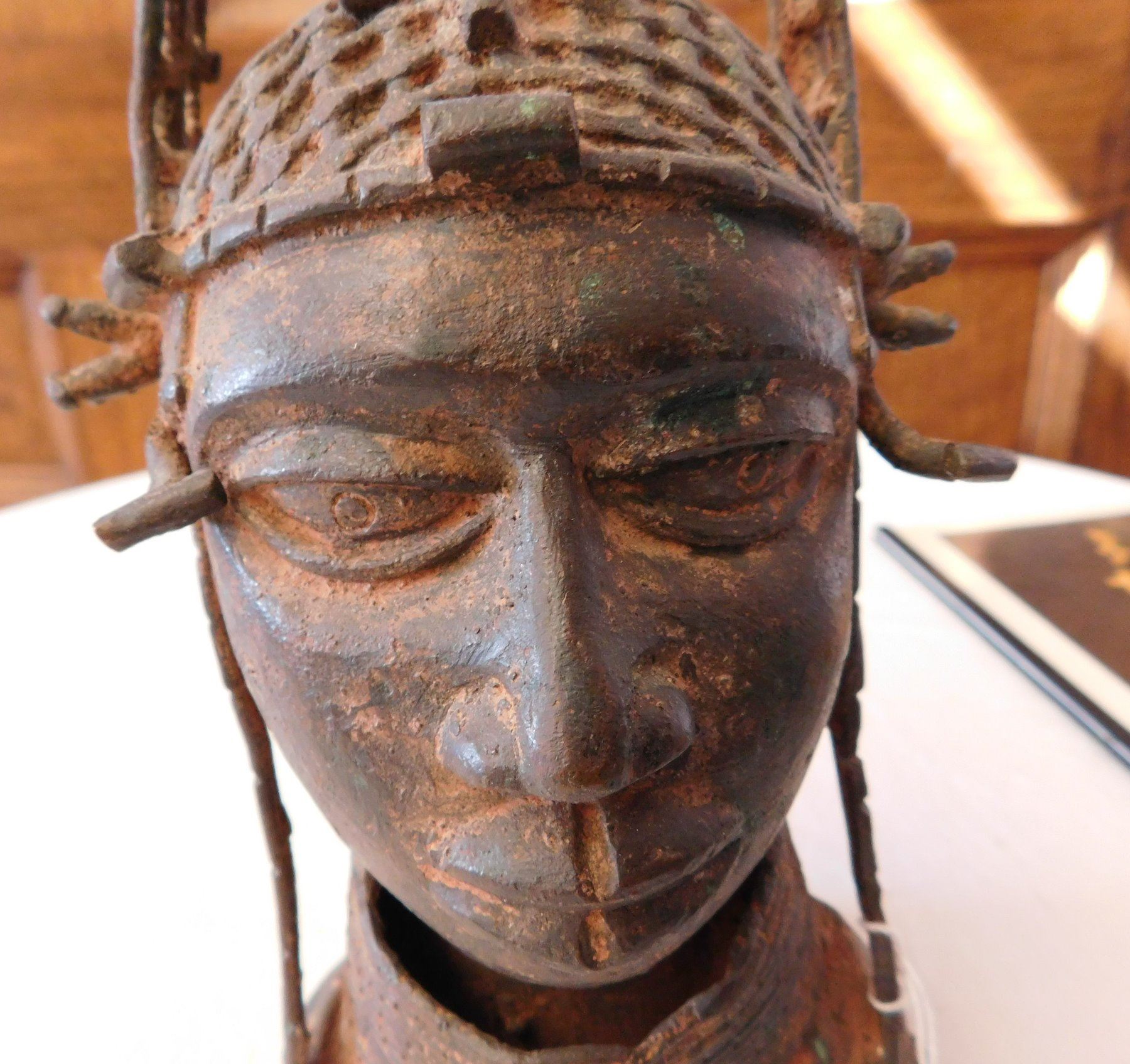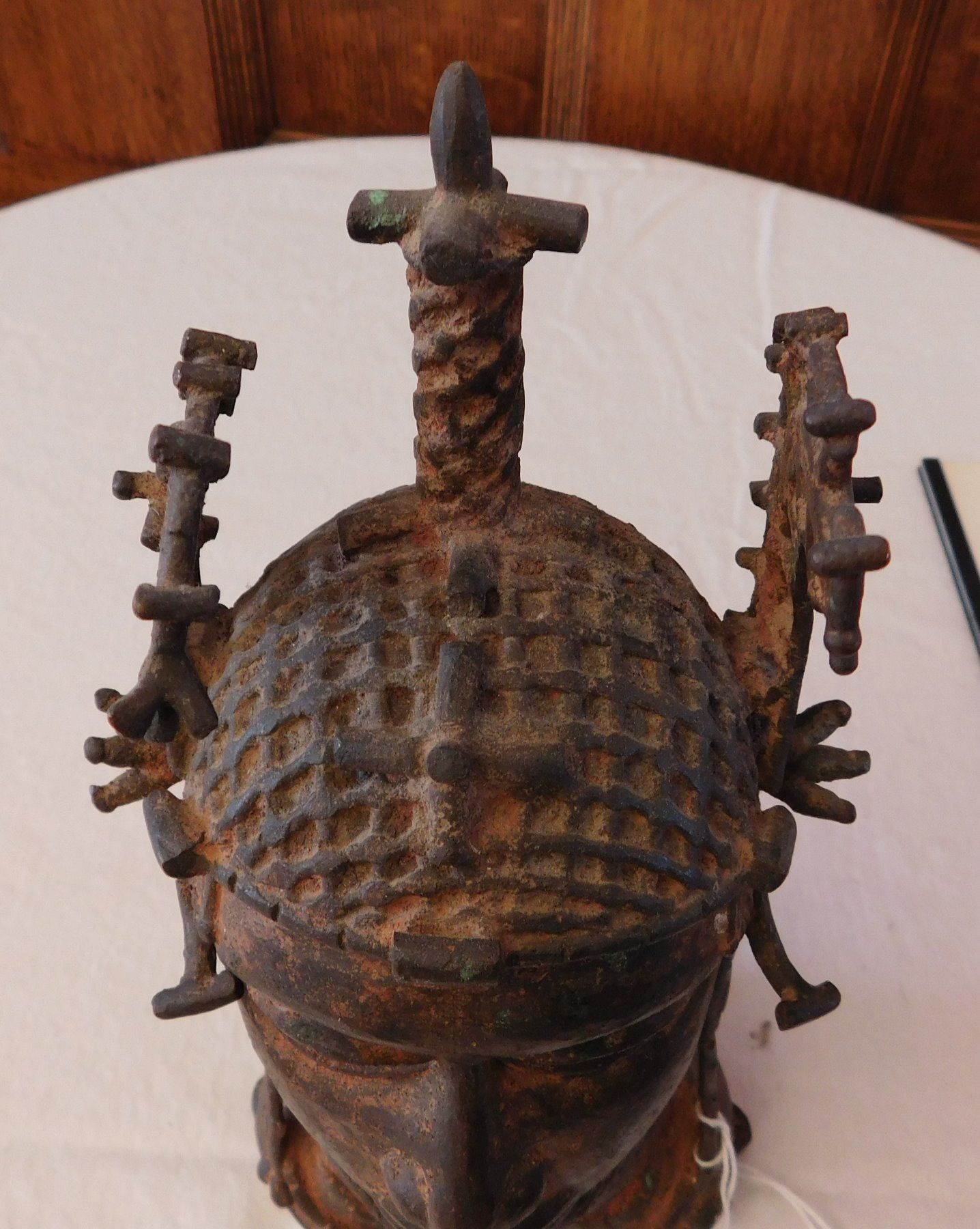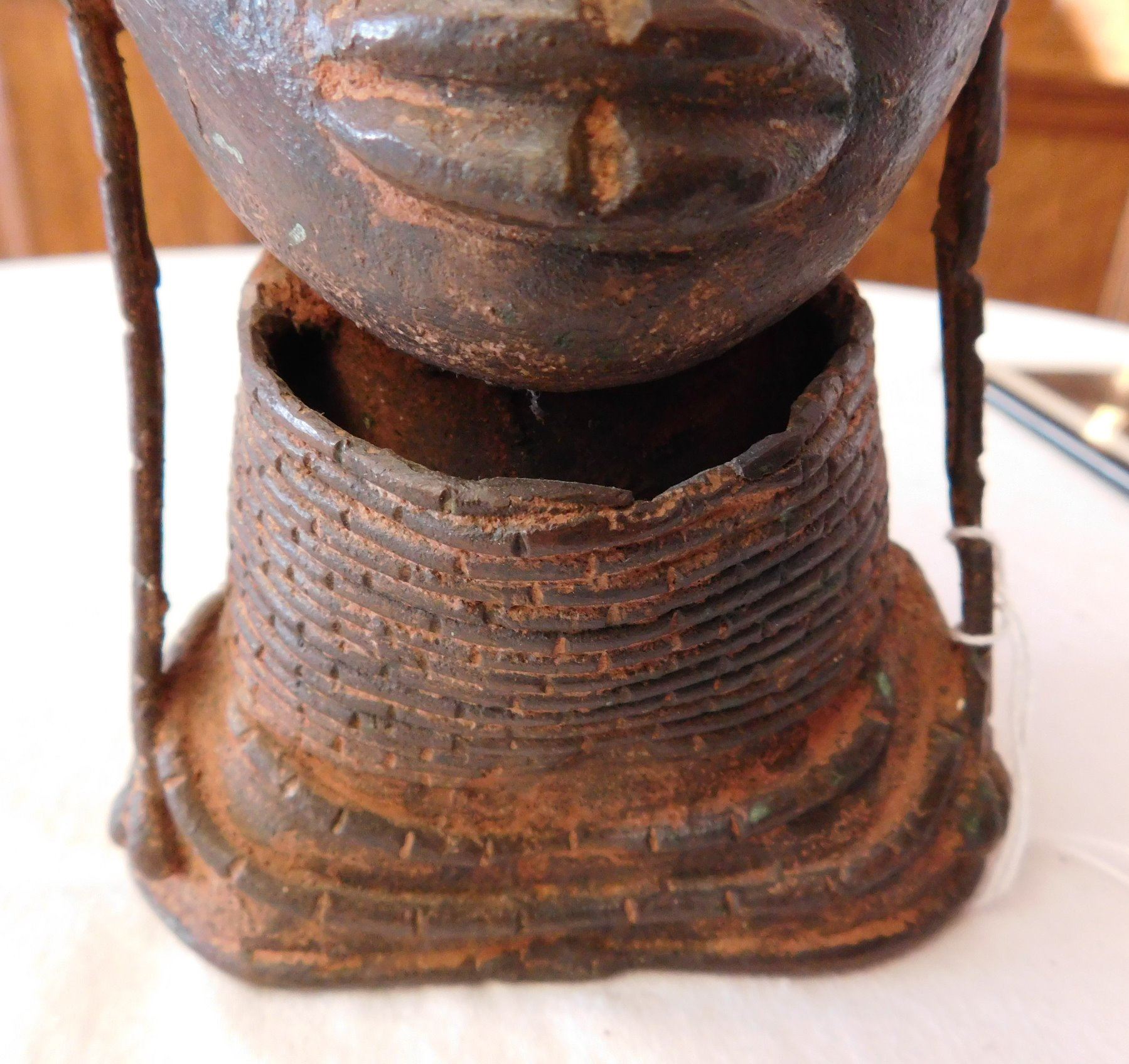 African Bronze Bust w/Report-COA, mid 19th century item. Made of copper alloy, this bronze measures 9" x 4" x 3". Benin, Nigeria. Orenda Labs, Frank Aon authenticity report. Buy with confidence. Condition: Good, great patina, see images. Shipping: $60.00 w/insurance and signature, due to size and value.