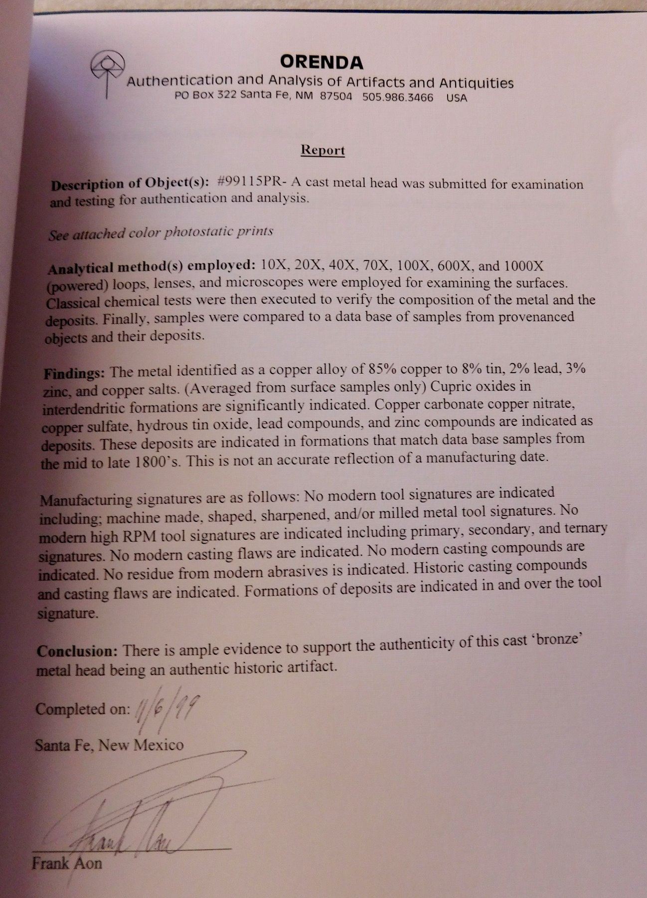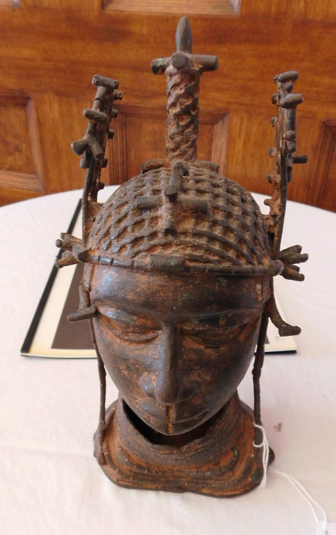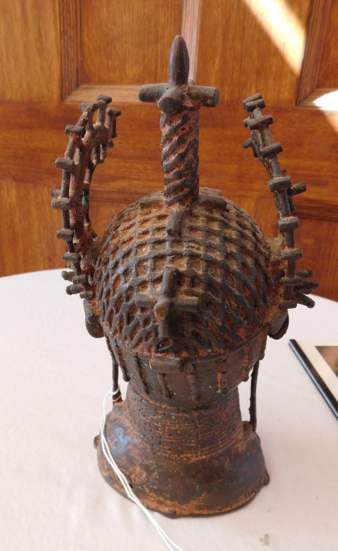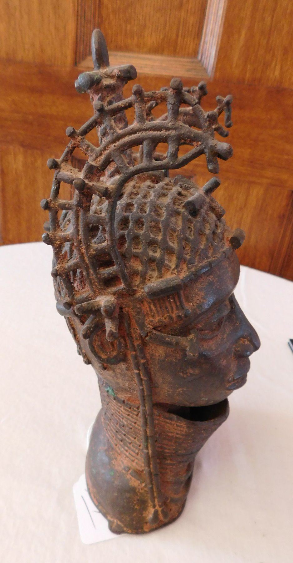 African Bronze Bust w/Report-COA, mid 19th century item. Made of copper alloy, this bronze measures 9" x 4" x 3". Benin, Nigeria. Orenda Labs, Frank Aon authenticity report. Buy with confidence. Condition: Good, great patina, see images. Shipping: $60.00 w/insurance and signature, due to size and value.