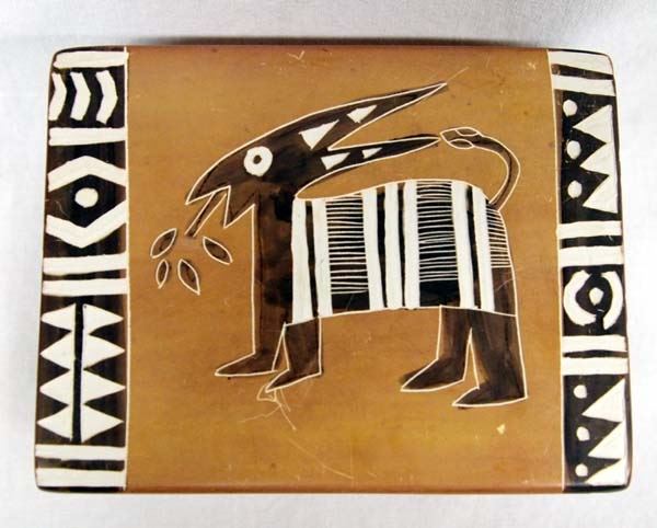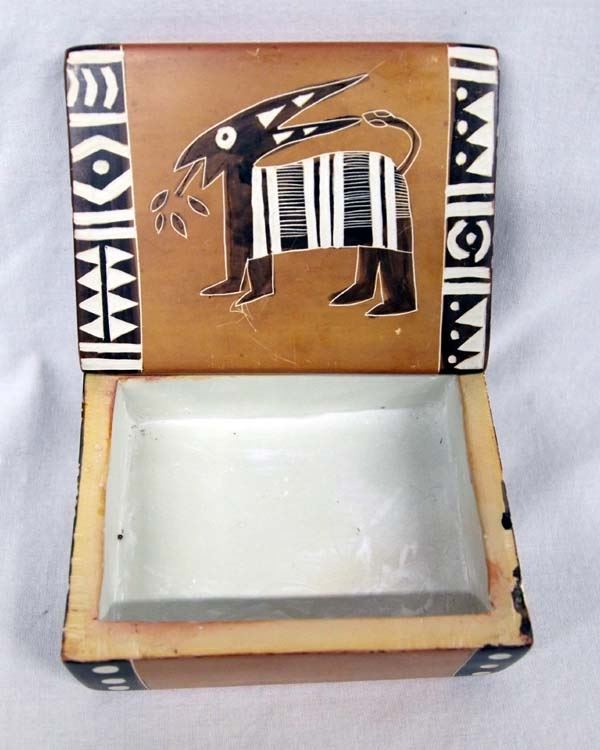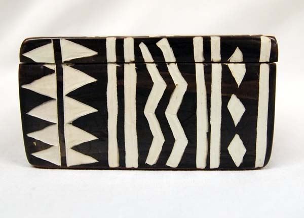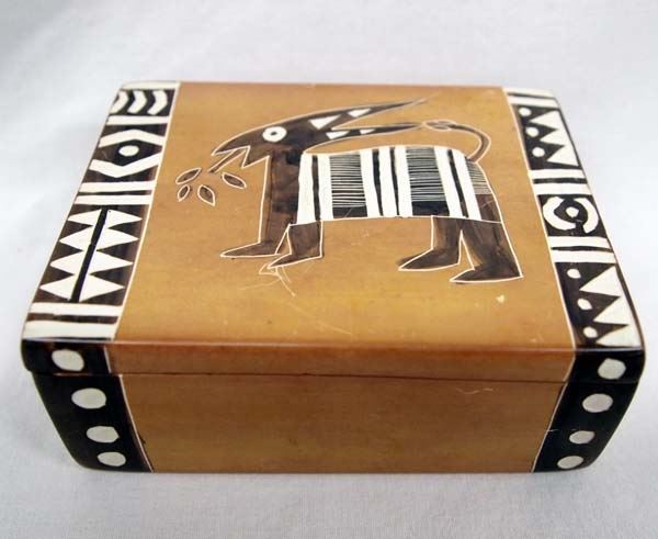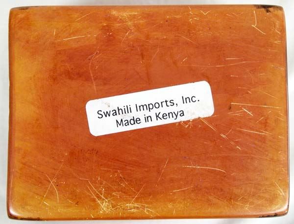 African Carved Alabaster Lidded Box, measures 4''L x 3''W x 1.5''H, paper label on bottom reads ''Swahili Imports, Inc. Made in Kenya''