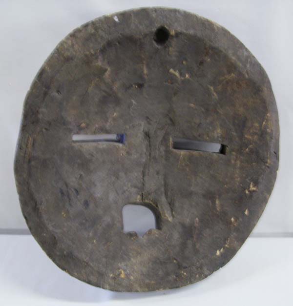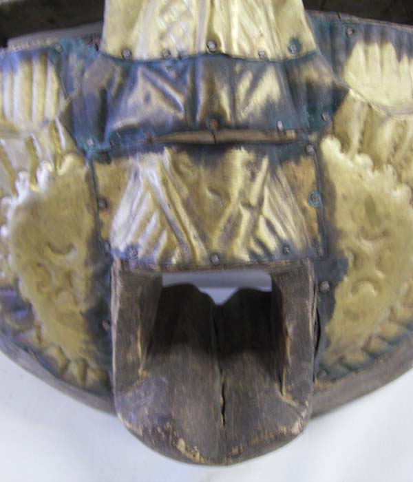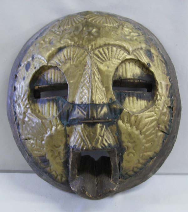 African carved wood and metal mask. The metal is hammered and tooled over the mask. 4'' W x 9.5'' H. Buyers pay actual shipping and handling charges (see terms and conditions for further information).