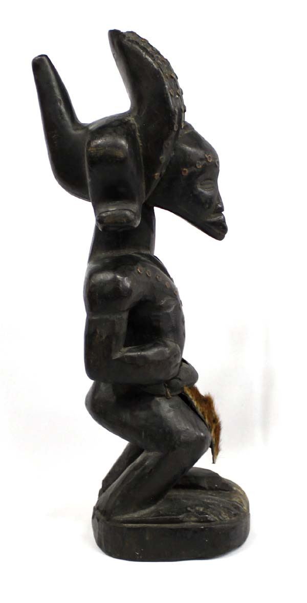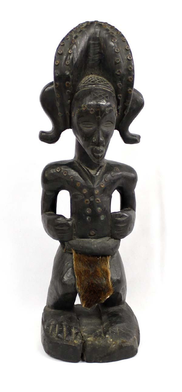 African Carved Wood Statue, measures 16.25'' x 5.5''W x 6.25'', wearing hide and fur loincloth, and has copper ring embellishments