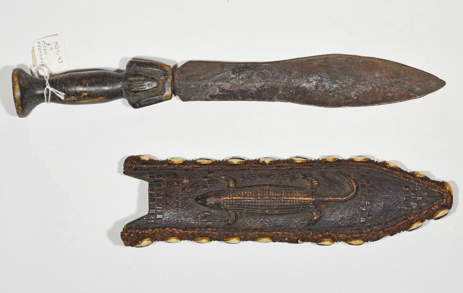 Description: Congo (?), Zande Tribe, Knife in Sheath with crocodile design, Opitz pp. 180,186; Ceremonial Knife with Sickle Blade. 2 pcs.