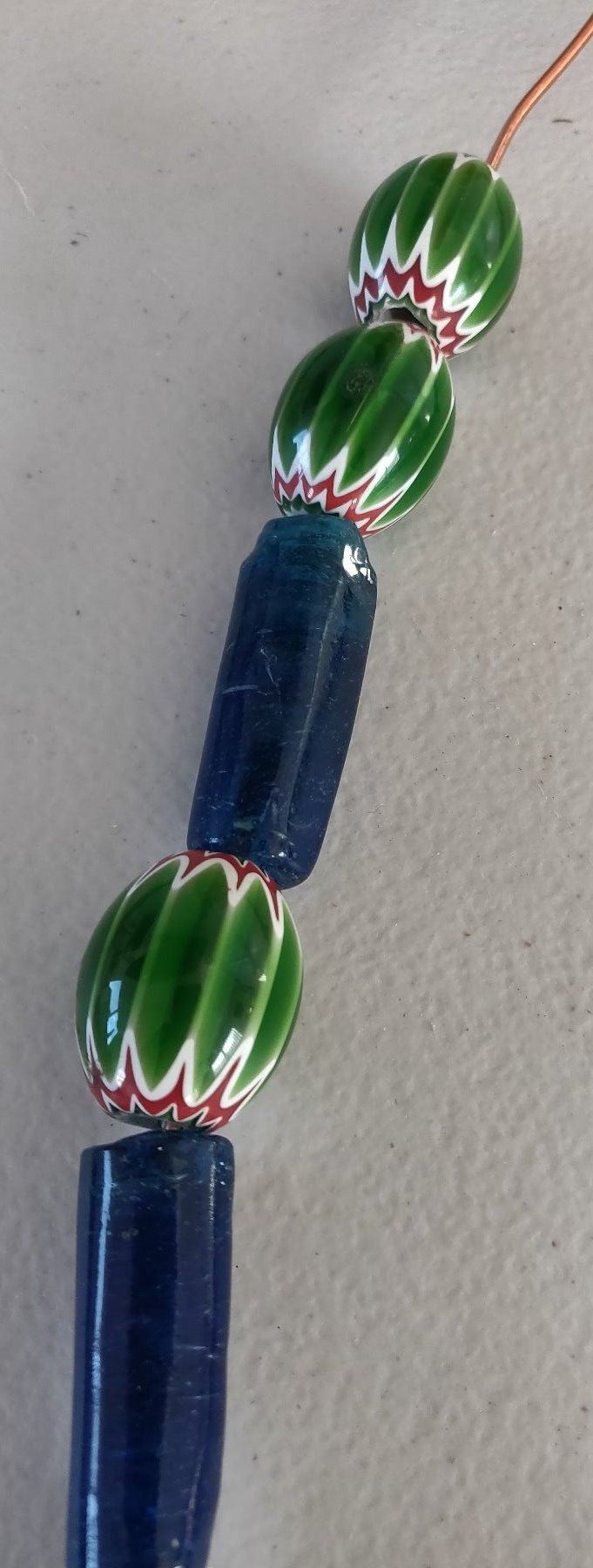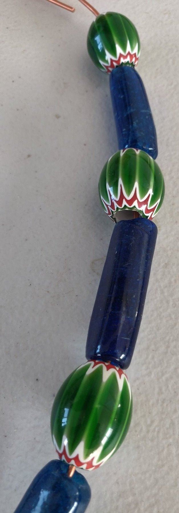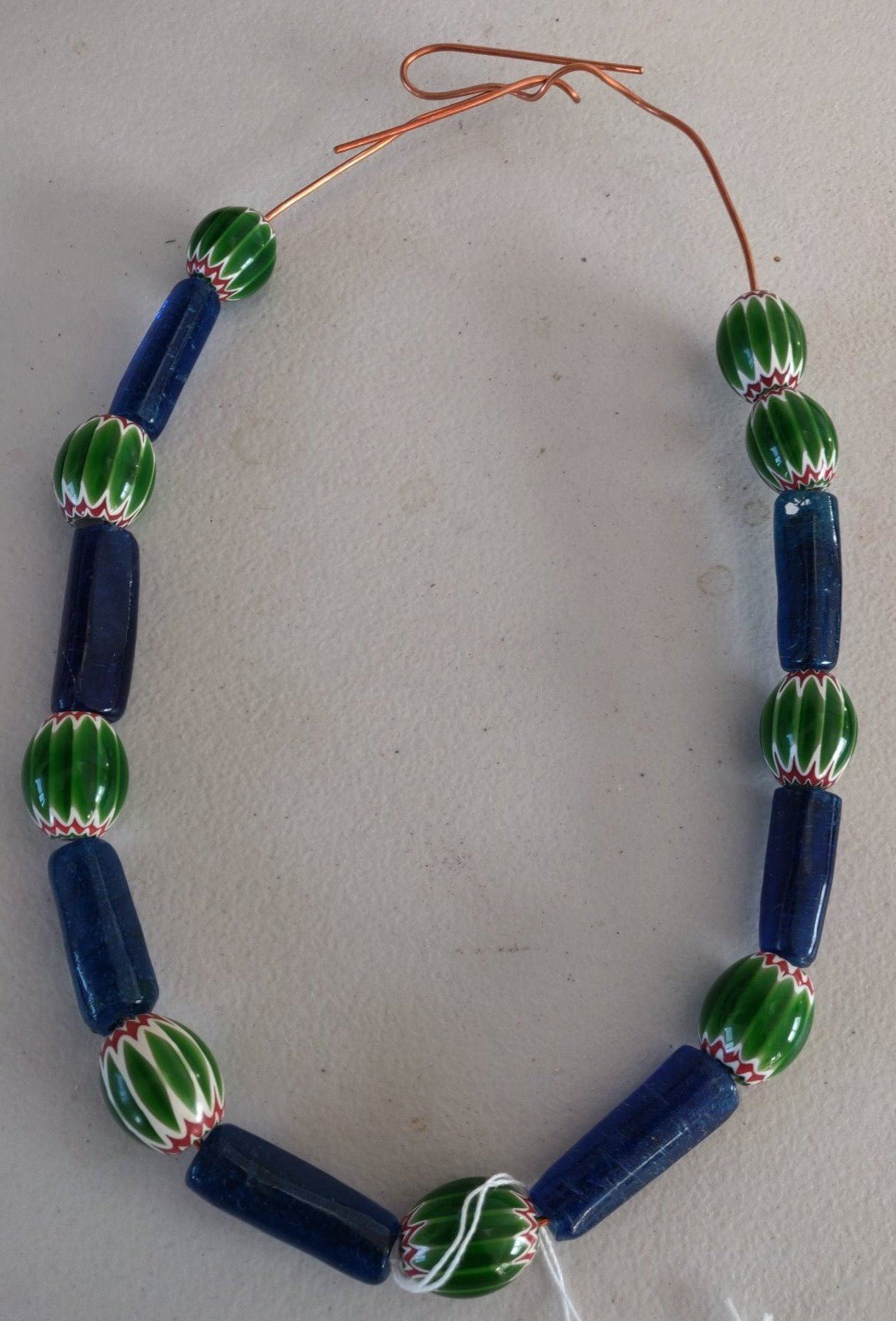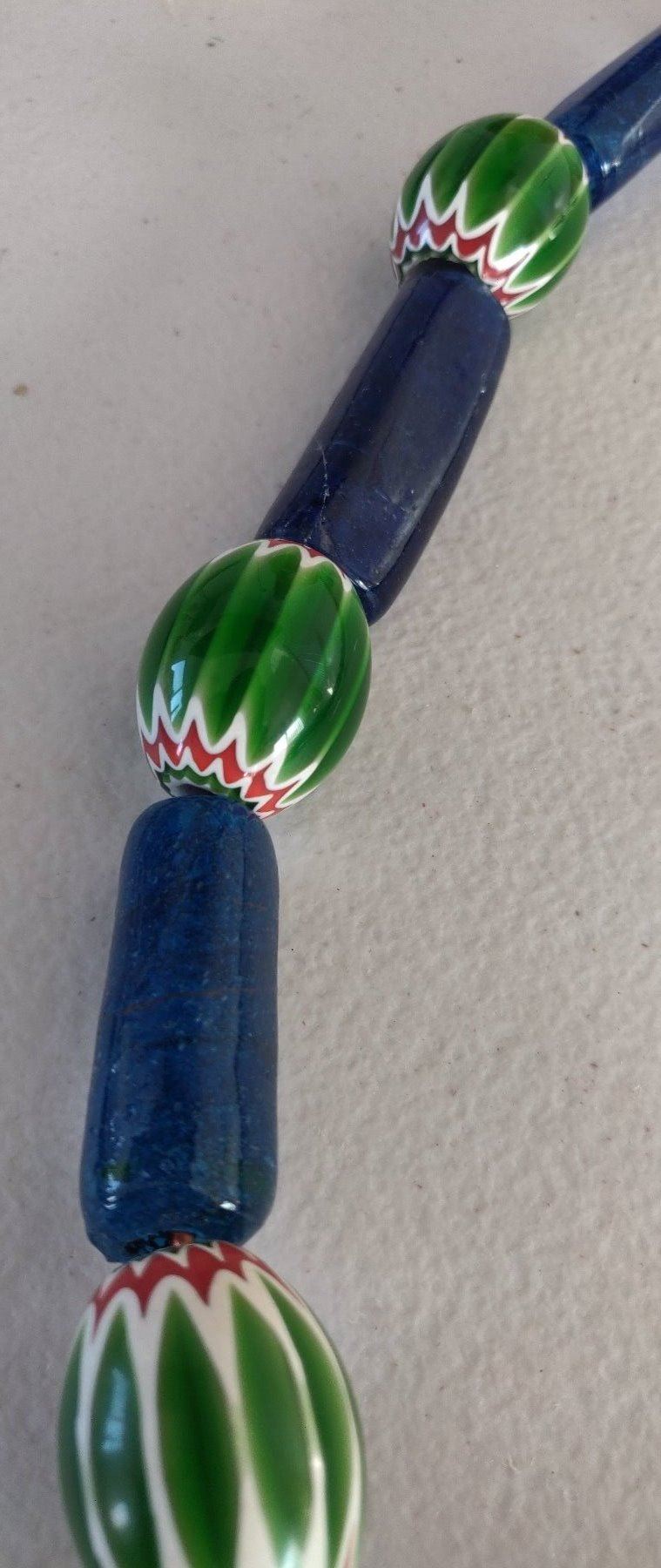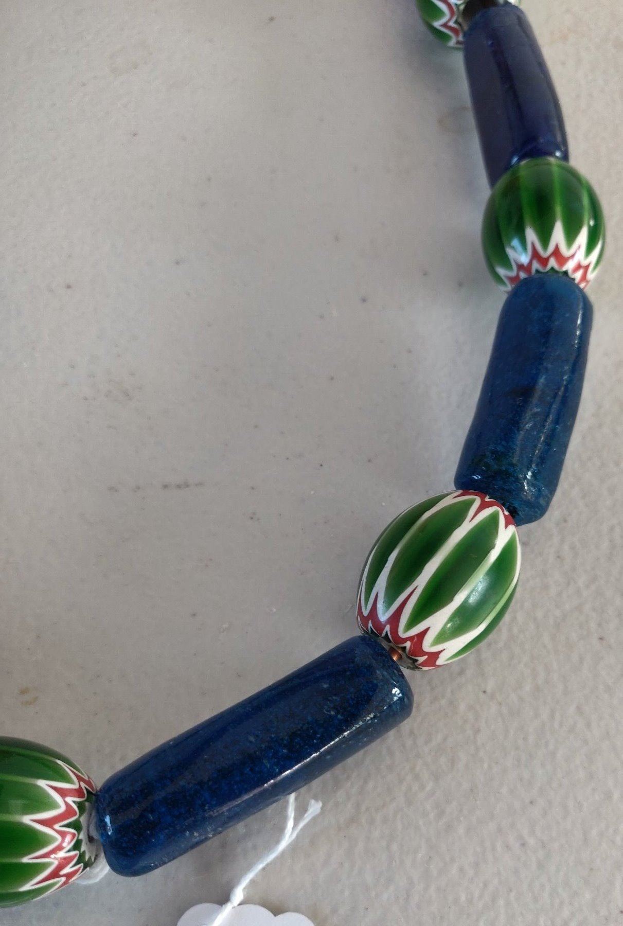 African Chevron Necklace, c. 1800s. Made of glass, the item measures 20" x 1" x 2". Africa. 6-layer green beads, cobalt beads as well. Condition: Good, see images. Shipping: $20.00 w/insurance and signature.