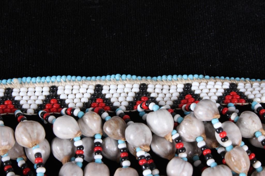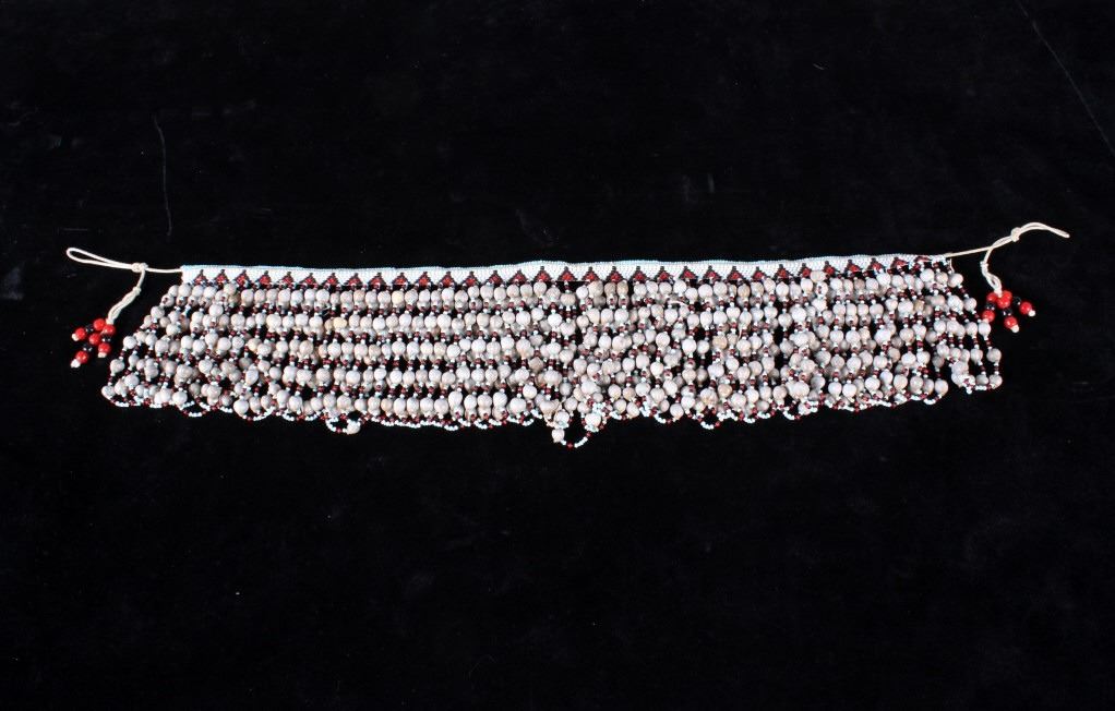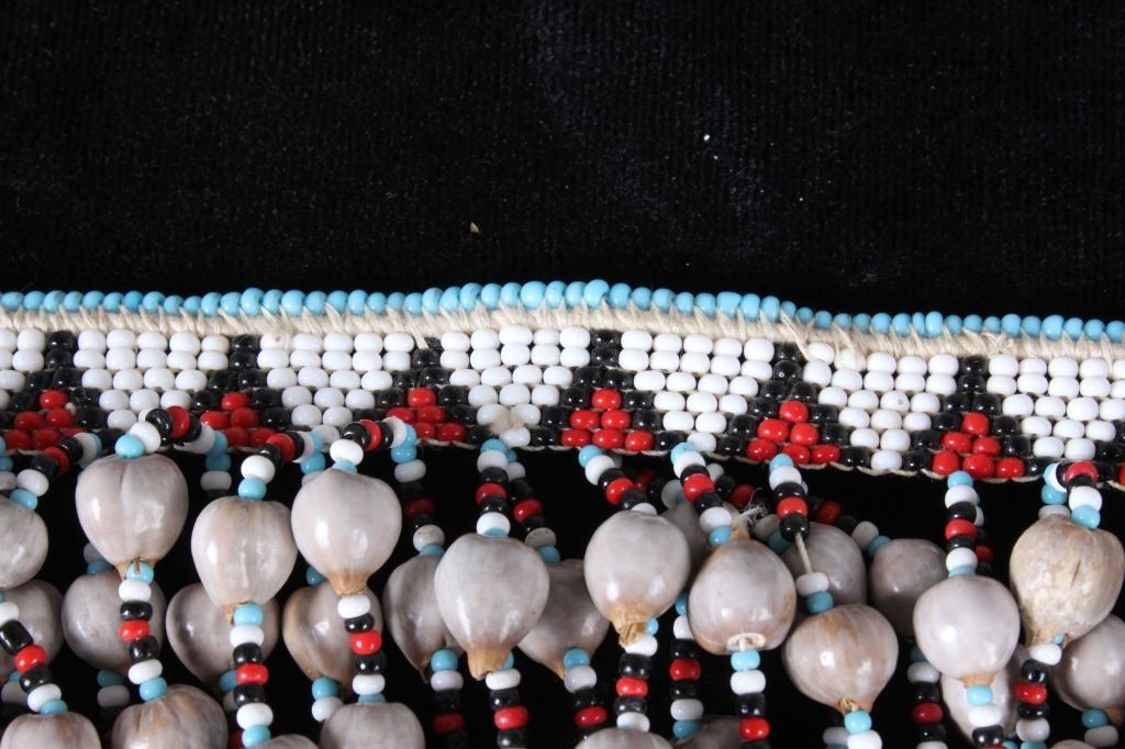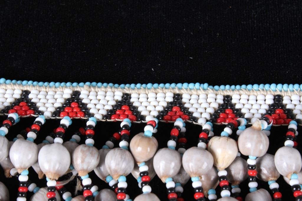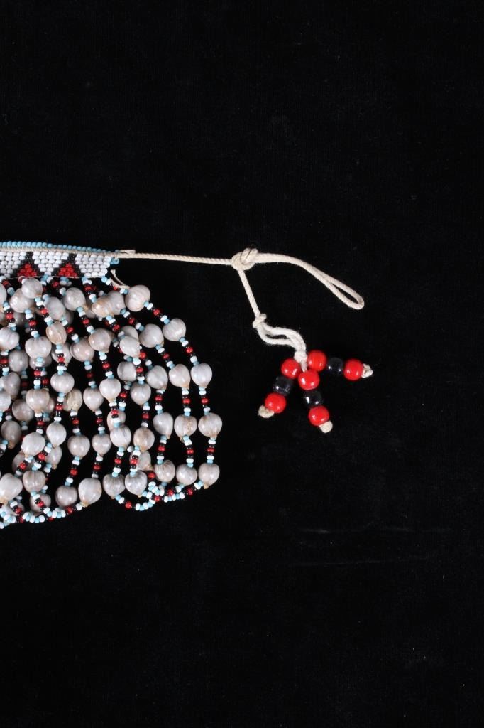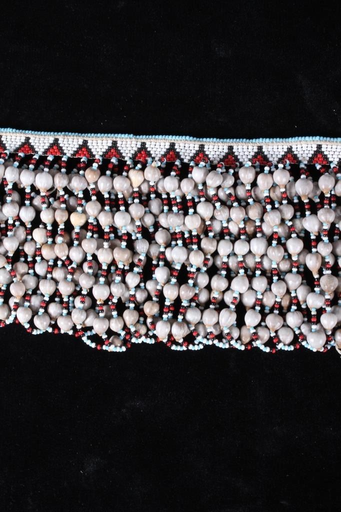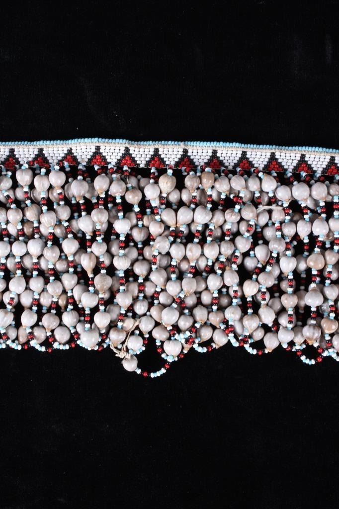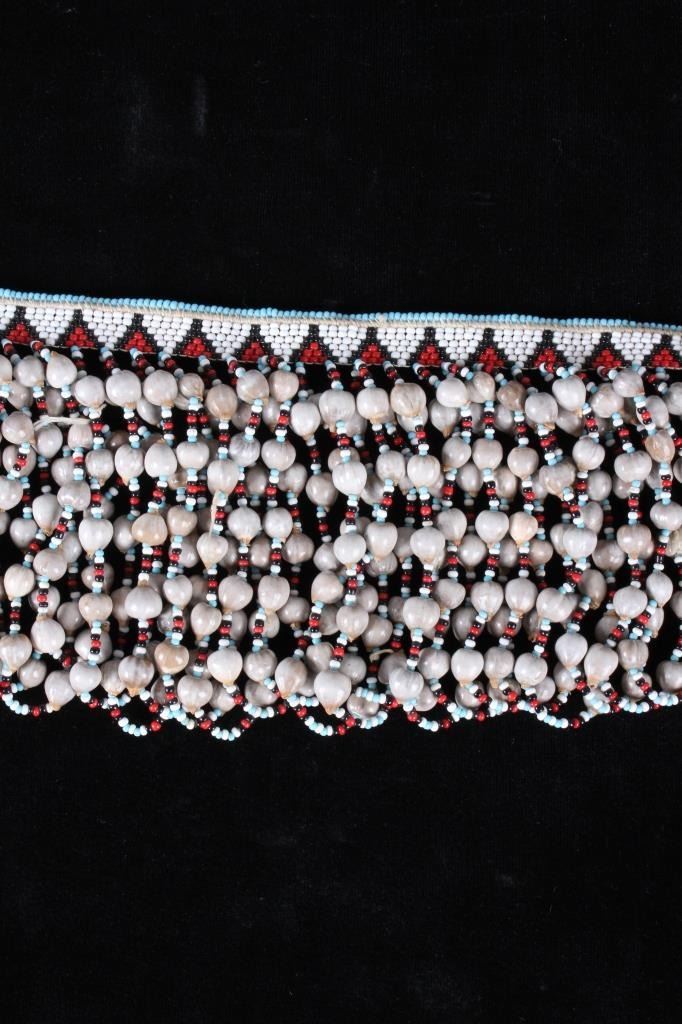 The lot features an African Tribal belt from the Coastal people and dating to circa 1930’s. The belt shows a glass trade bead on a thick carpet thread with fringe which shows glass trade beads and shells. The ends of the belt show larger red and black trade beads which act as ties. The piece displays very well and is in well preserved condition. Provenance: From the private family collection of Sarah Alling of Helena, Montana. The family collection of Sarah Alling, a 5th Generation Montanan, began in the 19th Century and has grown since. Along with being an avid collector herself, Sarah co-founded with Bruce VanLandingham Sundog Fine Art of Bozeman, Montana which was both part museum and gallery. Measures overall 29”L by 4.25”W.