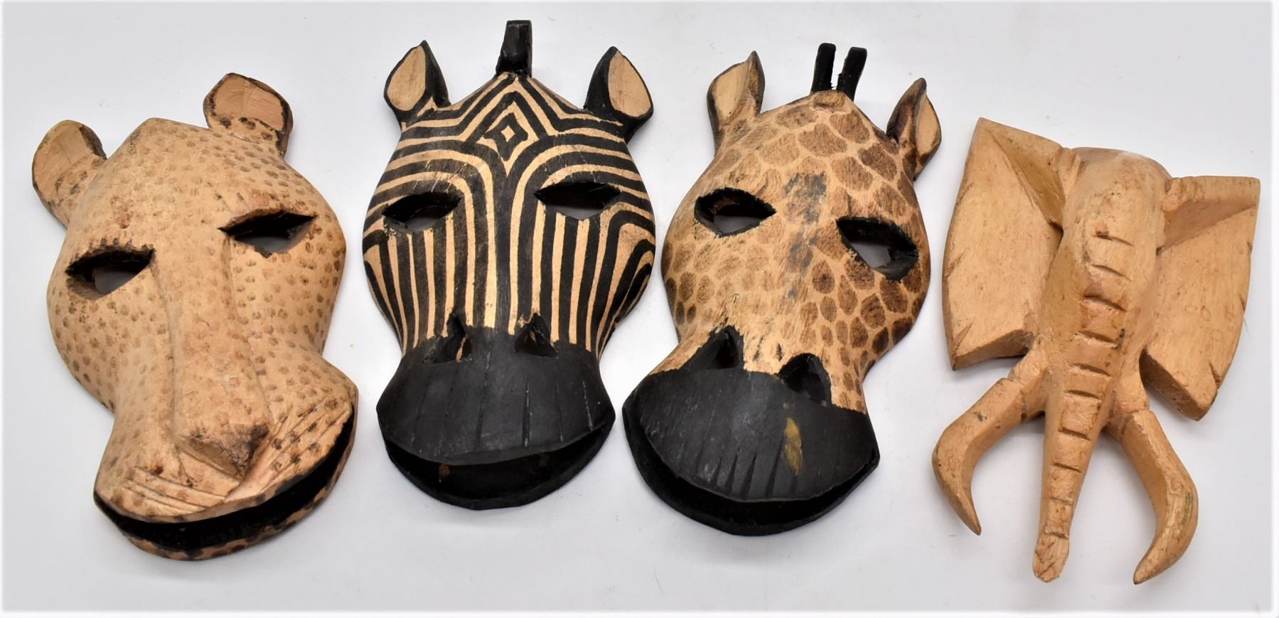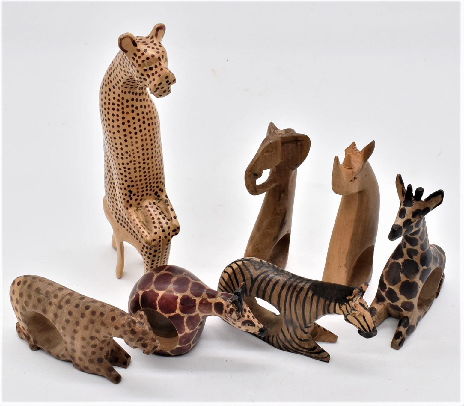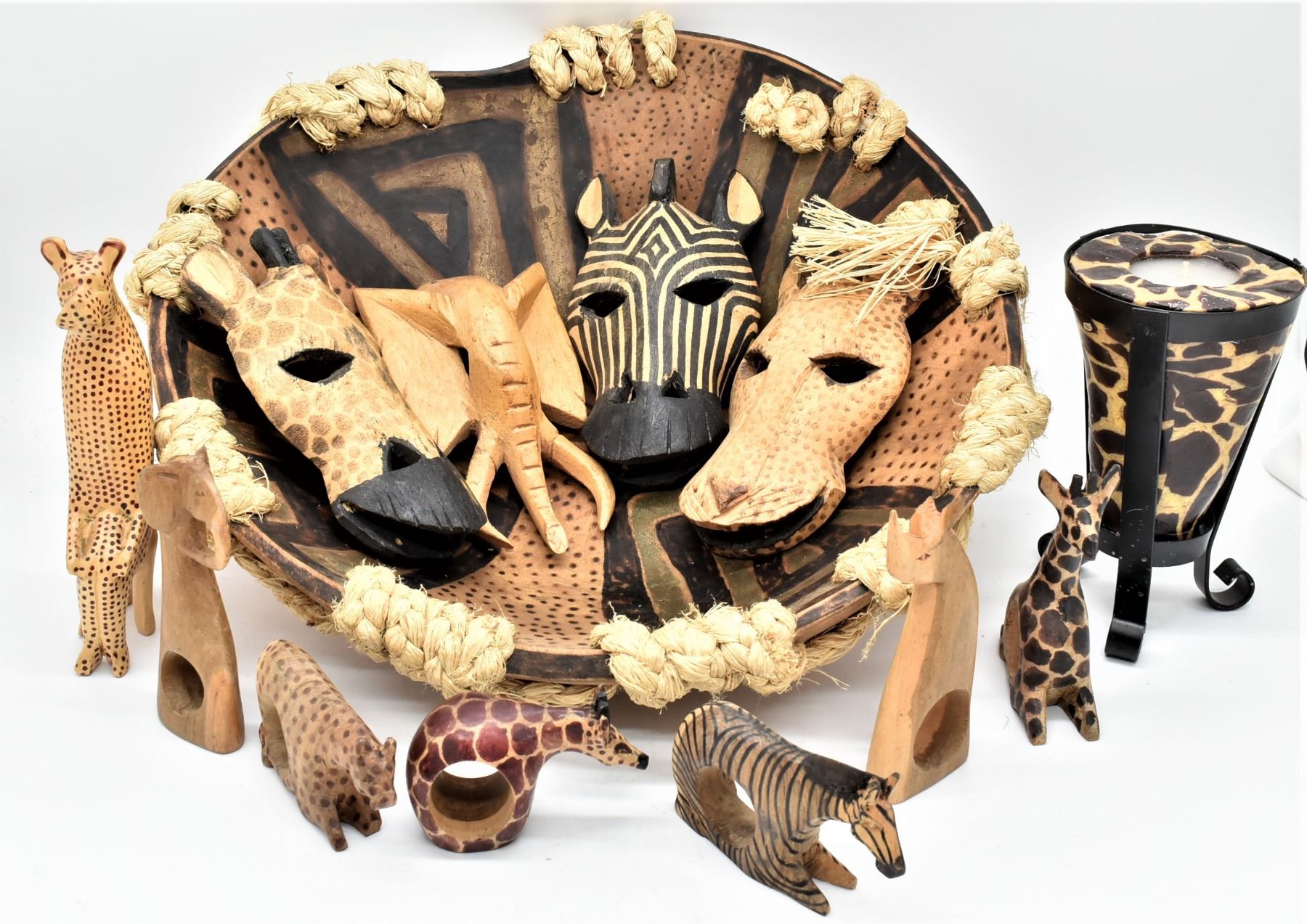 African Collectibles, most are carved wood, includes large wood bowl, 4 wood masks, candle in metal stand, 6 wood napkin rings, and 1 seated wood jaguar, bowl is the largest measuring 16''D x 5''H