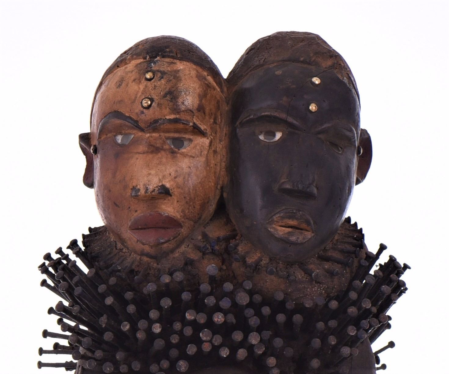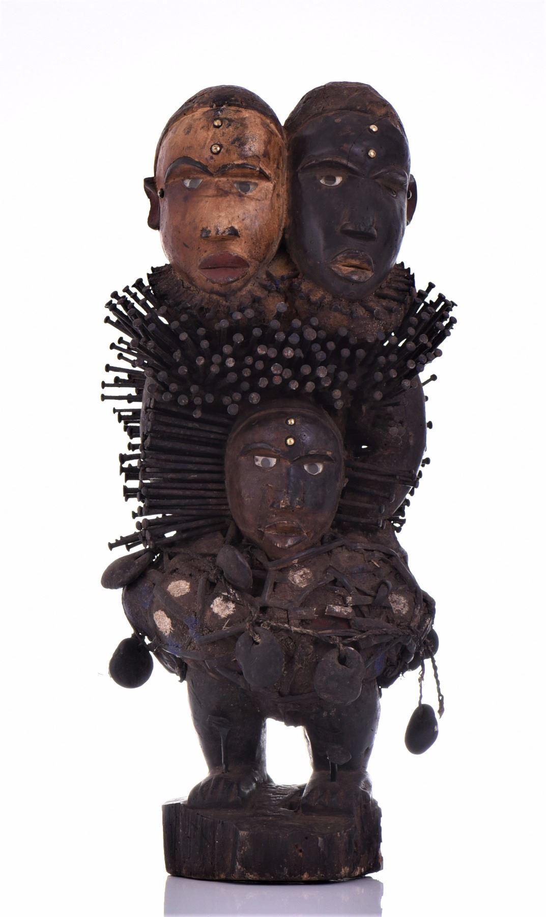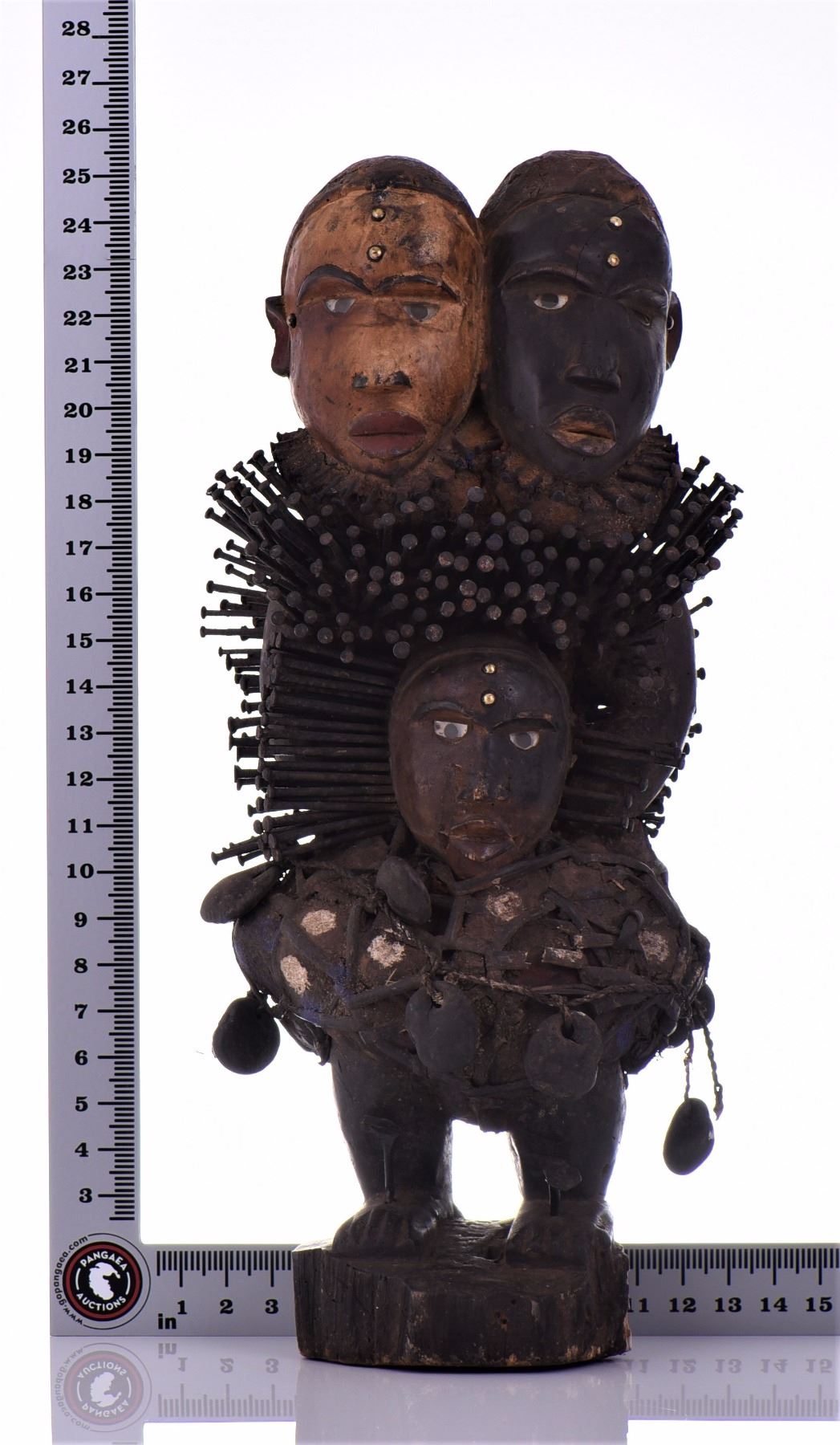 African Congo Yombe Nail Power Figure Fetish, Congo. Provenance: Ethnographic Tribal Museum Collection (See Auction Catalog Description). Some Lots Have Been On Exhibition And Have A Custom Made Metal Stand Specifically Designed To Fit The Work. Estimated more than 50 yrs. old. African art is a term typically used for the art of Sub-Saharan Africa. A few of the most popular traditional African art was produced by the tribal people of the Fang, Dan, Baoule, Dogon, Senufo, Makonde, Bambara, and San. Most African sculpture was historically in wood and other natural materials that have not survived from earlier than a few centuries ago; older pottery figures can be found from a number of areas. Masks are important elements in the art of many peoples, along with human figures, often highly stylized and in vast variety of styles. Sculpture is most common among "groups of settled cultivators in the areas drained by the Niger and Congo rivers. Direct images of deities are relatively infrequent, but masks in particular were made for religious ceremonies. Later West African cultures developed bronze casting for reliefs, like the Benin Bronzes, to decorate palaces and for highly naturalistic royal heads from around the Yoruba town of Ife, in terracotta as well as metal, from the 12th to 14th centuries. Akan gold weights are a form of small metal sculptures produced over the period 1400–1900; some apparently represent proverbs, contributing a narrative element rare in African sculpture; and royal regalia included impressive gold sculptured elements. Many West African figures are used in religious rituals and are often coated with materials placed on them for ceremonial offerings. Eastern Africans, in many areas shorter of large timber to carve, are known for Tinga Tinga paintings and Makonde sculptures. There is also tradition of producing textile art. Modern Zimbabwean sculptors in soapstone have achieved considerable international success. Southern Africa's oldest known clay figures date from 400 to 600 AD and have cylindrical heads with a mixture of human and animal features. (Wikipedia) Size and/or Weight: See Measurement Photo. (Photos Represent The Lot Condition, Pangaea Auctions)