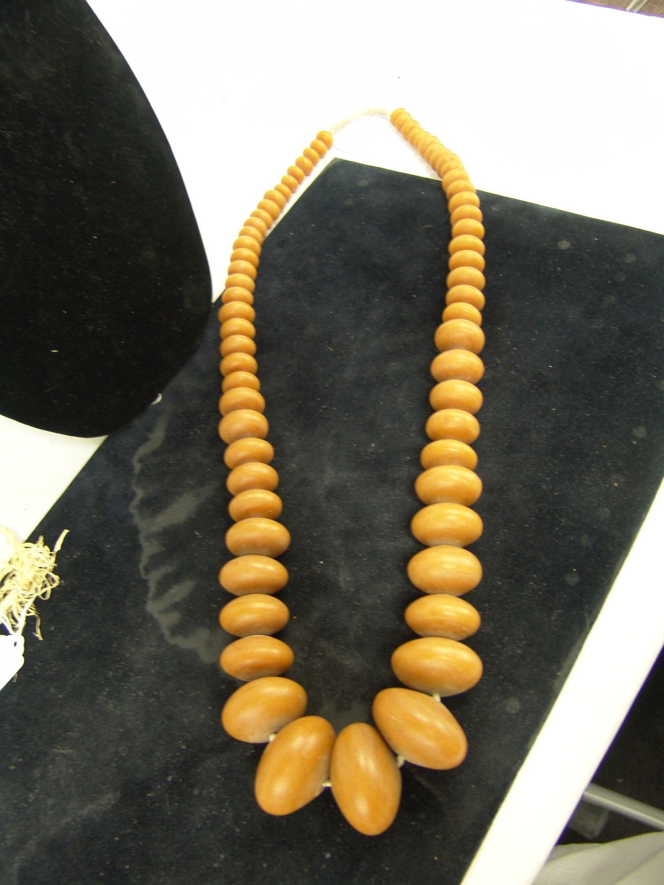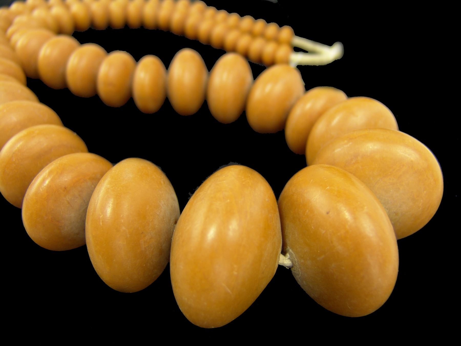 An exceptional extra long (46") strand of the (most popular butterscotch colored) beads ranging in size from 2" x 1-3/8" down to 5/8" x 3/8." These are proudly worn piled on African women as a sign of prosperity. These single beads retail sometimes for nearly $100, and there are (65) on this unusually long strand! Very good condition.,Early/Mid 1900s,46"