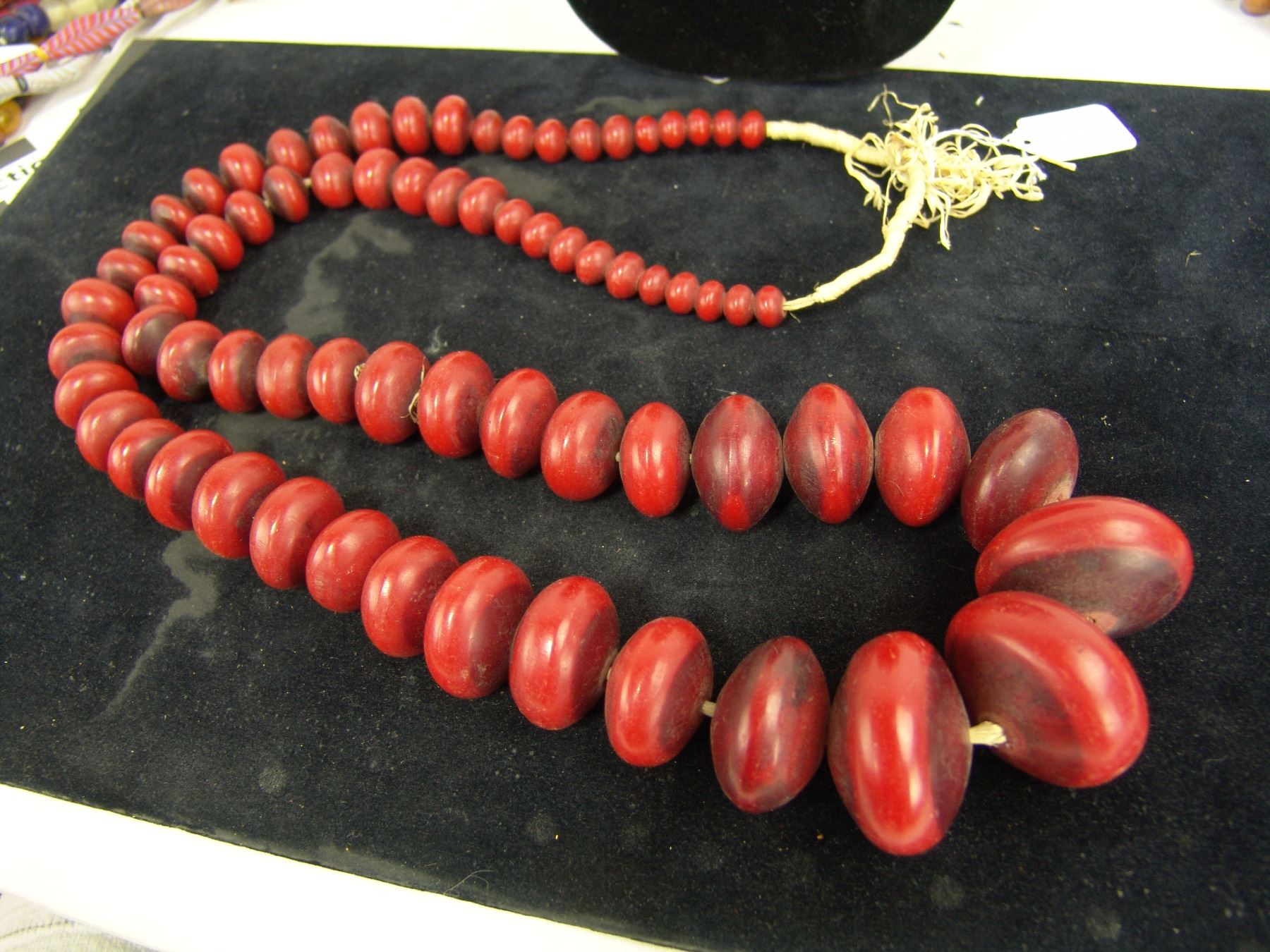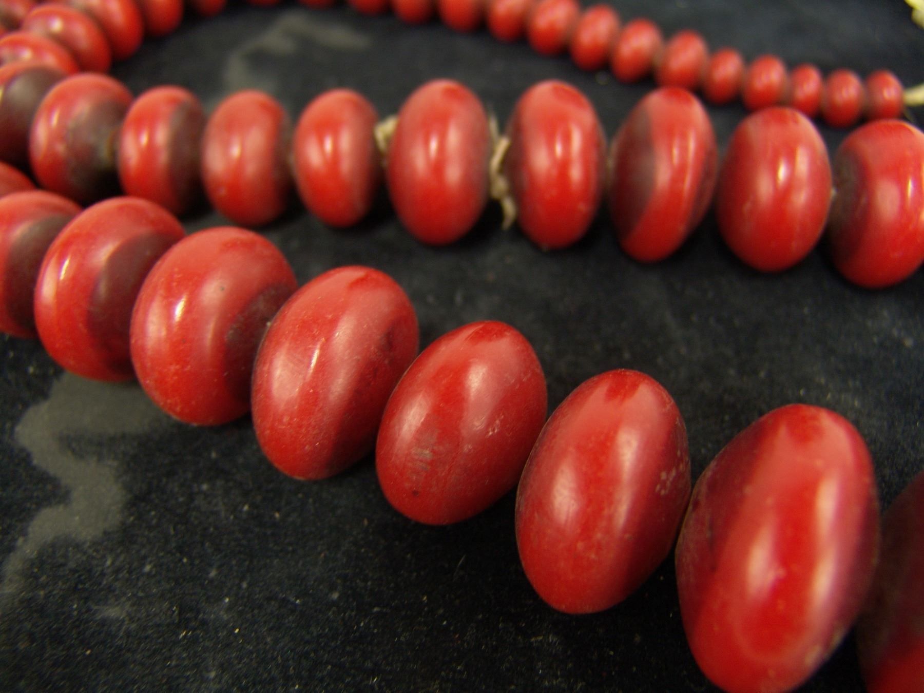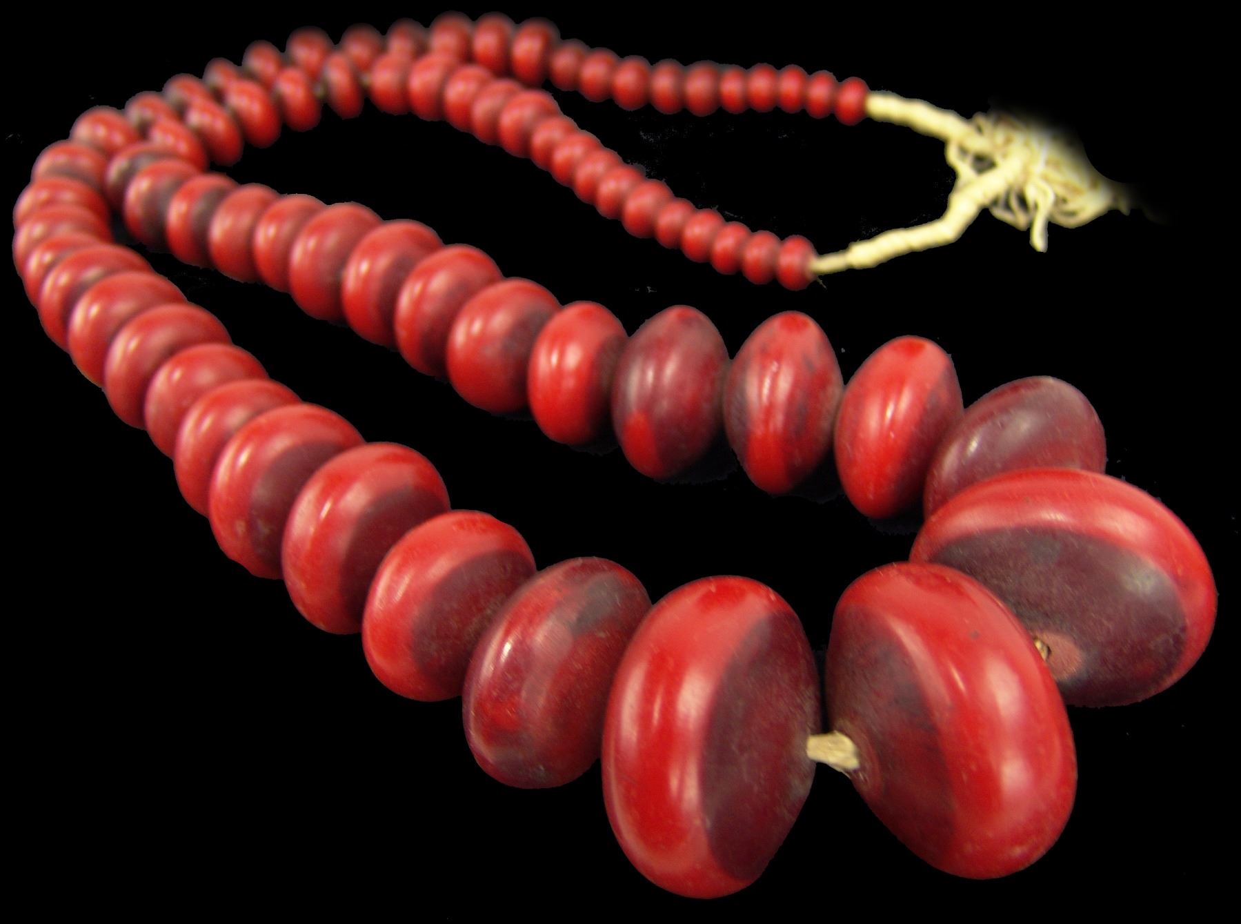 An exceptional long (53") strand of the (very rare deep red colored) beads ranging in size from 2" x 1-3/8" down to 5/8" x 3/8." These are proudly worn piled high African women as a sign of prosperity. These single beads retail sometimes for nearly $100, and there are (71) on this unusually long strand! Very good condition.,Early/Mid 1900s,53"