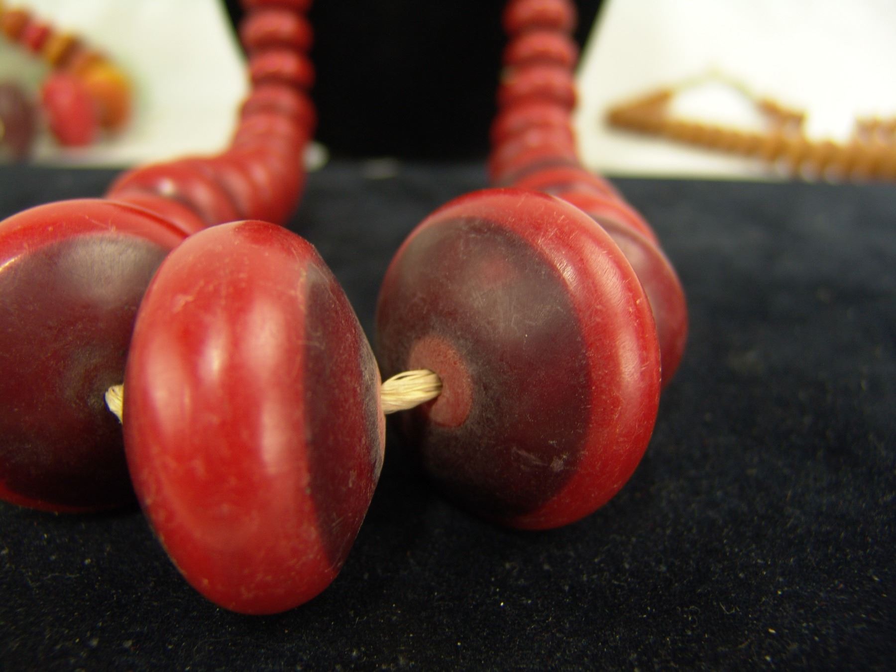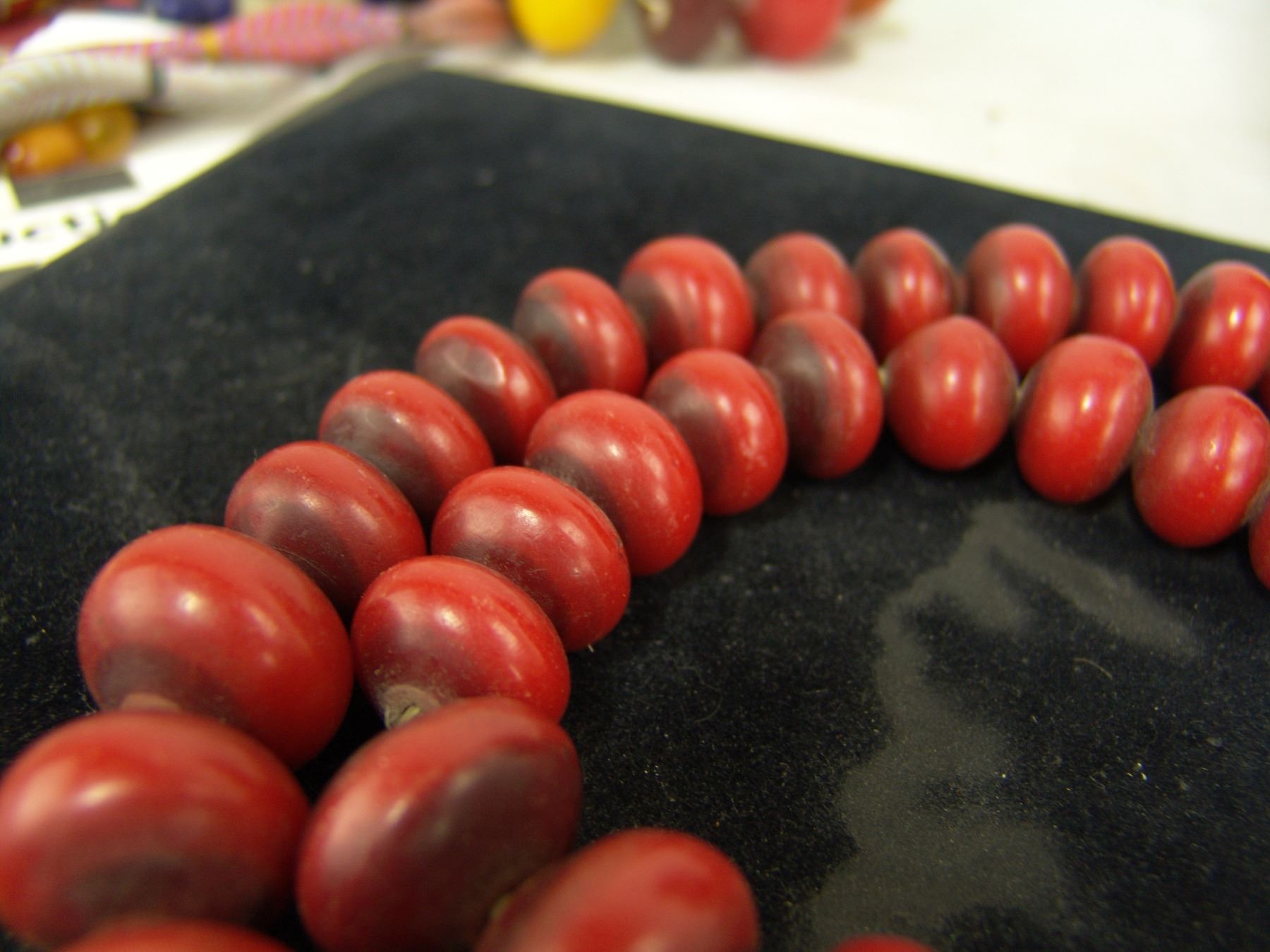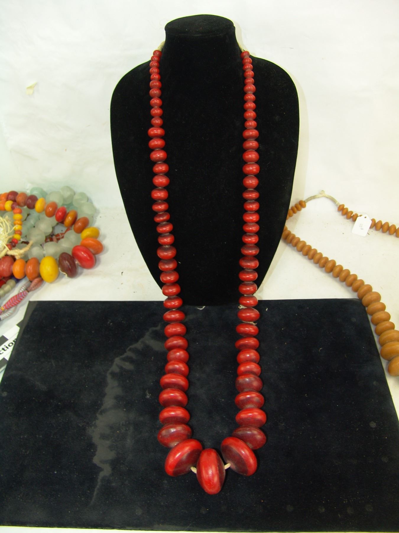 An exceptional long (53") strand of the (very rare deep red colored) beads ranging in size from 2" x 1-3/8" down to 5/8" x 3/8." These are proudly worn piled high African women as a sign of prosperity. These single beads retail sometimes for nearly $100, and there are (71) on this unusually long strand! Very good condition.,Early/Mid 1900s,53"