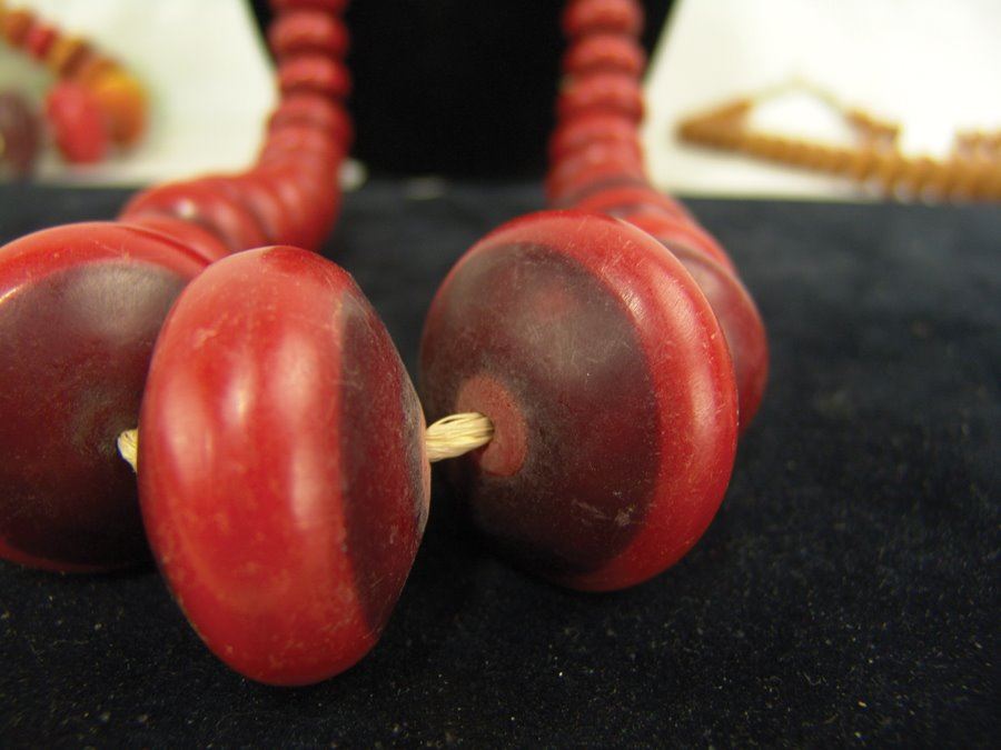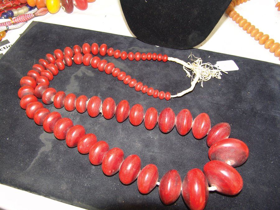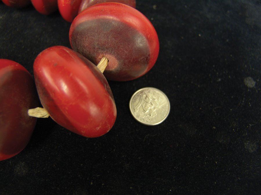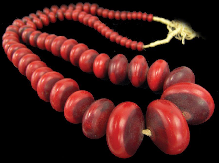 An exceptional, long (53"), strand of the very rare, deep red colored beads ranging in size from 2" x 1-3/8" down to 5/8" x 3/8." These are proudly worn piled high by African women as a sign of prosperity. The largest,Early/Mid 1900s,53"
